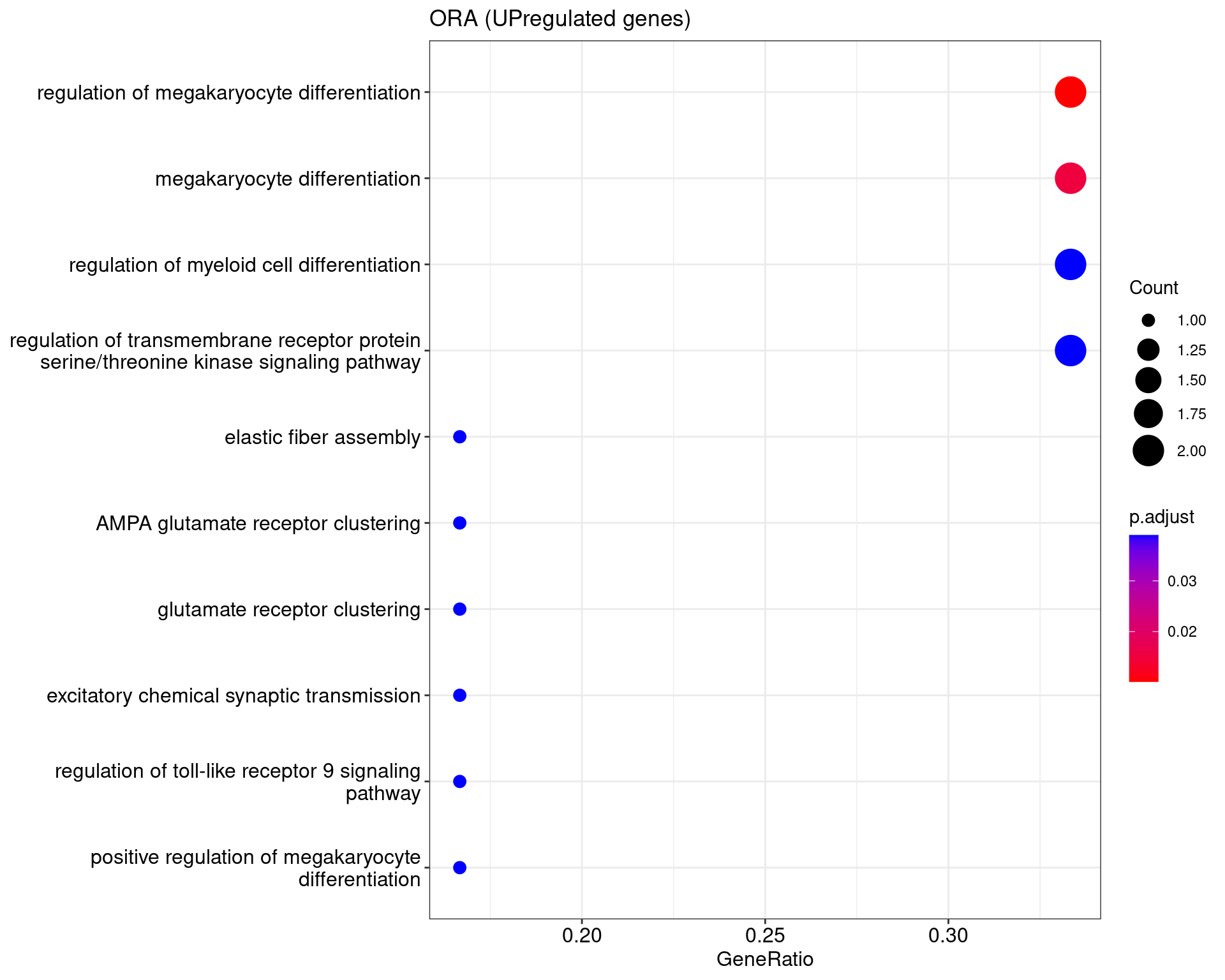We performed a functional enrichment analysis based on Over-Representation Analysis (ORA) using the GO pathway database. Unlike GSEA, which considers the entire ranked list of genes, ORA focuses only on genes that meet specific differential expression thresholds (adjusted p-value and log2 fold change). The analysis was conducted separately for upregulated and downregulated genes to identify GO pathways that are significantly enriched in each group, compared to what would be expected by chance. This allows for a clearer biological interpretation of distinct transcriptional programs activated or suppressed in the dataset. The dot plots below display all significantly enriched GO pathways. Each dot’s size represents the number of differentially expressed genes associated with the pathway, while the color reflects the statistical significance of the enrichment (adjusted p-value).