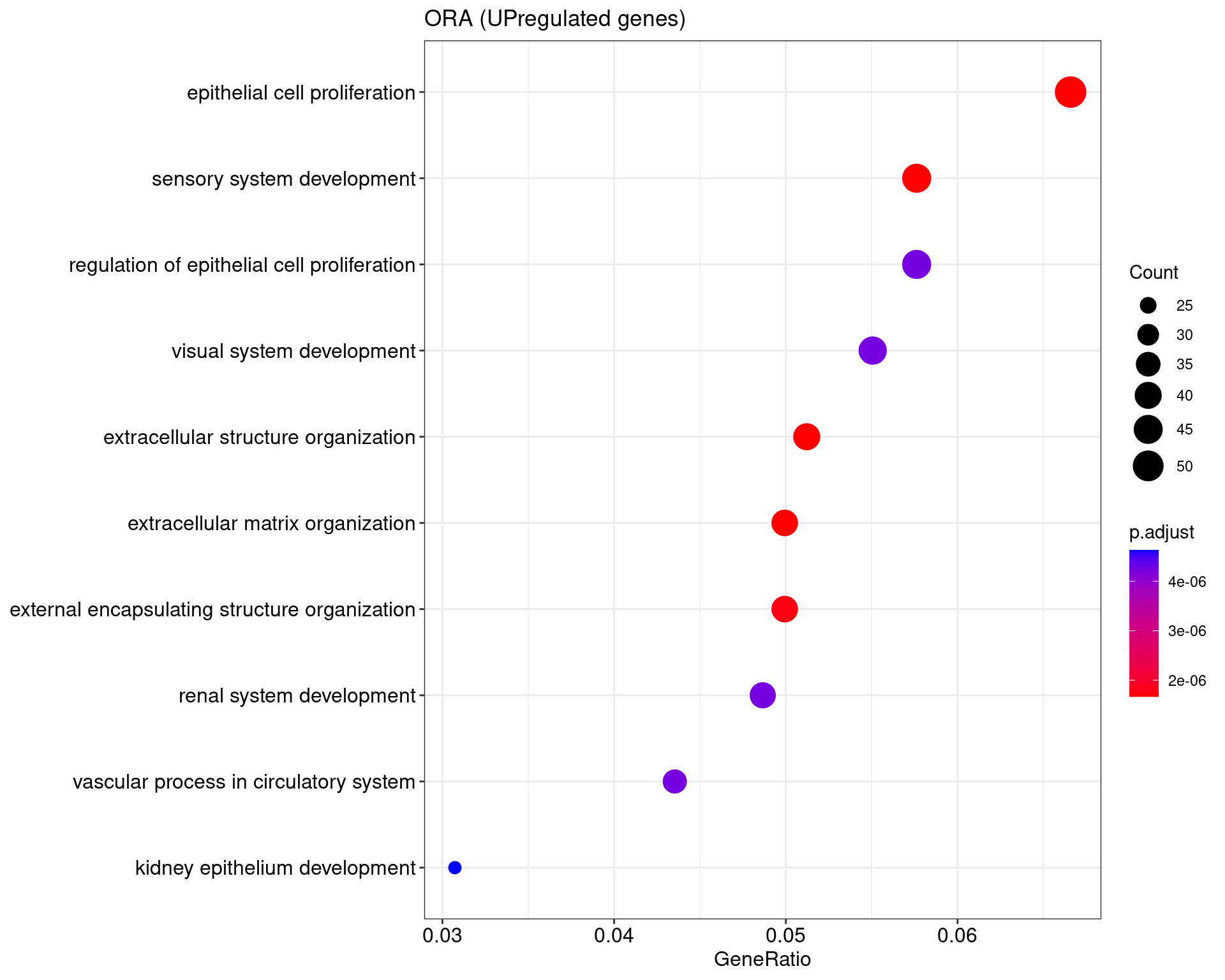 We performed a functional enrichment analysis based on Over-Representation Analysis (ORA) using the GO pathway database. Unlike GSEA, which considers the entire ranked list of genes, ORA focuses only on genes that meet specific differential expression thresholds (adjusted p-value and log2 fold change). The analysis was conducted separately for upregulated and downregulated genes to identify GO pathways that are significantly enriched in each group, compared to what would be expected by chance. This allows for a clearer biological interpretation of distinct transcriptional programs activated or suppressed in the dataset. The dot plots below display all significantly enriched GO pathways. Each dot’s size represents the number of differentially expressed genes associated with the pathway, while the color reflects the statistical significance of the enrichment (adjusted p-value).