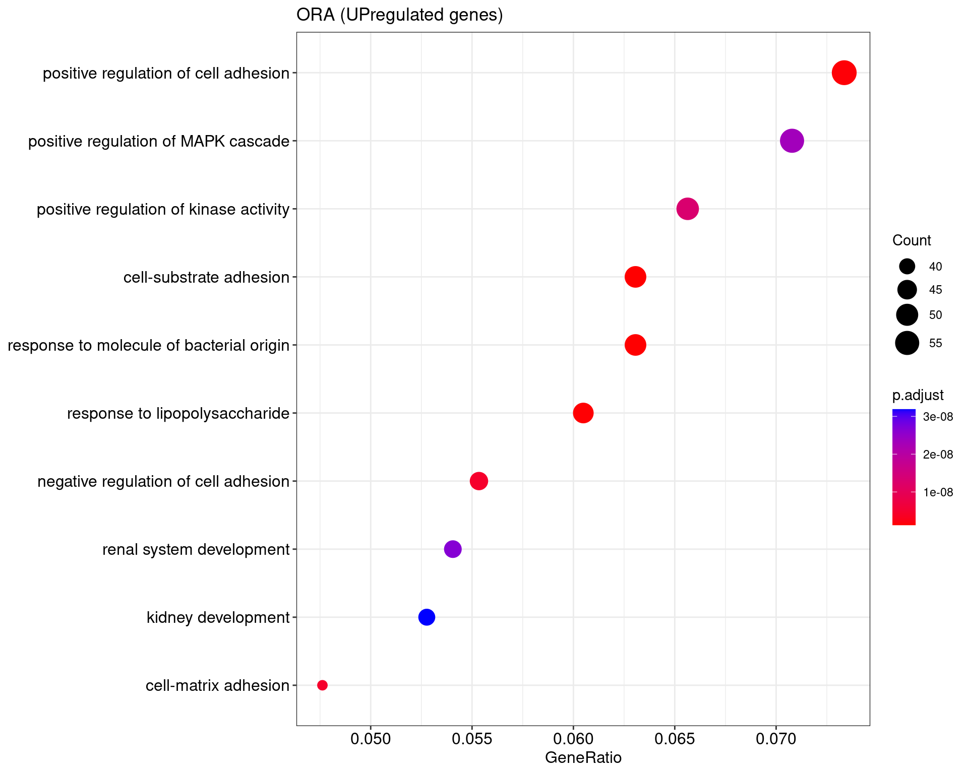 We performed a functional enrichment analysis based on Over-Representation Analysis (ORA) using the GO pathway database. Unlike GSEA, which considers the entire ranked list of genes, ORA focuses only on genes that meet specific differential expression thresholds (adjusted p-value and log2 fold change). The analysis was conducted separately for upregulated and downregulated genes to identify GO pathways that are significantly enriched in each group, compared to what would be expected by chance. This allows for a clearer biological interpretation of distinct transcriptional programs activated or suppressed in the dataset. The dot plots below display all significantly enriched GO pathways. Each dot’s size represents the number of differentially expressed genes associated with the pathway, while the color reflects the statistical significance of the enrichment (adjusted p-value).