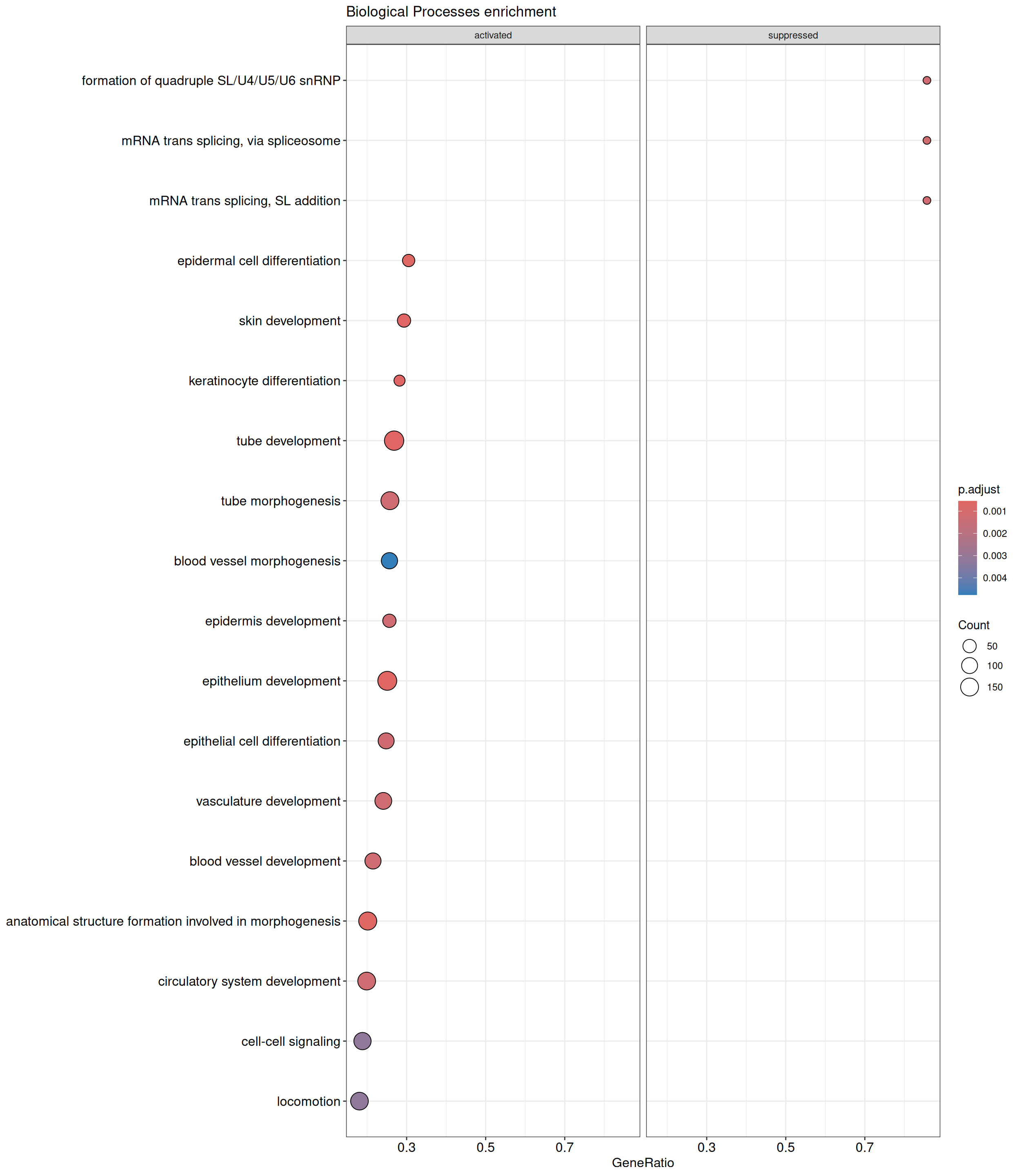 We performed a functional enrichment analysis based on Over-Representation Analysis (ORA) using the GO pathway database. Unlike GSEA, which considers the entire ranked list of genes, ORA focuses only on genes that meet specific differential expression thresholds (adjusted p-value and log2 fold change). The analysis was conducted separately for upregulated and downregulated genes to identify GO pathways that are significantly enriched in each group, compared to what would be expected by chance. This allows for a clearer biological interpretation of distinct transcriptional programs activated or suppressed in the dataset. The dot plots below display all significantly enriched GO pathways. Each dot’s size represents the number of differentially expressed genes associated with the pathway, while the color reflects the statistical significance of the enrichment (adjusted p-value).