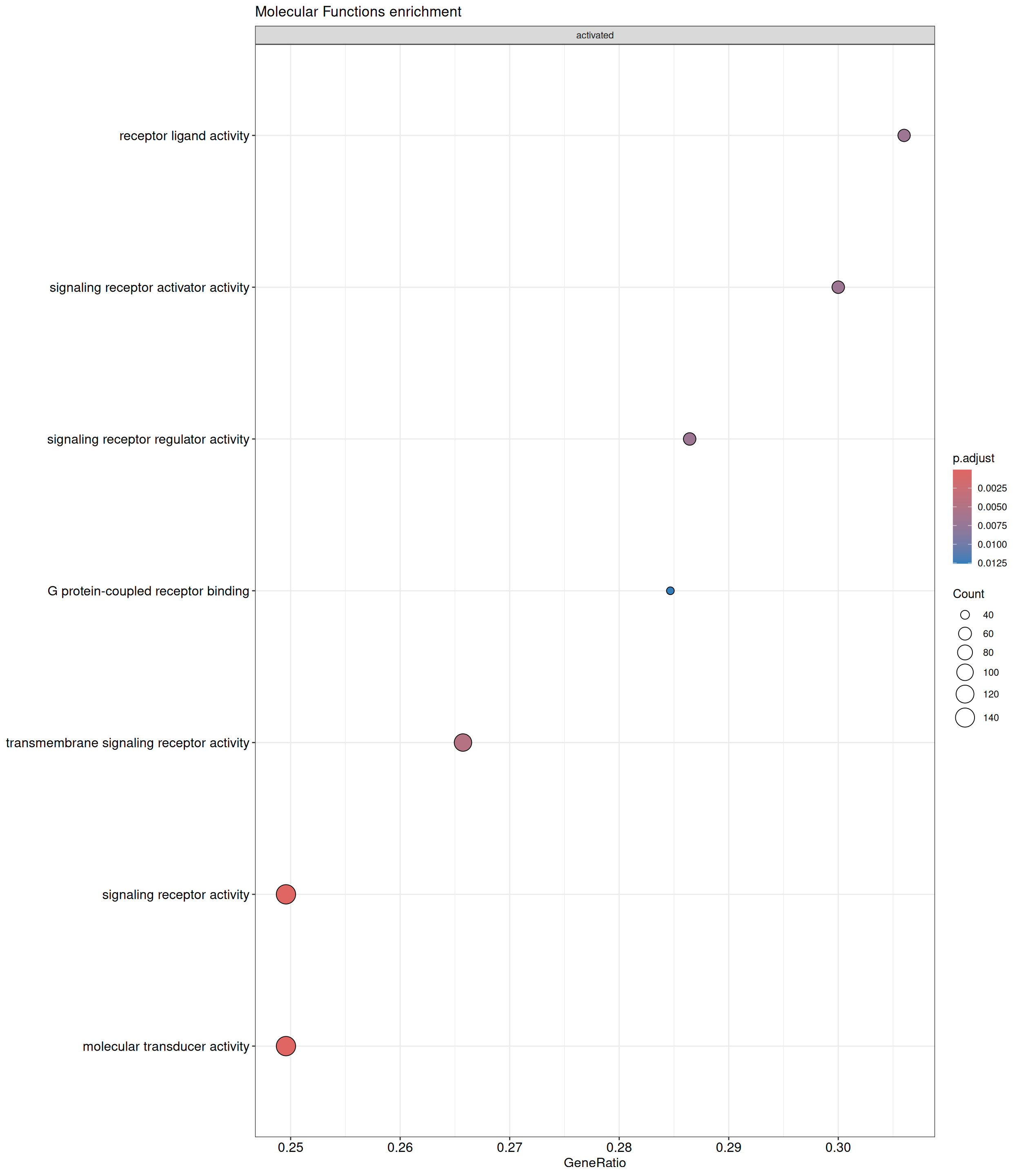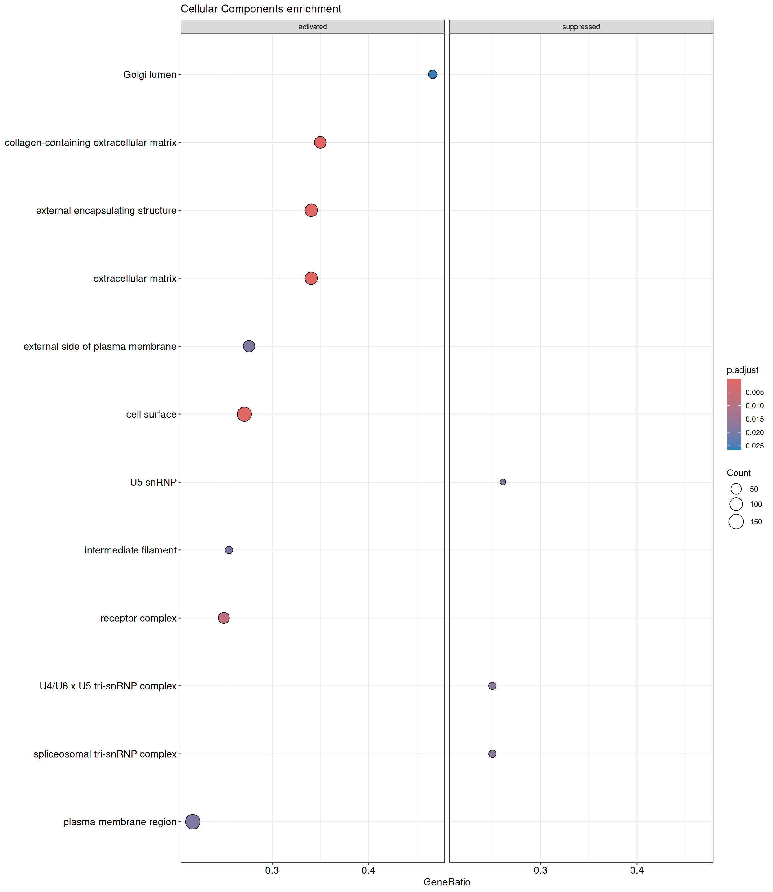 Further analysis is done through gene set enrichment analysis, which does not exclude genes based on logfc or adjusted p-value, as done previously. GSEA is performed separately on each subontology: biological processes (BP), cellular components (CC) and molecular functions (MF). The dot plot below shows all the enriched GO terms. The size of each dot correlates with the count of differentially expressed genes associated with each GO term. Furthermore, the color of each dot reflects the significance of the enrichment of the respective GO term, highlighting its relative importance.