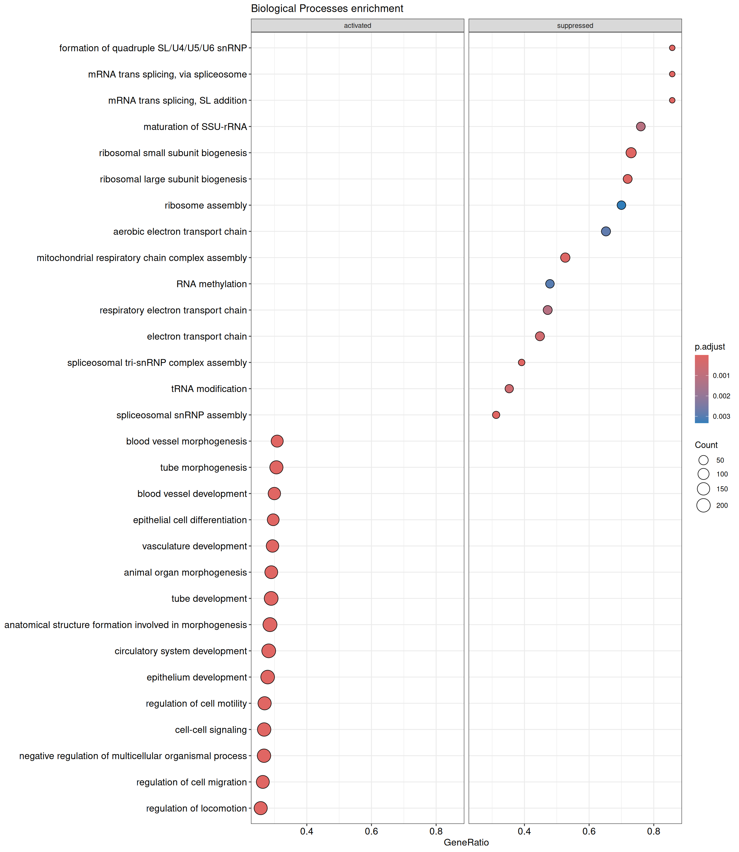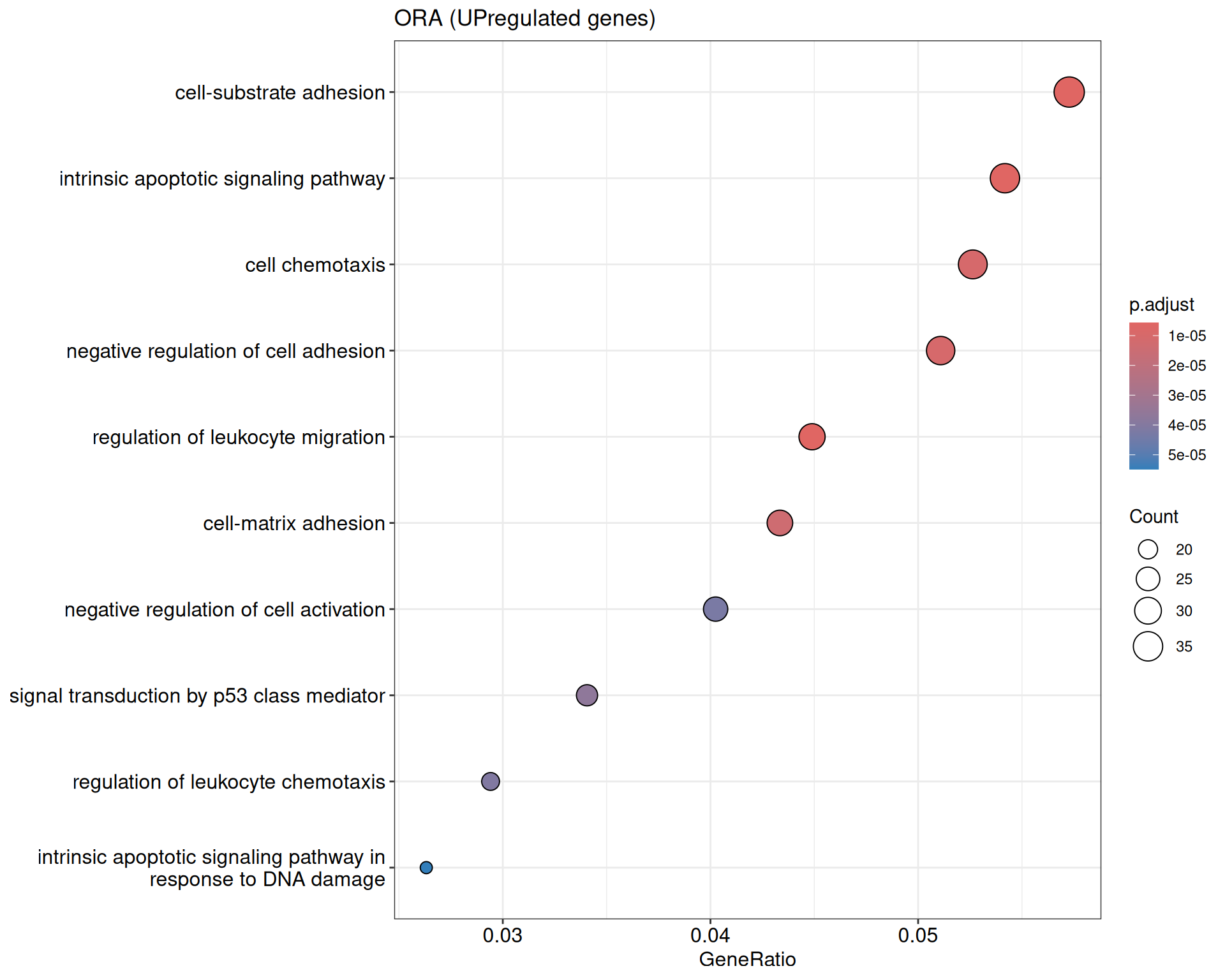 We performed a functional enrichment analysis based on Over-Representation Analysis (ORA) using the GO pathway database. Unlike GSEA, which considers the entire ranked list of genes, ORA focuses only on genes that meet specific differential expression thresholds (adjusted p-value and log2 fold change). The analysis was conducted separately for upregulated and downregulated genes to identify GO pathways that are significantly enriched in each group, compared to what would be expected by chance. This allows for a clearer biological interpretation of distinct transcriptional programs activated or suppressed in the dataset. The dot plots below display all significantly enriched GO pathways. Each dot’s size represents the number of differentially expressed genes associated with the pathway, while the color reflects the statistical significance of the enrichment (adjusted p-value).