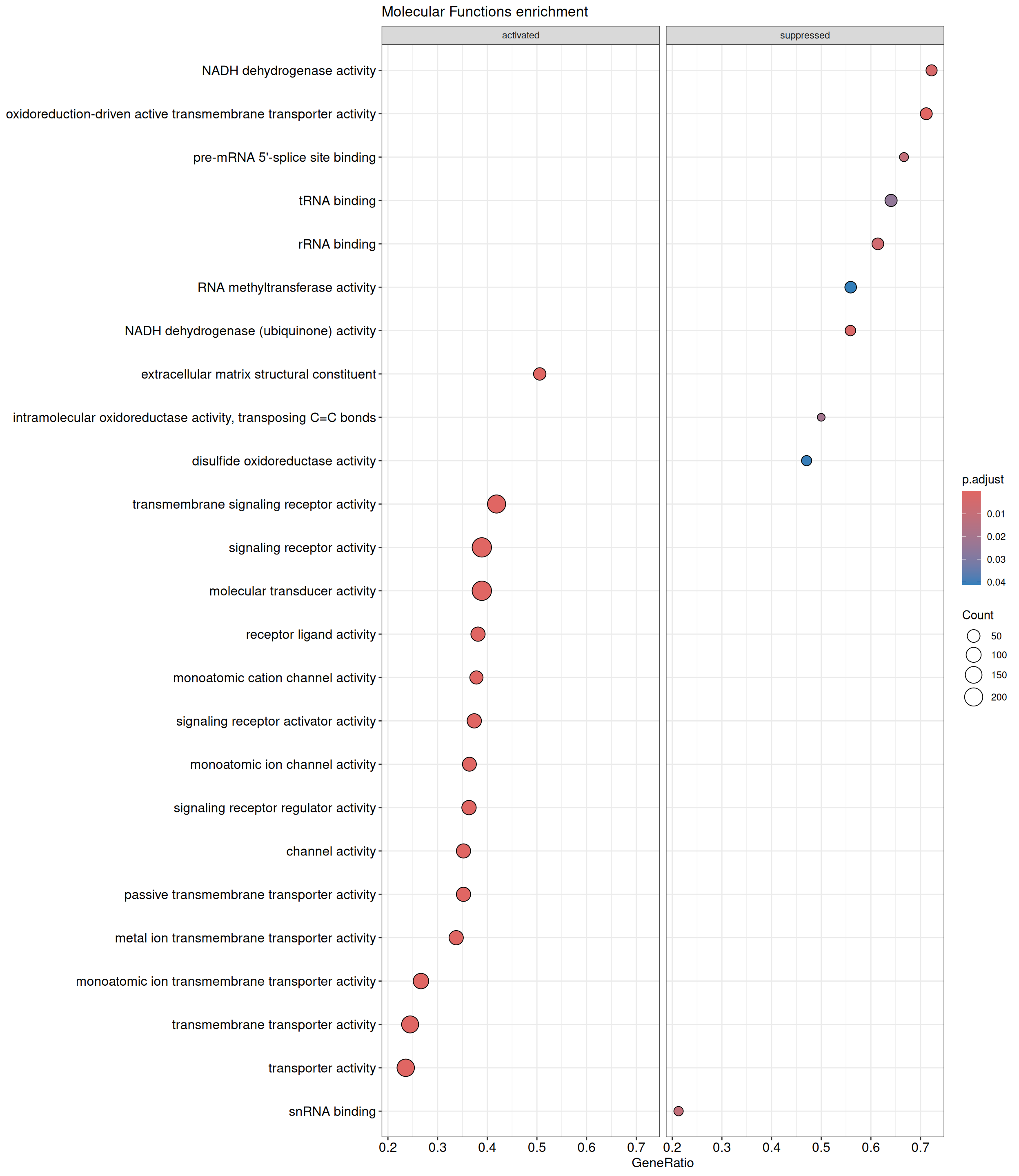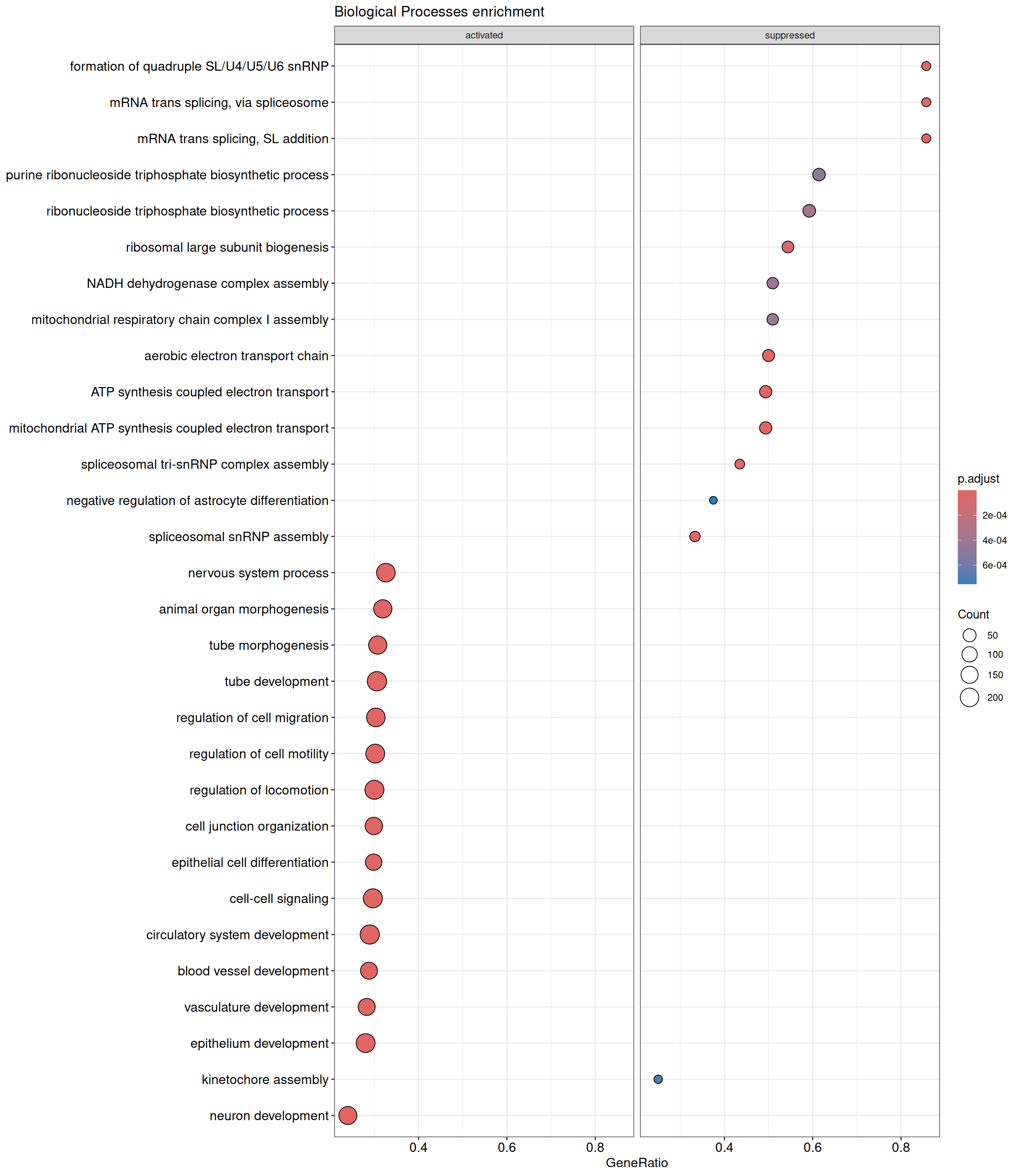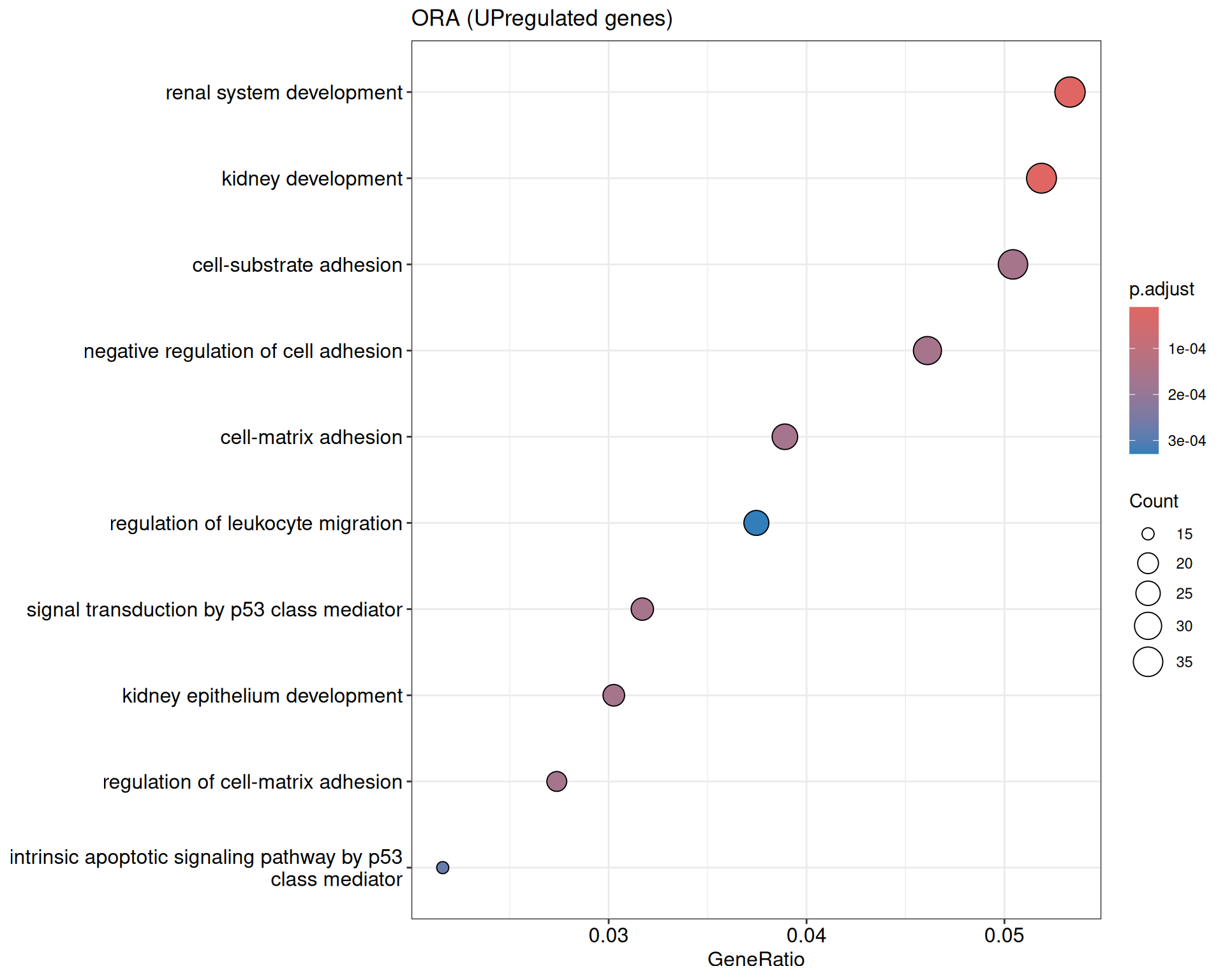 We performed a functional enrichment analysis based on Over-Representation Analysis (ORA) using the GO pathway database. Unlike GSEA, which considers the entire ranked list of genes, ORA focuses only on genes that meet specific differential expression thresholds (adjusted p-value and log2 fold change). The analysis was conducted separately for upregulated and downregulated genes to identify GO pathways that are significantly enriched in each group, compared to what would be expected by chance. This allows for a clearer biological interpretation of distinct transcriptional programs activated or suppressed in the dataset. The dot plots below display all significantly enriched GO pathways. Each dot’s size represents the number of differentially expressed genes associated with the pathway, while the color reflects the statistical significance of the enrichment (adjusted p-value).