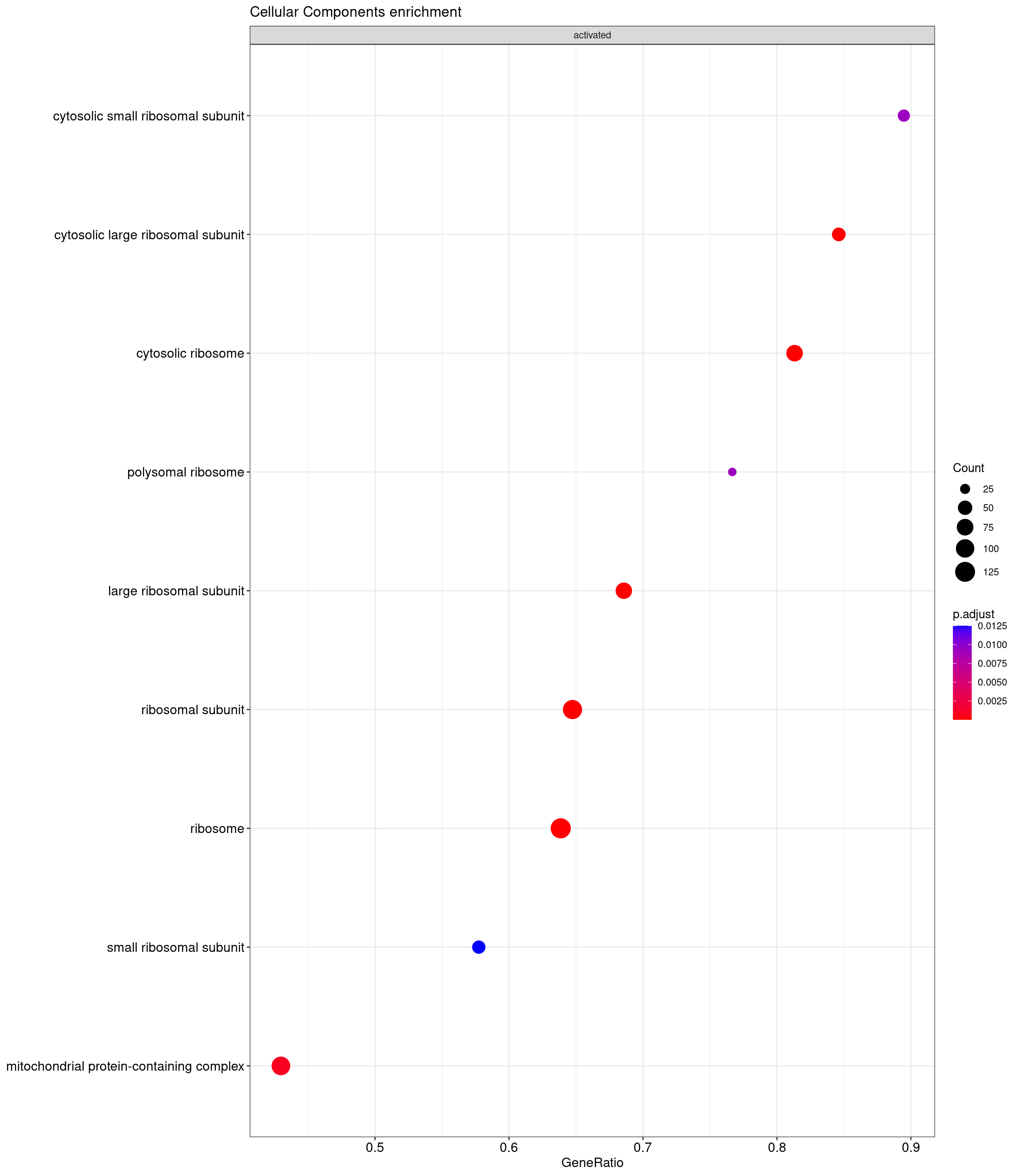 Further analysis is done through gene set enrichment analysis, which does not exclude genes based on logfc or adjusted p-value, as done previously. GSEA is performed separately on each subontology: biological processes (BP), cellular components (CC) and molecular functions (MF). The dot plot below shows all the enriched GO terms. The size of each dot correlates with the count of differentially expressed genes associated with each GO term. Furthermore, the color of each dot reflects the significance of the enrichment of the respective GO term, highlighting its relative importance.