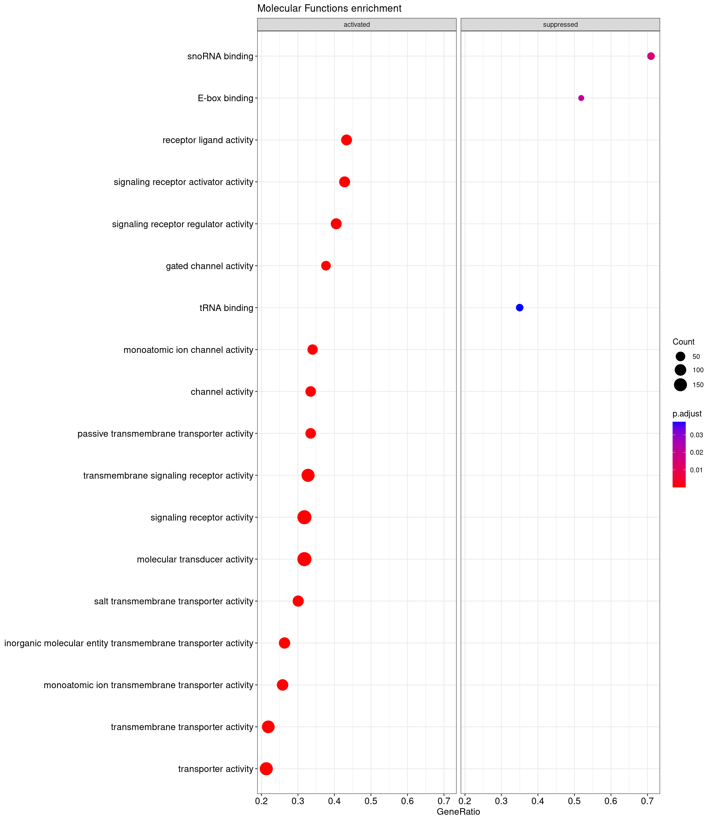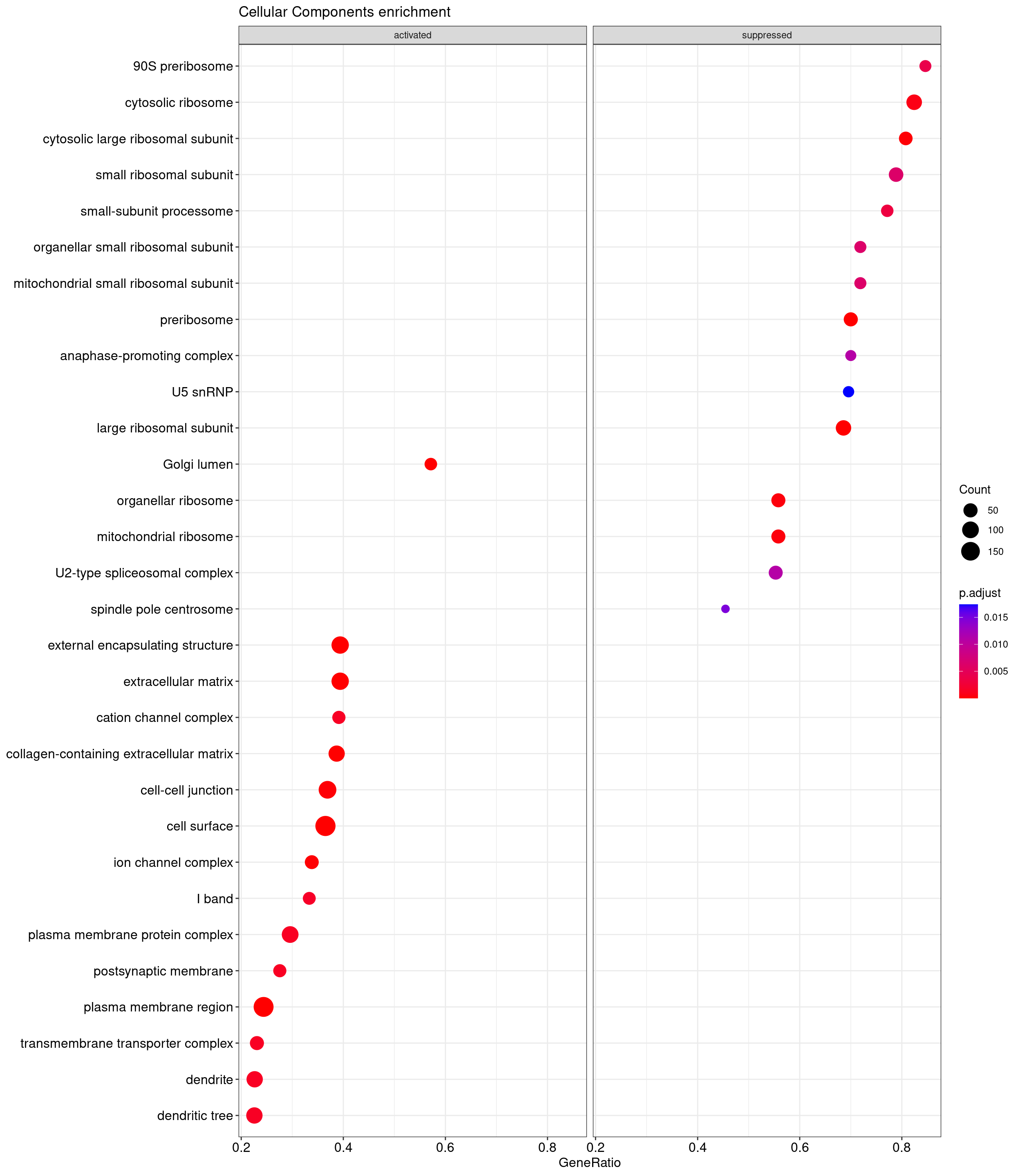 Further analysis is done through gene set enrichment analysis, which does not exclude genes based on logfc or adjusted p-value, as done previously. GSEA is performed separately on each subontology: biological processes (BP), cellular components (CC) and molecular functions (MF). The dot plot below shows all the enriched GO terms. The size of each dot correlates with the count of differentially expressed genes associated with each GO term. Furthermore, the color of each dot reflects the significance of the enrichment of the respective GO term, highlighting its relative importance.