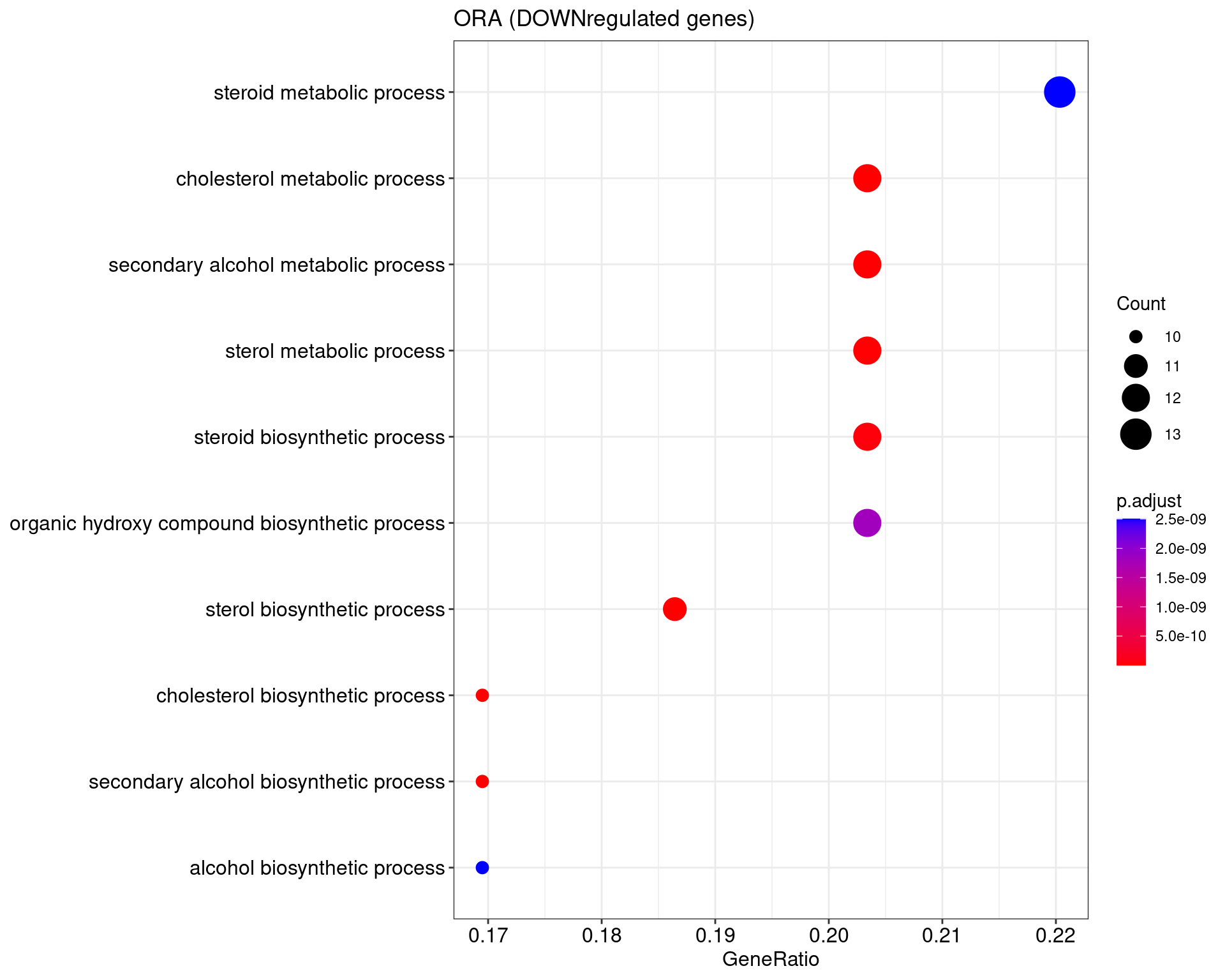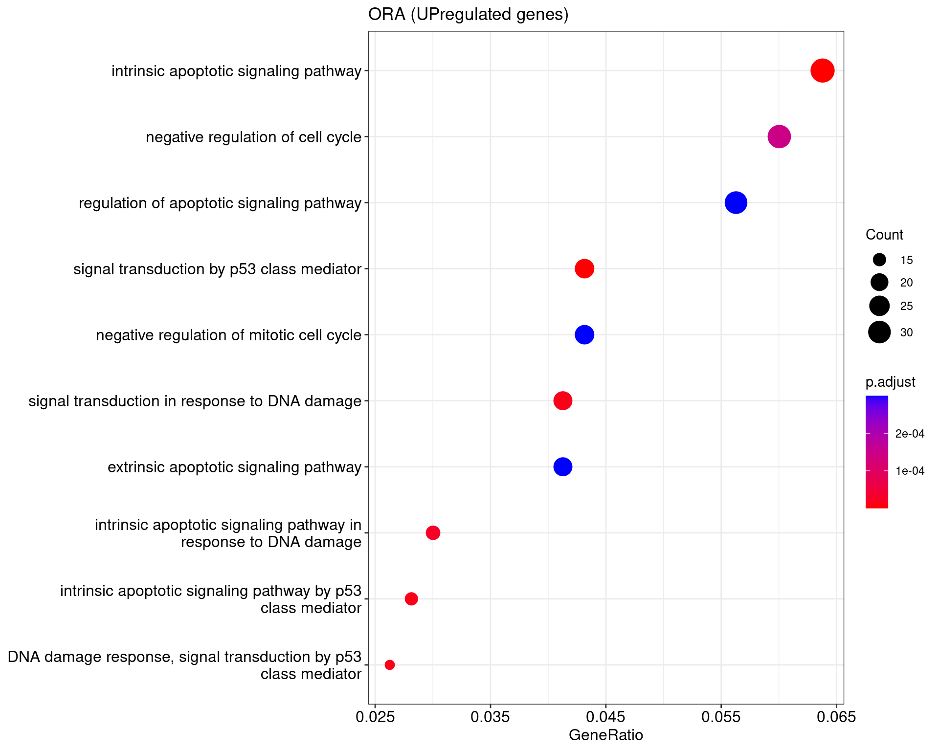 We performed a functional enrichment analysis based on Over-Representation Analysis (ORA) using the GO pathway database. Unlike GSEA, which considers the entire ranked list of genes, ORA focuses only on genes that meet specific differential expression thresholds (adjusted p-value and log2 fold change). The analysis was conducted separately for upregulated and downregulated genes to identify GO pathways that are significantly enriched in each group, compared to what would be expected by chance. This allows for a clearer biological interpretation of distinct transcriptional programs activated or suppressed in the dataset. The dot plots below display all significantly enriched GO pathways. Each dot’s size represents the number of differentially expressed genes associated with the pathway, while the color reflects the statistical significance of the enrichment (adjusted p-value).
