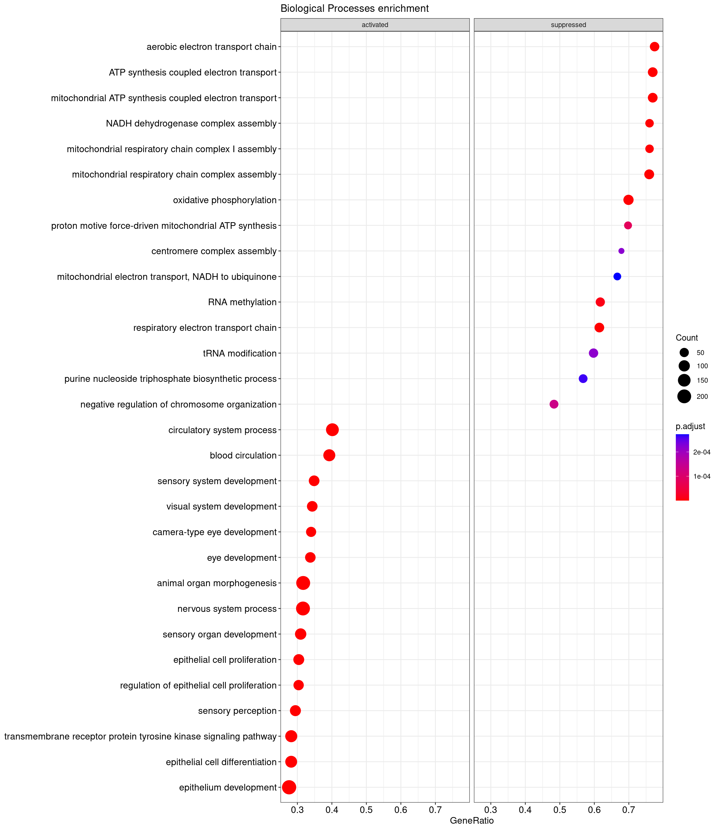 We performed a functional enrichment analysis based on Over-Representation Analysis (ORA) using the GO pathway database. Unlike GSEA, which considers the entire ranked list of genes, ORA focuses only on genes that meet specific differential expression thresholds (adjusted p-value and log2 fold change). The analysis was conducted separately for upregulated and downregulated genes to identify GO pathways that are significantly enriched in each group, compared to what would be expected by chance. This allows for a clearer biological interpretation of distinct transcriptional programs activated or suppressed in the dataset. The dot plots below display all significantly enriched GO pathways. Each dot’s size represents the number of differentially expressed genes associated with the pathway, while the color reflects the statistical significance of the enrichment (adjusted p-value).