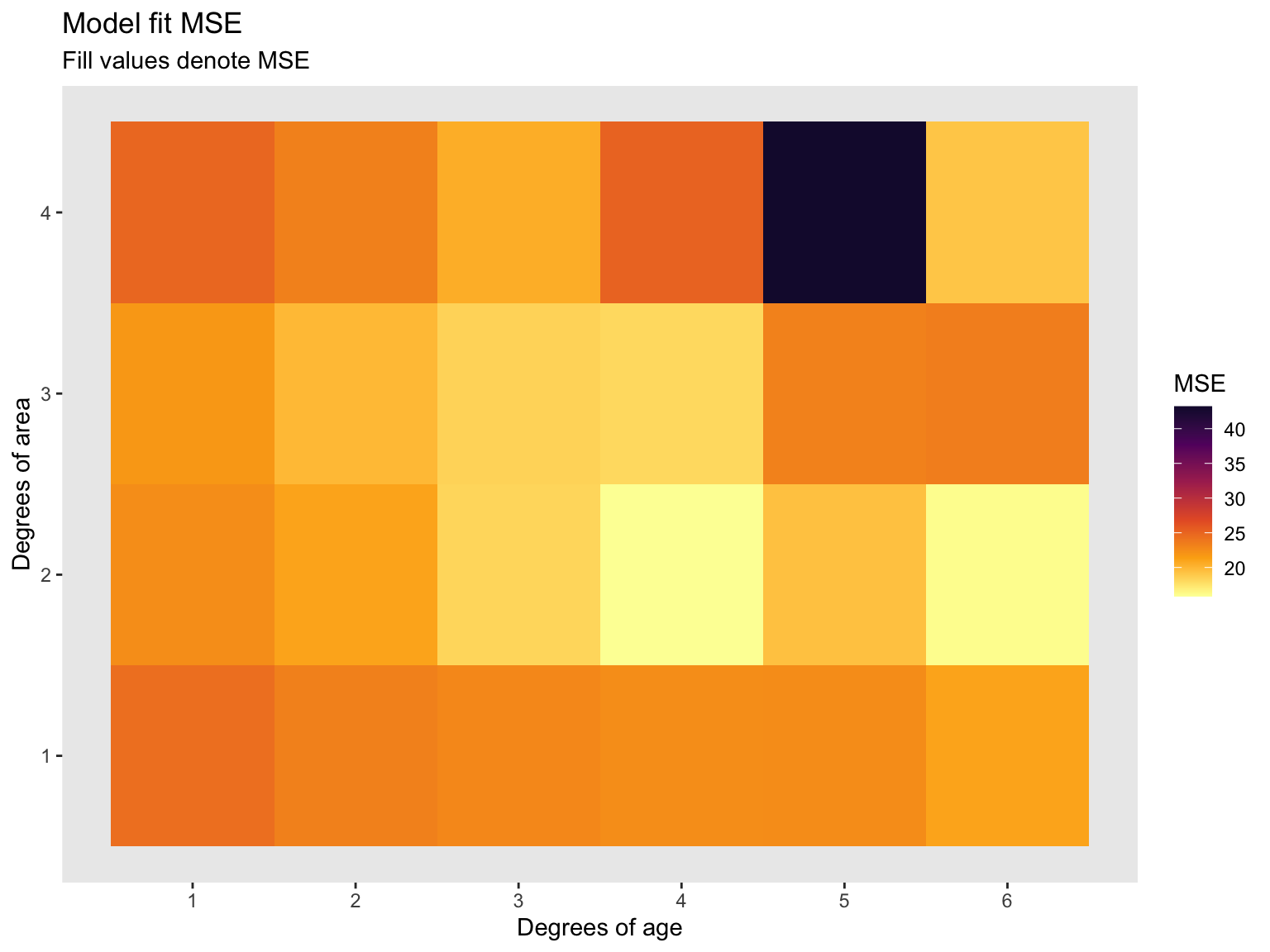 These arguments represent the degree of polynomial for age and area that we want to fit our model.