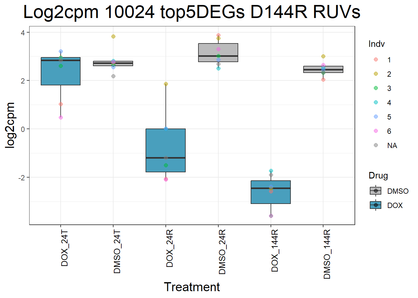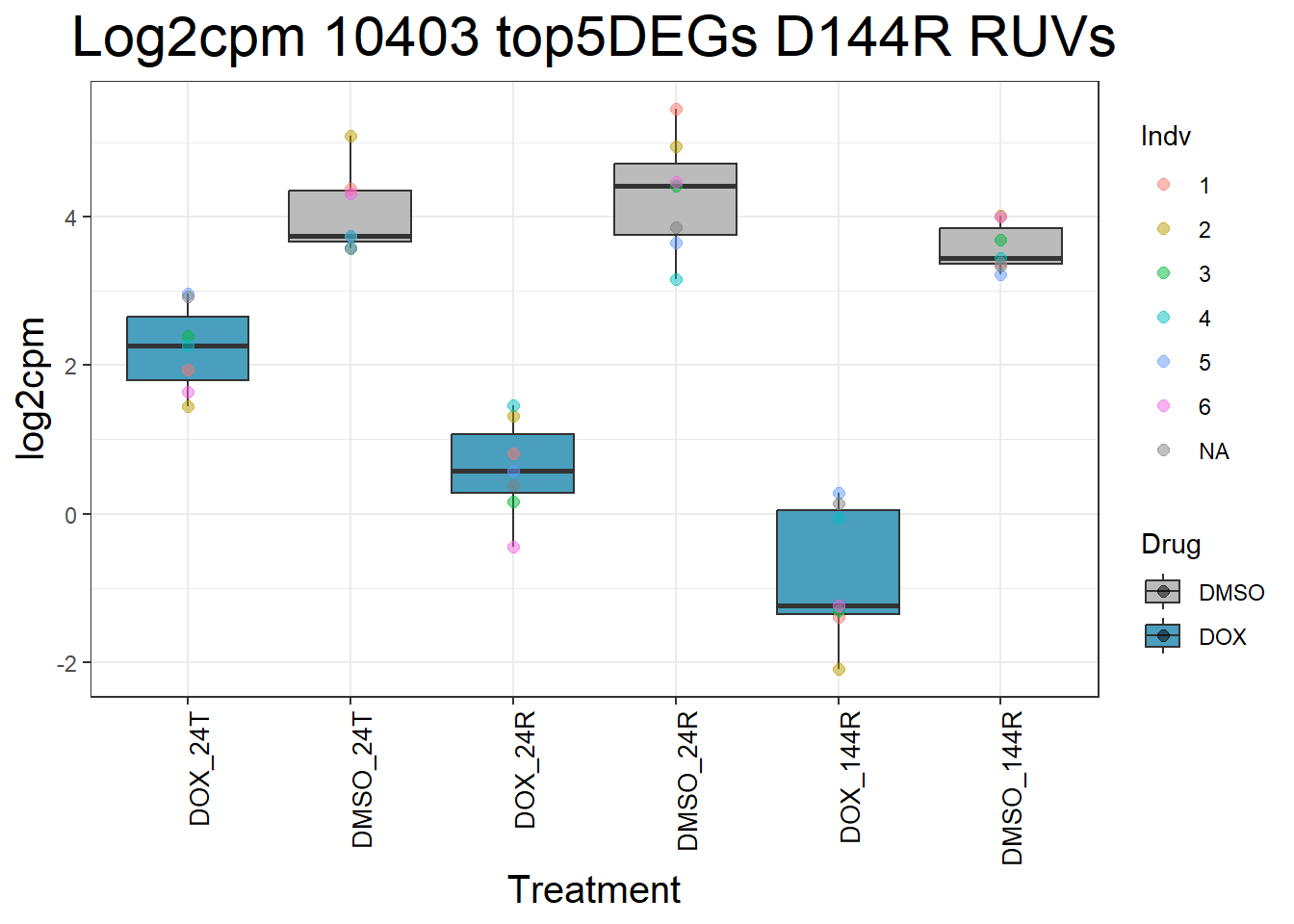ggtitle(paste("Log2cpm", gene, "top5DEGs D144R RUVs")) +