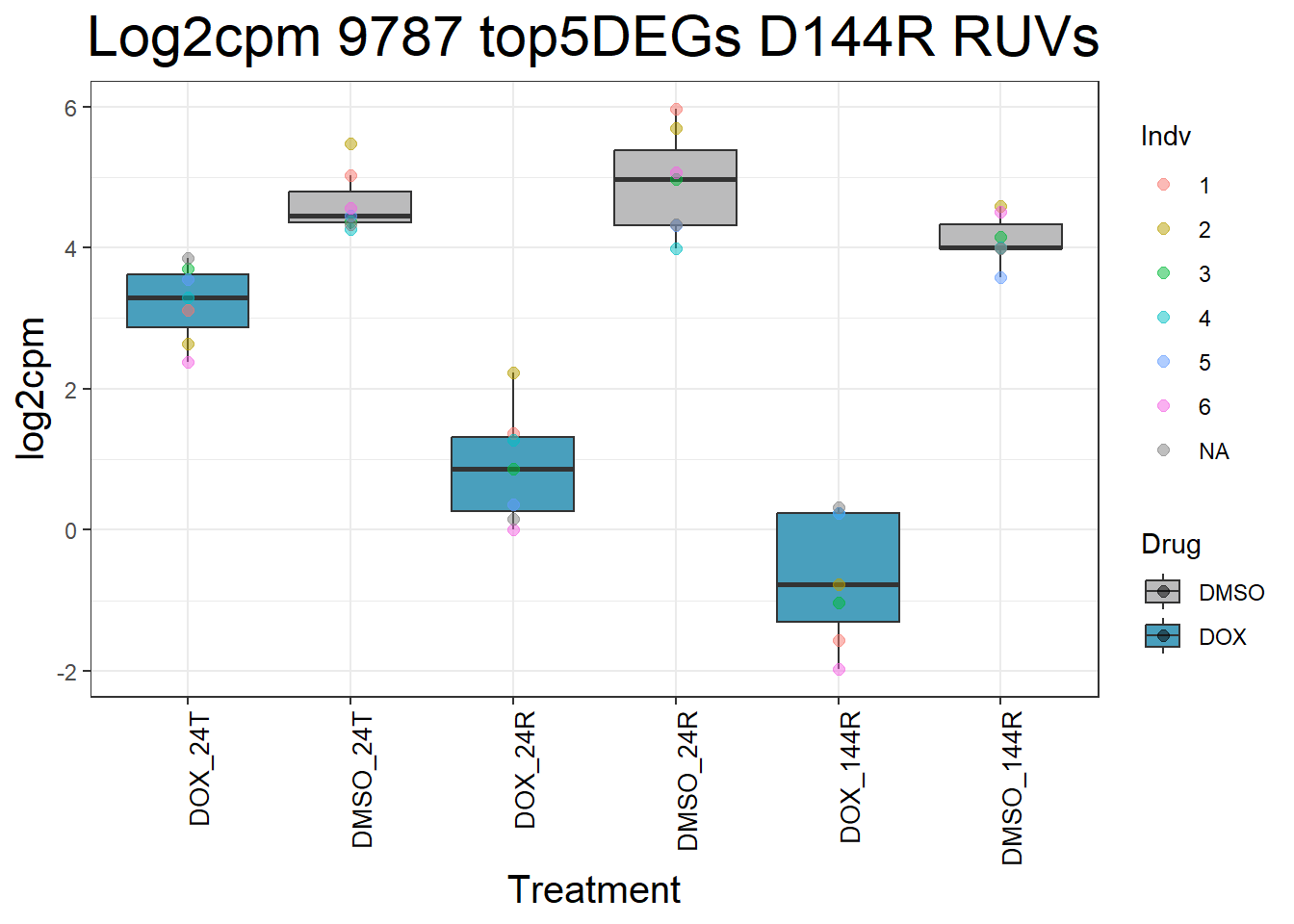 ggtitle(paste("Log2cpm", gene, "top5DEGs D144R RUVs")) +