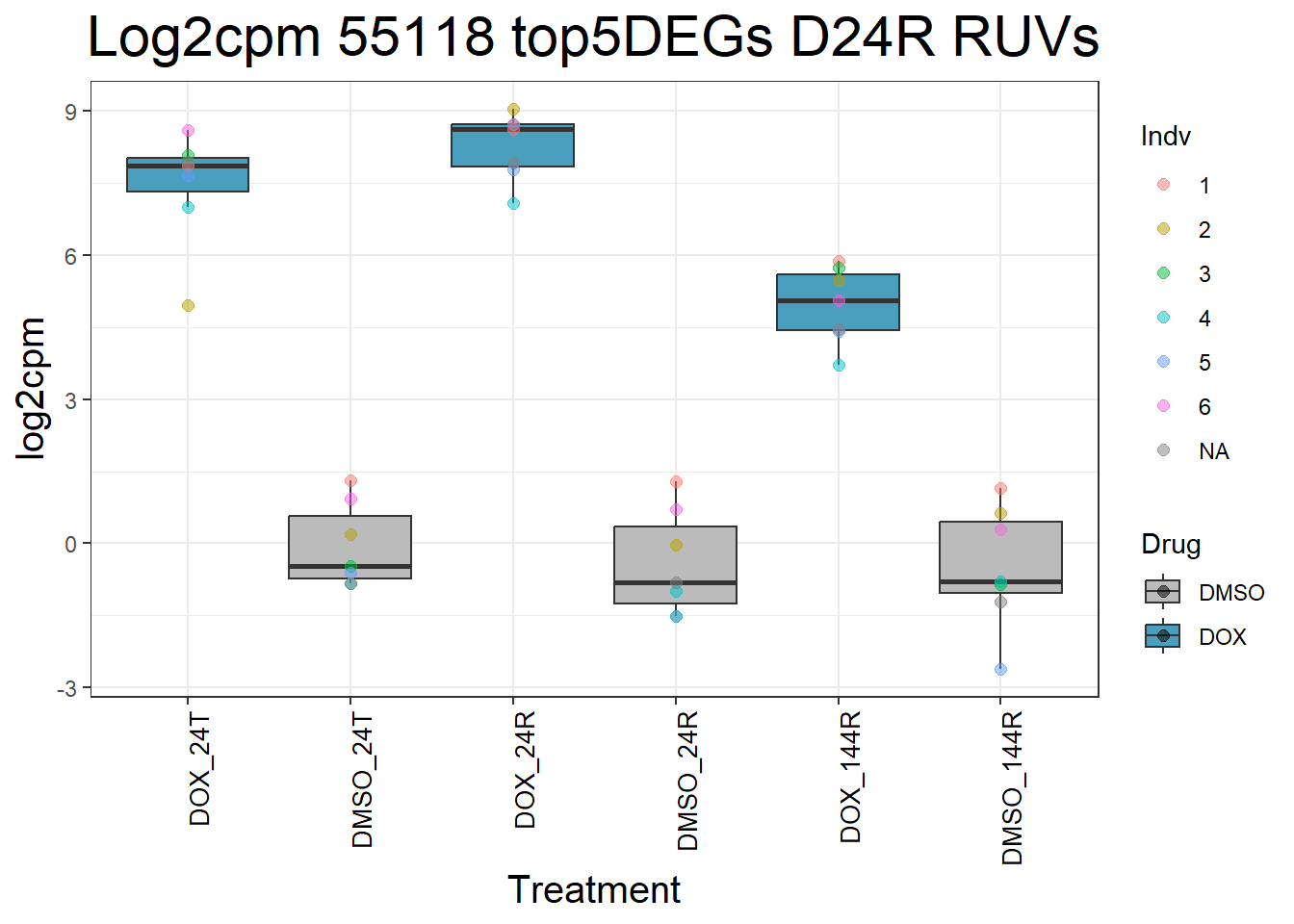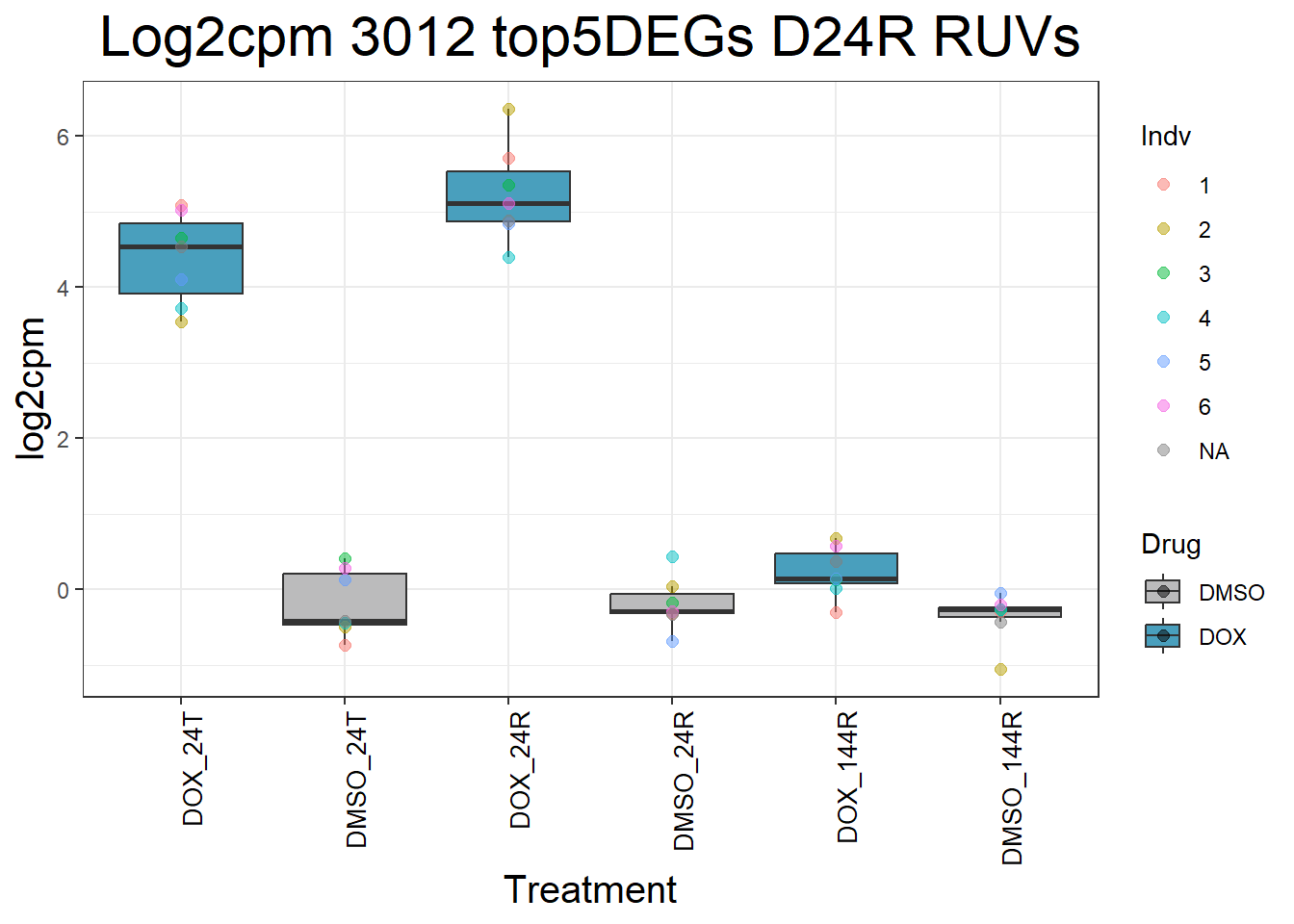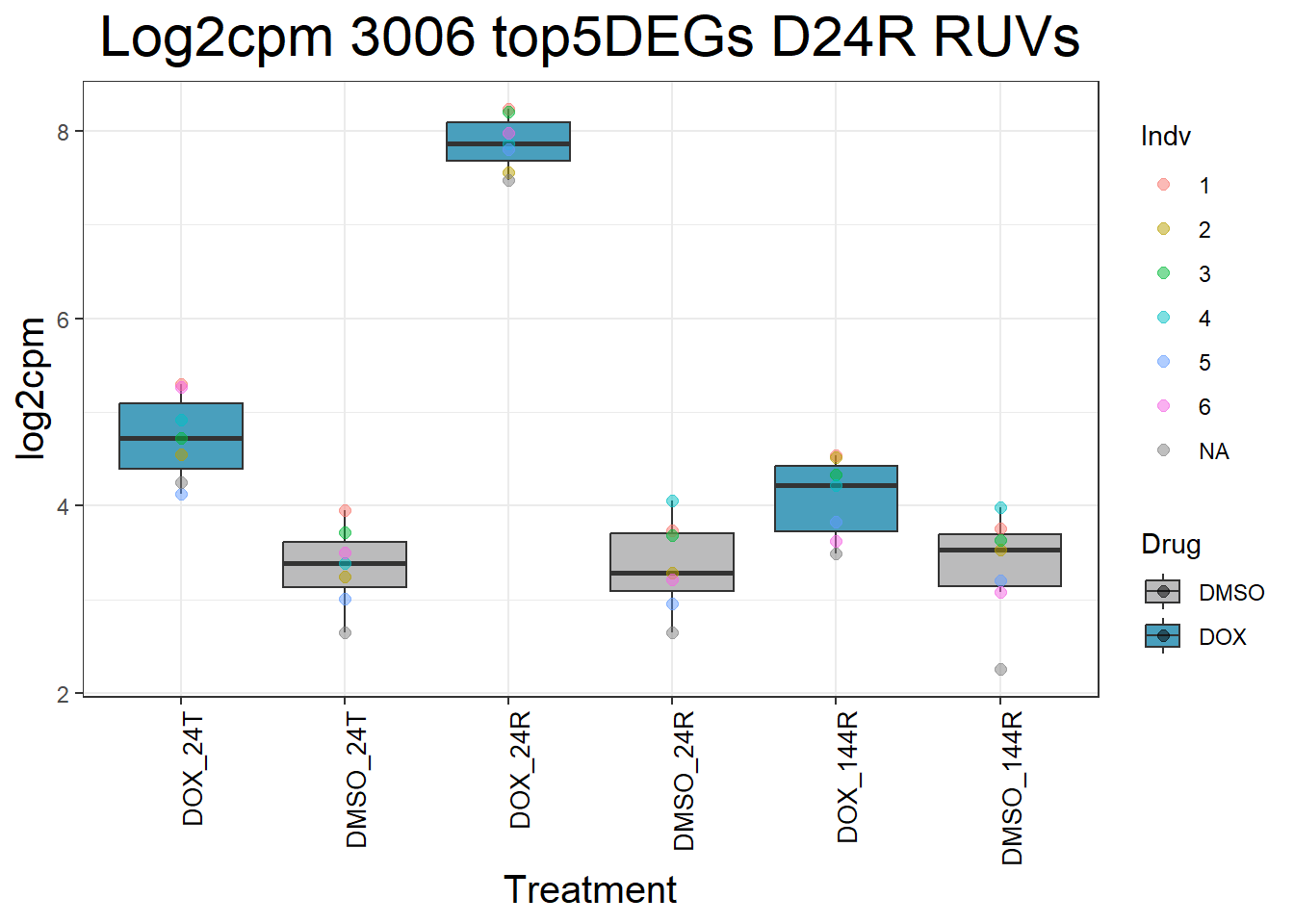 ggtitle(paste("Log2cpm", gene, "top5DEGs D24R RUVs")) +