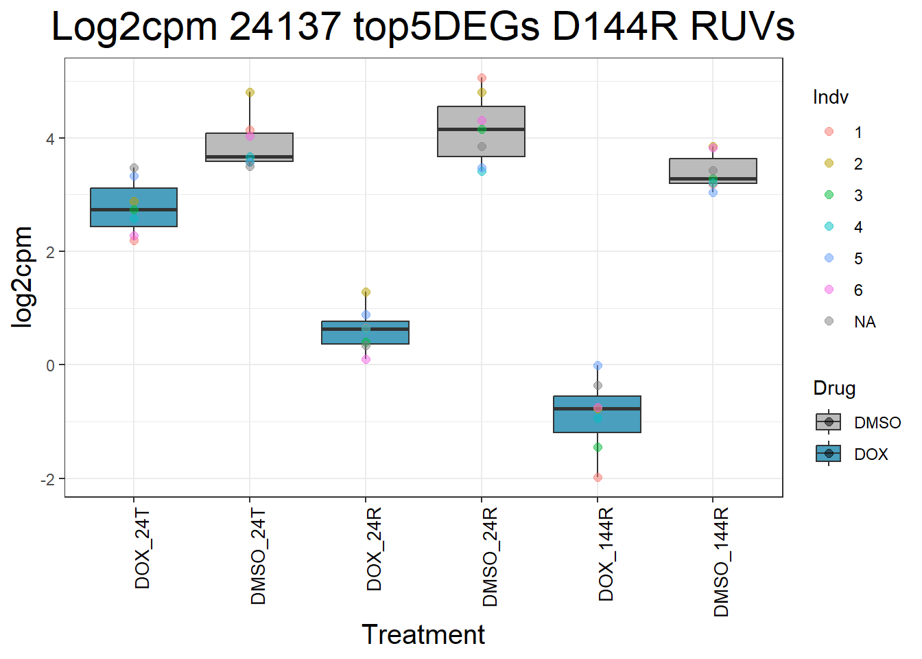 ggtitle(paste("Log2cpm", gene, "top5DEGs D144R RUVs")) +