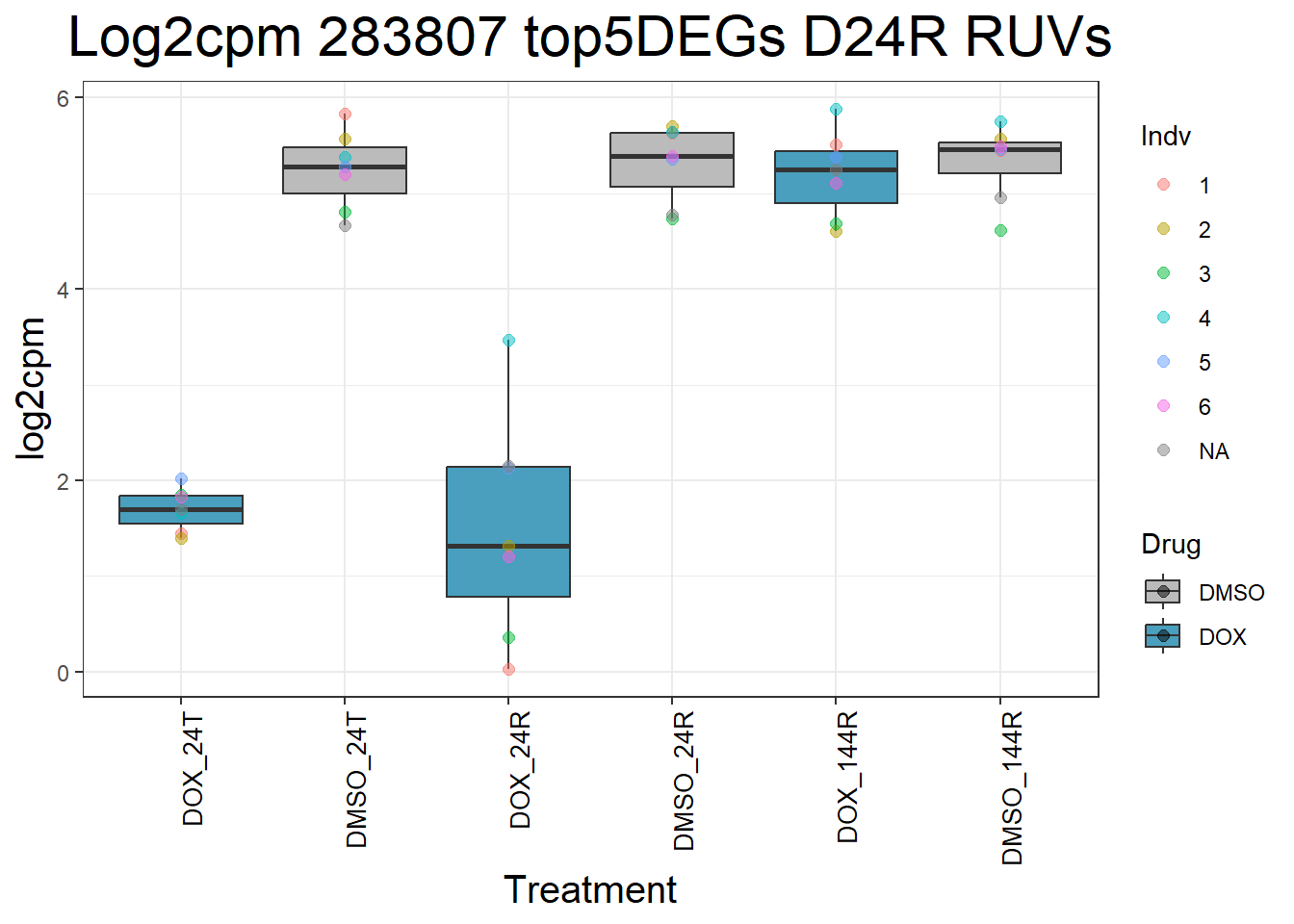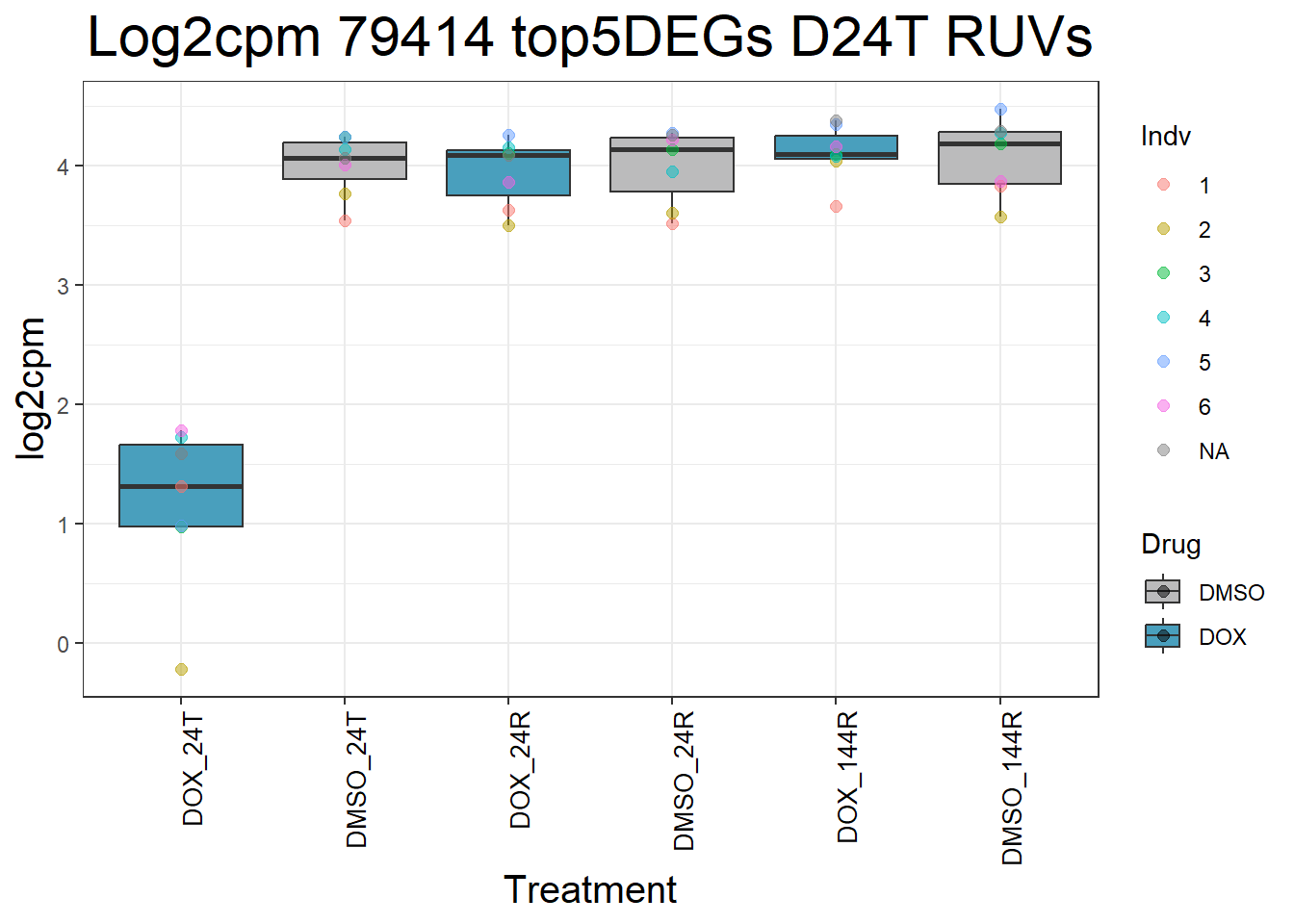 ggtitle(paste("Log2cpm", gene, "top5DEGs D24R RUVs")) +