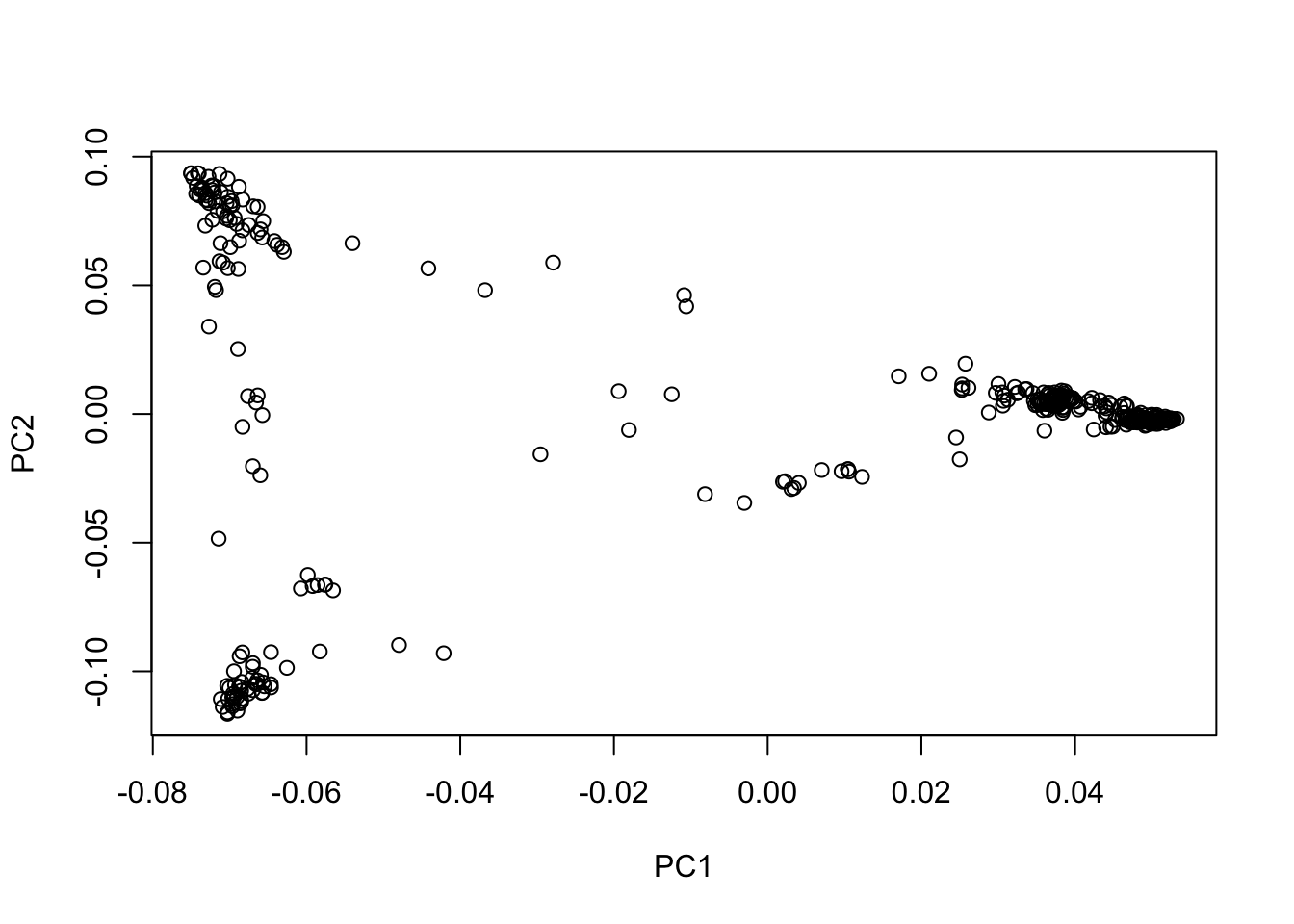 plot(eig_vectors_df$EV1, eig_vectors_df$EV2, xlab = "PC1", ylab = "PC2")