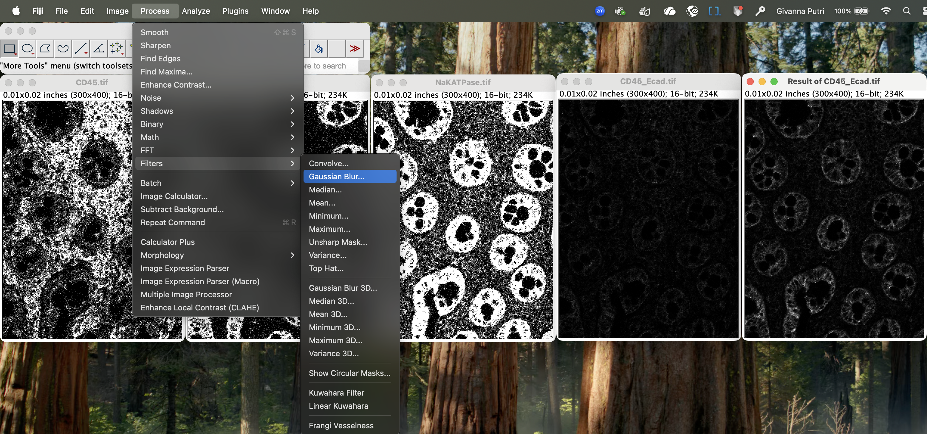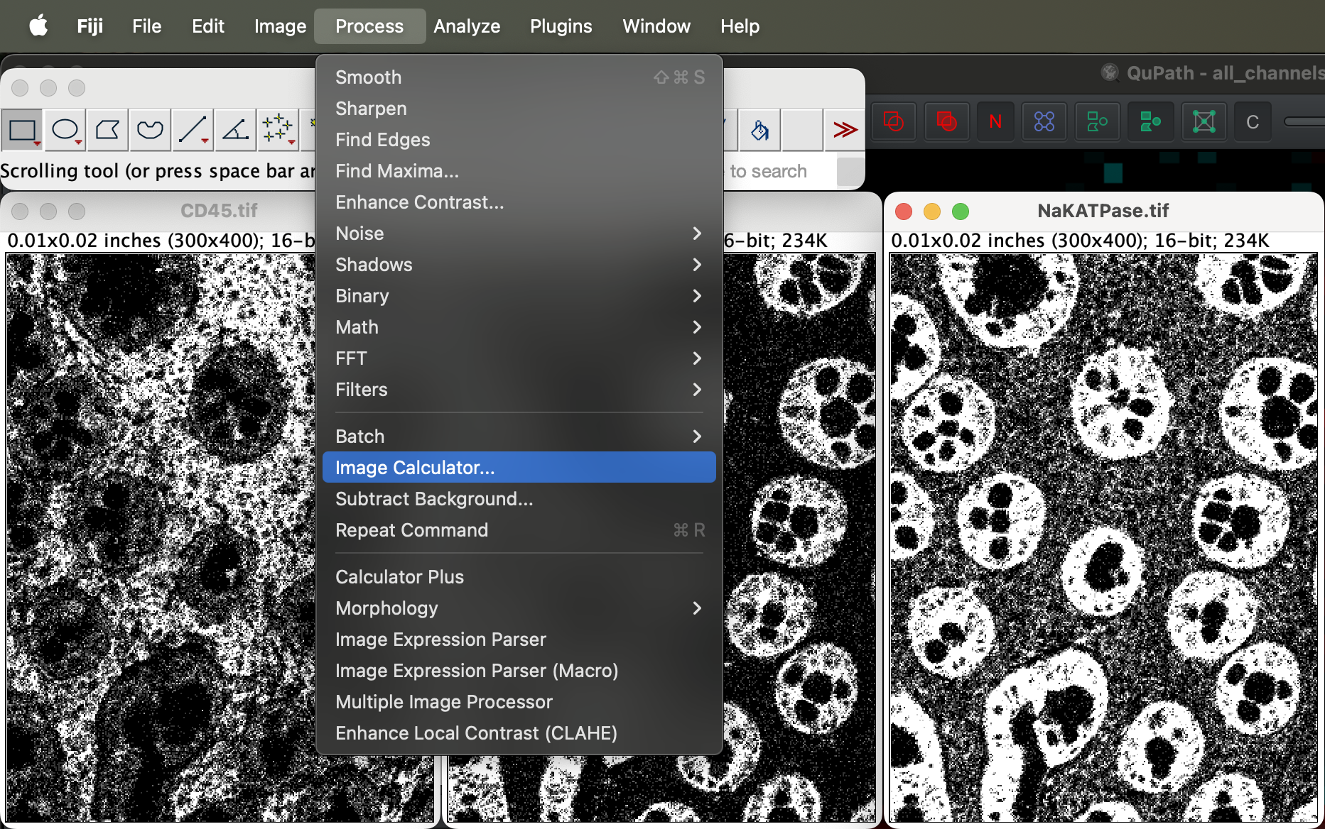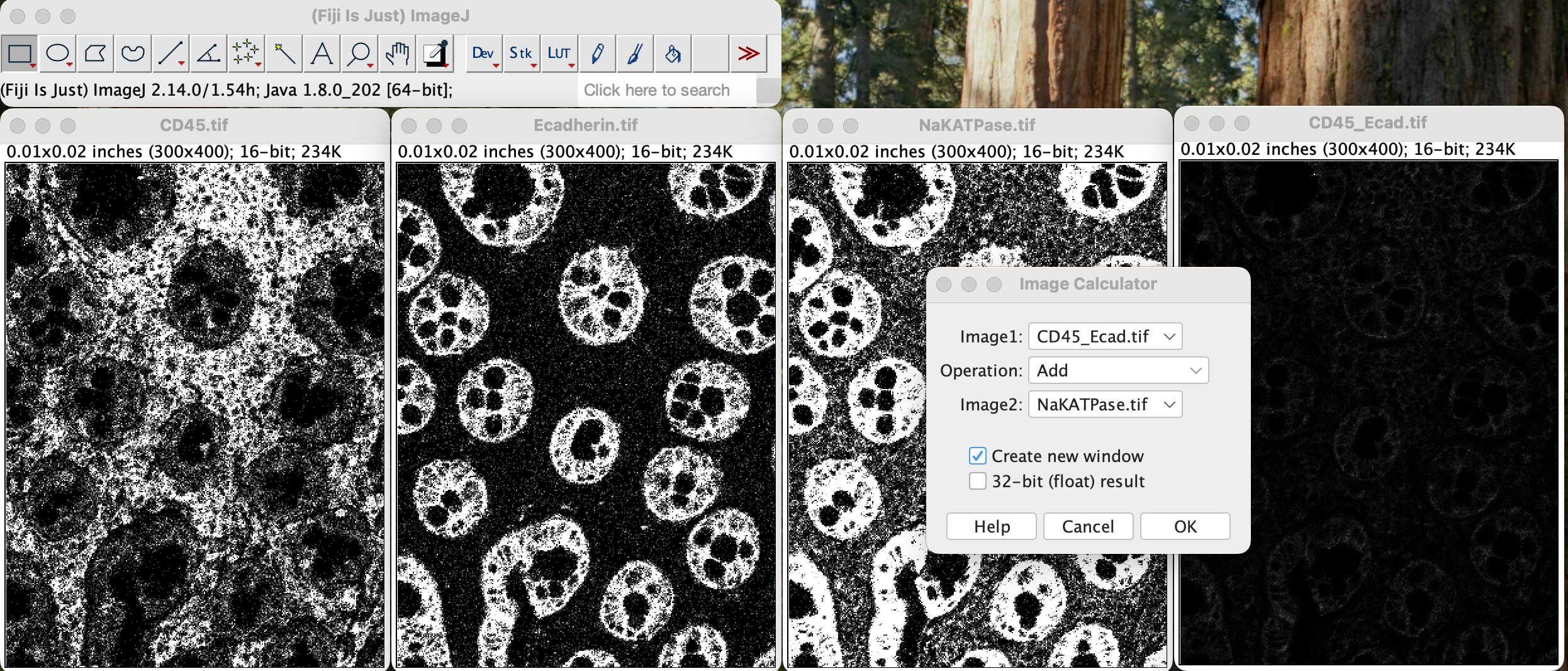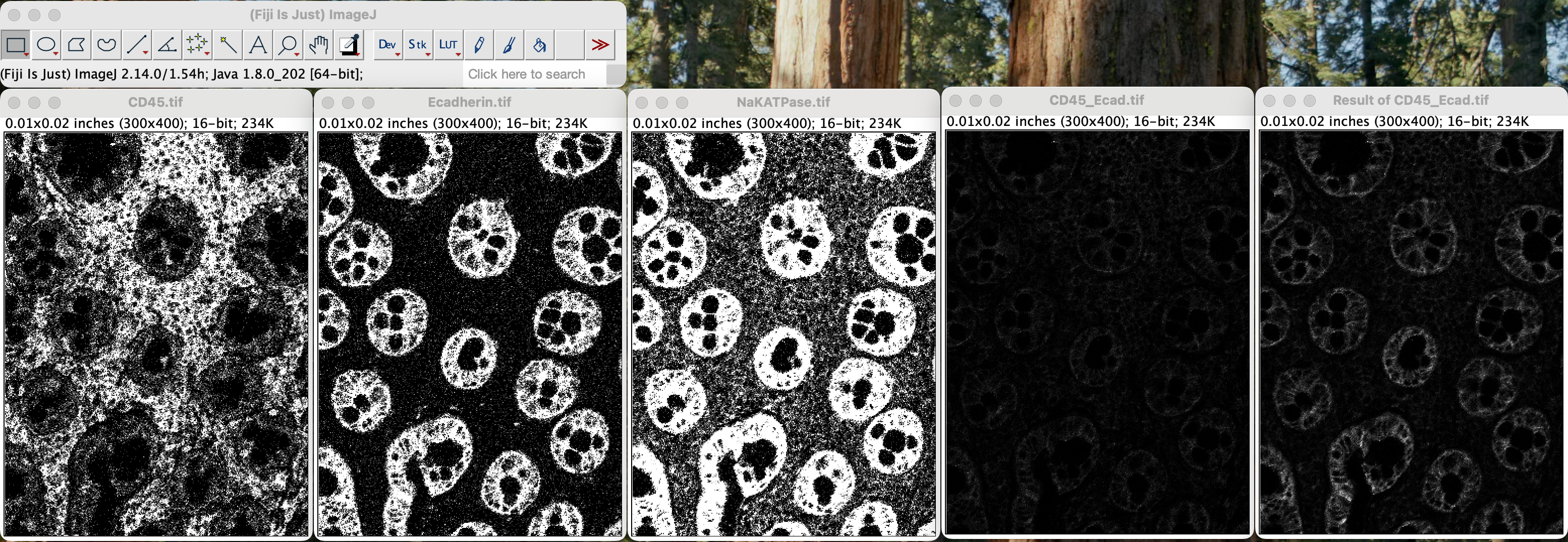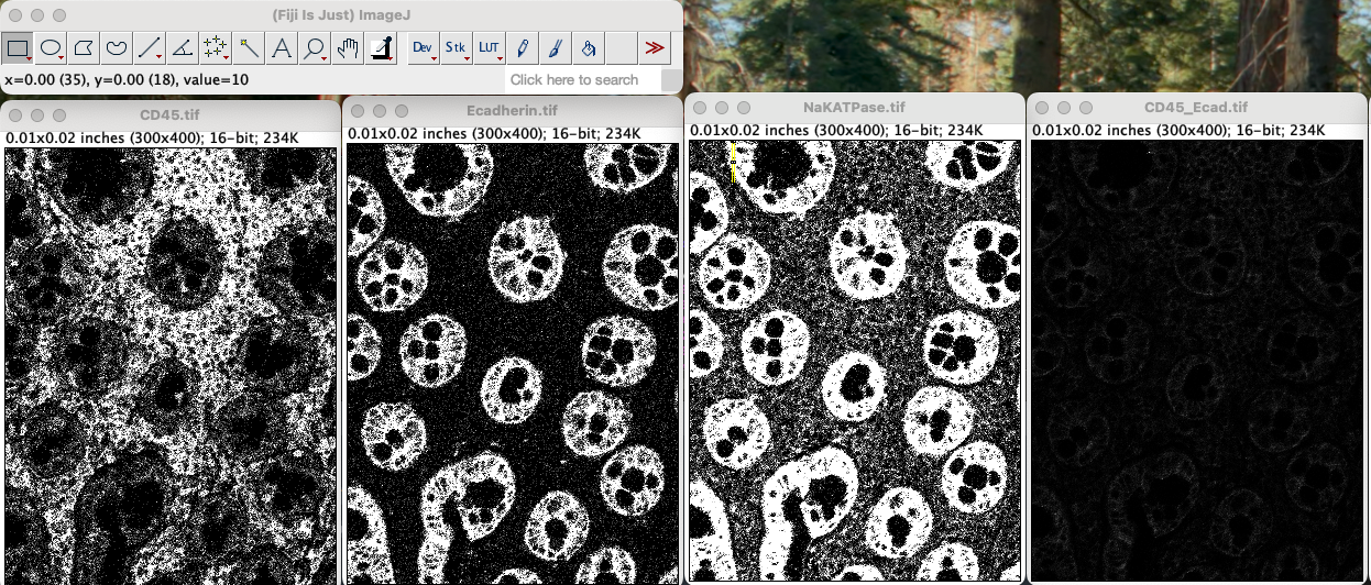 First, open CD45.tif, Ecadherin.tif, NaKATPase.tif in ImageJ. One window per image.