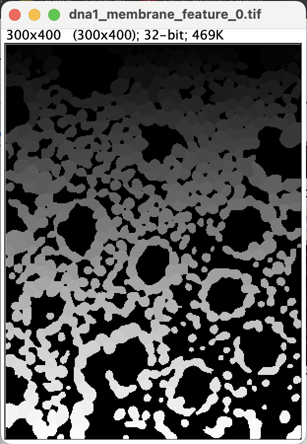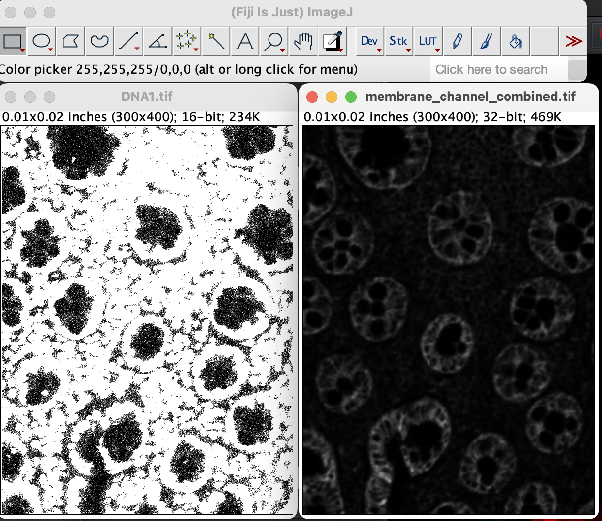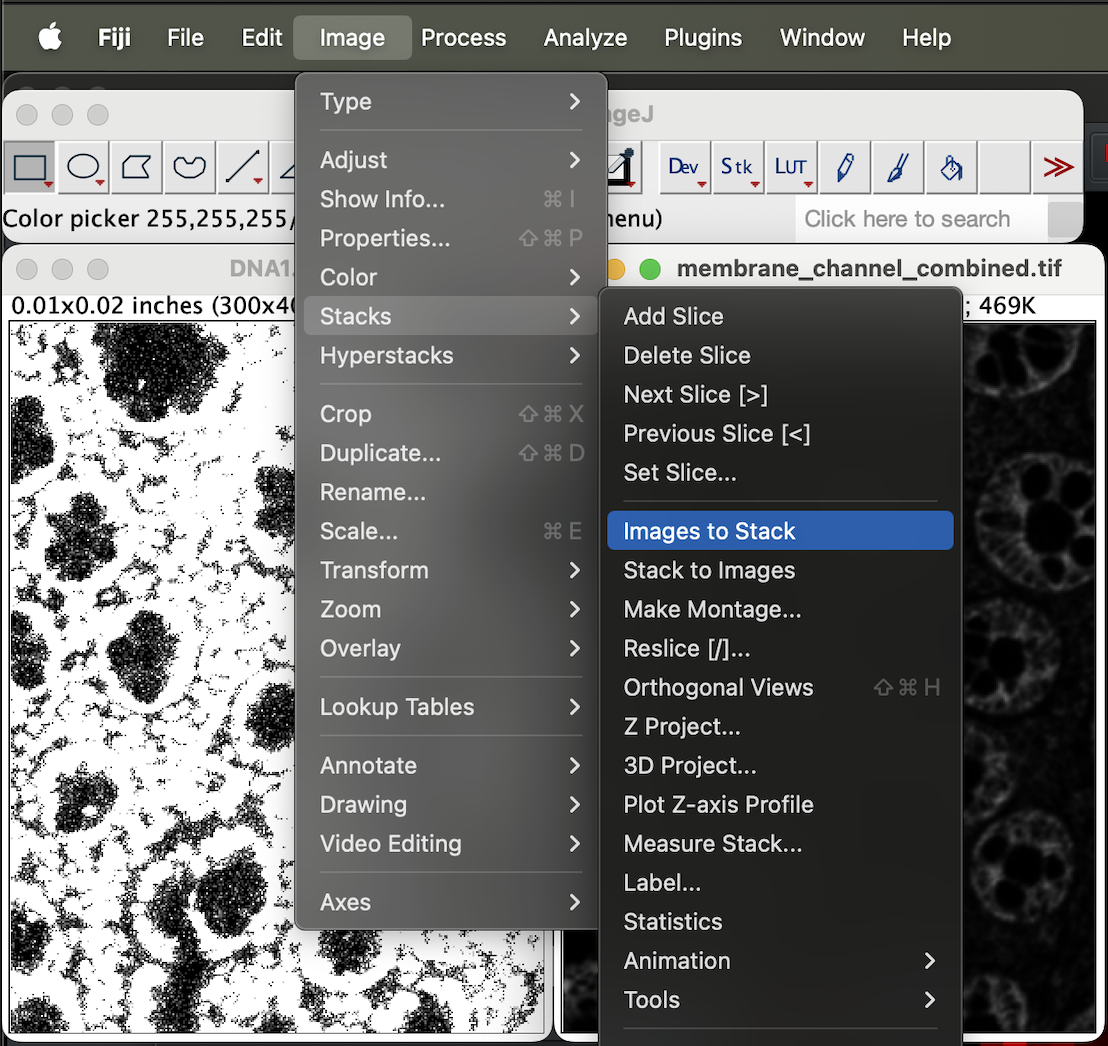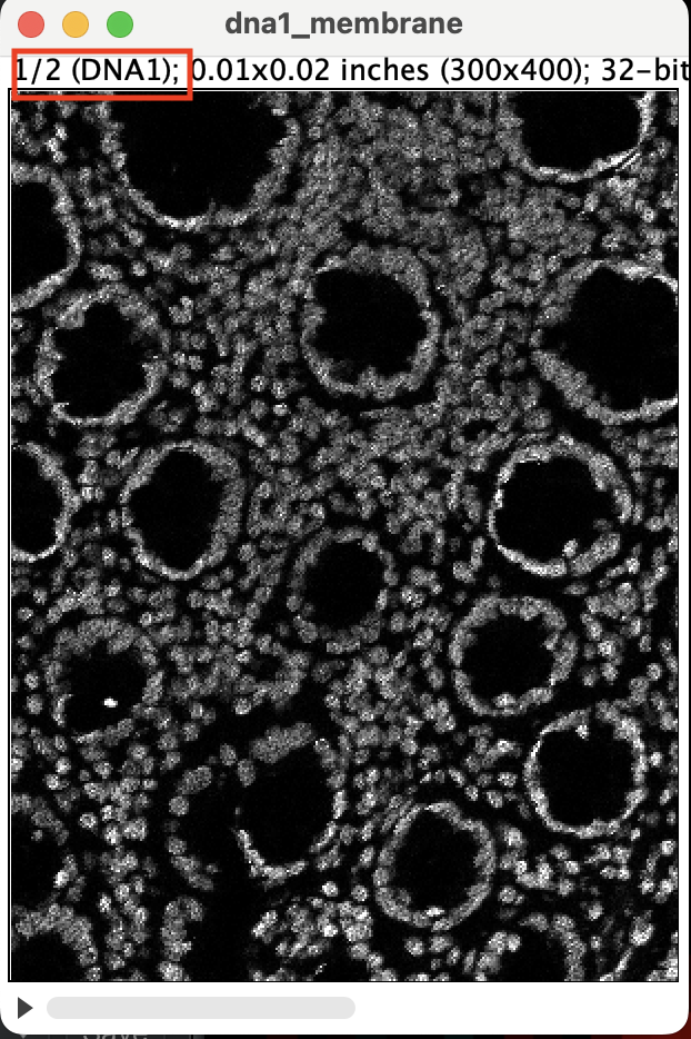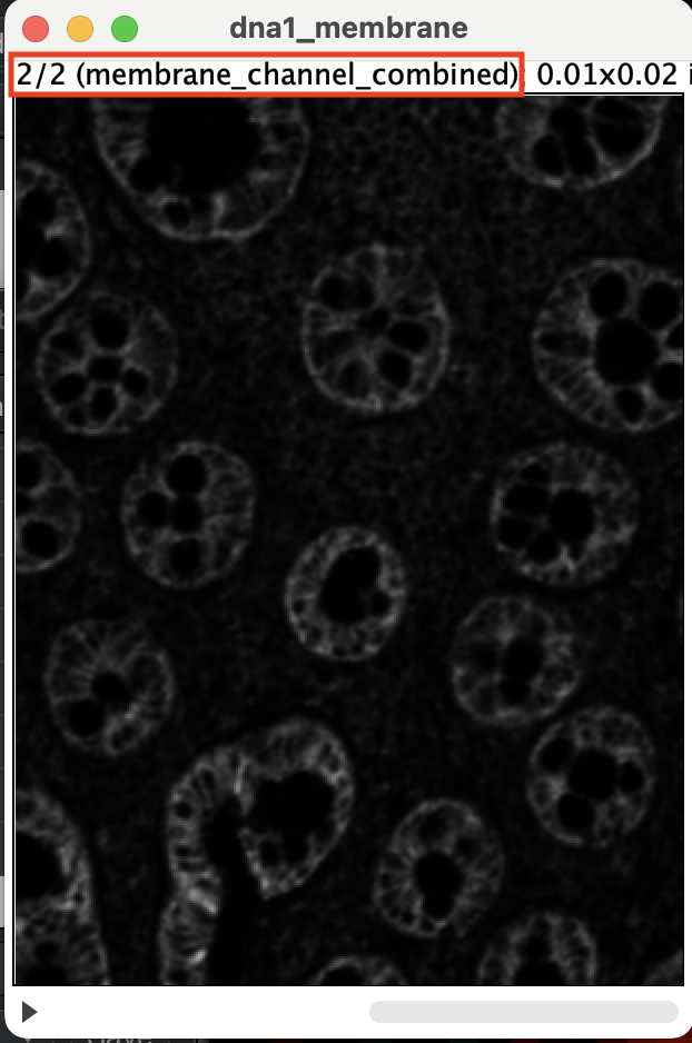 You should get a stacked image. Make sure stack 1 of 2 is DNA1 and stack 2 is the membrane channel. You can flick through the stack using the left and right arrow key. If the stacks are ordered correctly, you should see 1/2 next to the DNA1 and 2/2 next to membrane_channel_combined.
