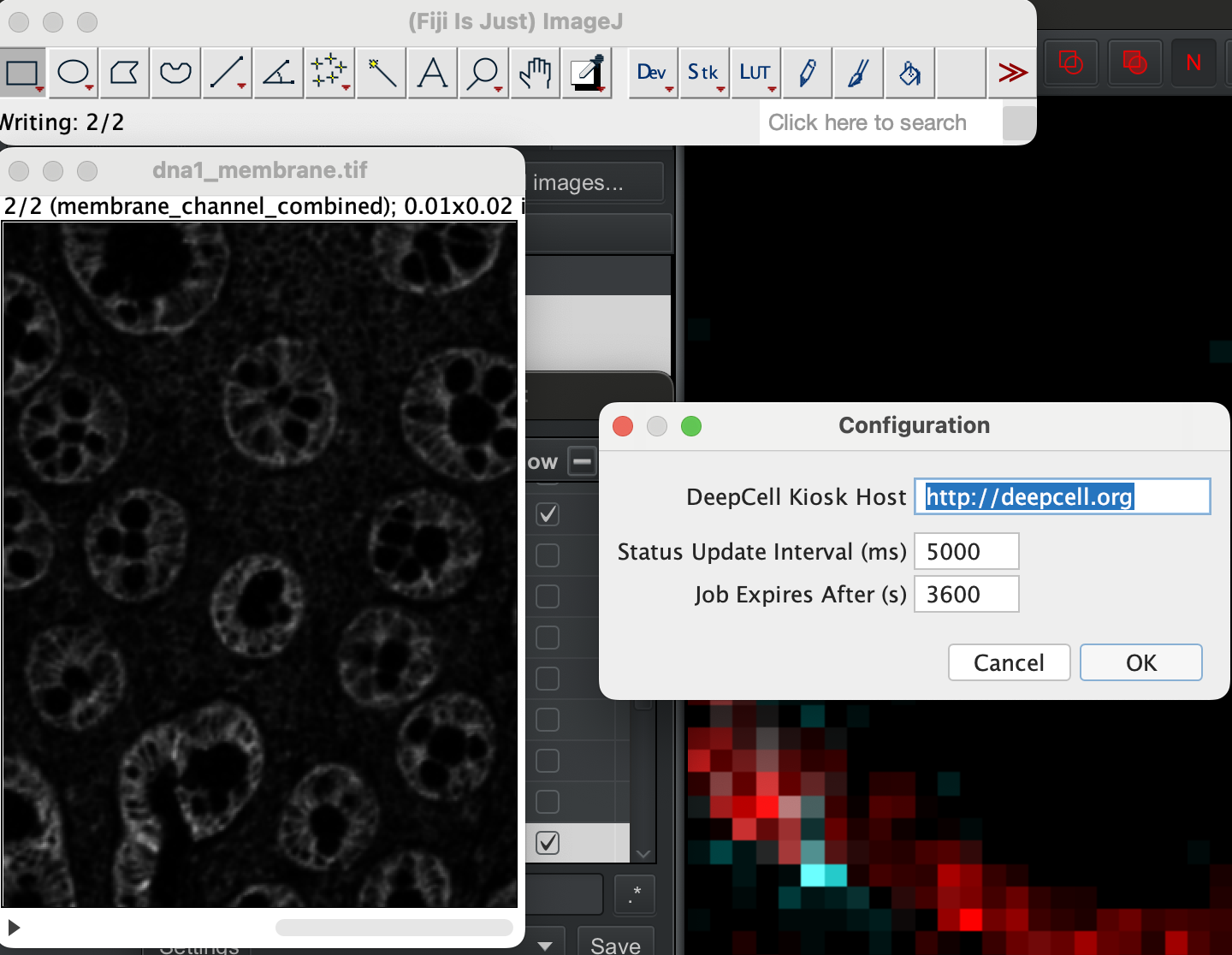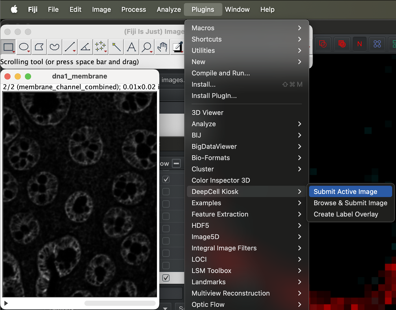 With the stack image open, select the image, then go to Plugin → DeepCell Kiosk → Submit Active Image.