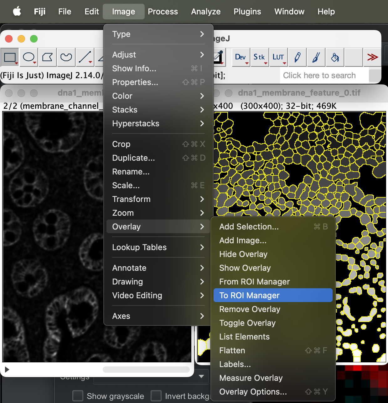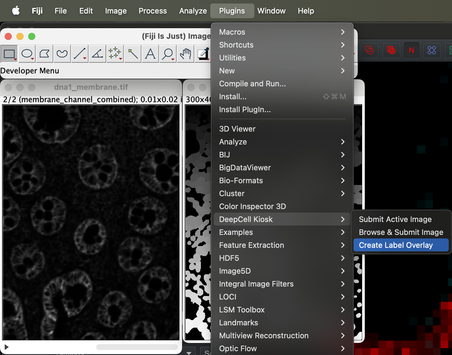Before we can import the segmentation to Qupath for closer inspection, we have to first generate the label overlay. Go to Plugin → DeepCell Kiosk → Create label overlay.