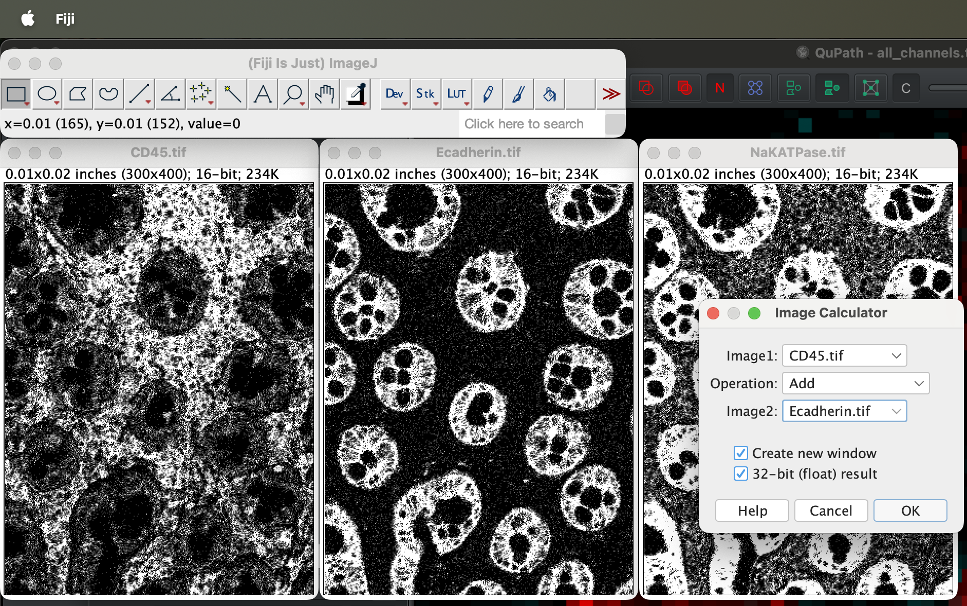 Repeat the process but select CD45_Ecadherin.tifas image 1 and NAKatPase as image 2.