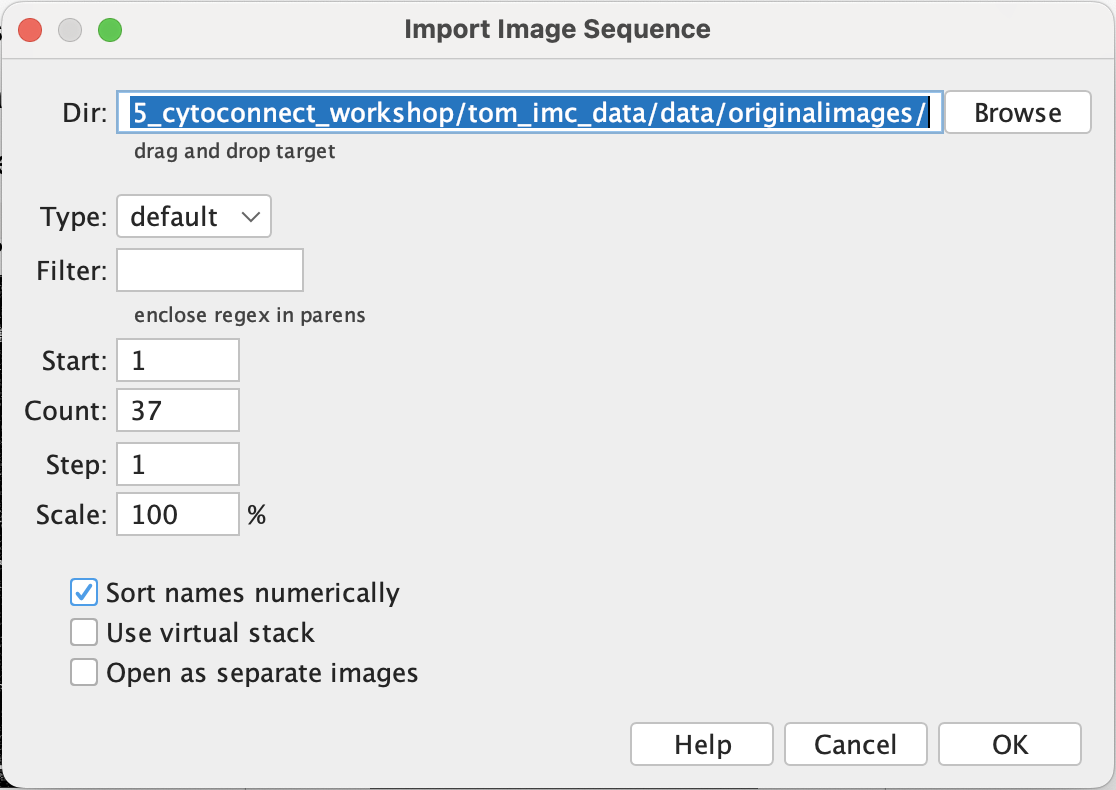 Set the channels to how many markers you have (37 in this dataset) and slice to 1. Leave the order as it is as that’s how qupath likes it.