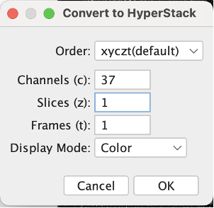 We have to then convert it to hyperstack. Go to Image → Hyperstacks → Stack to Hyperstack.