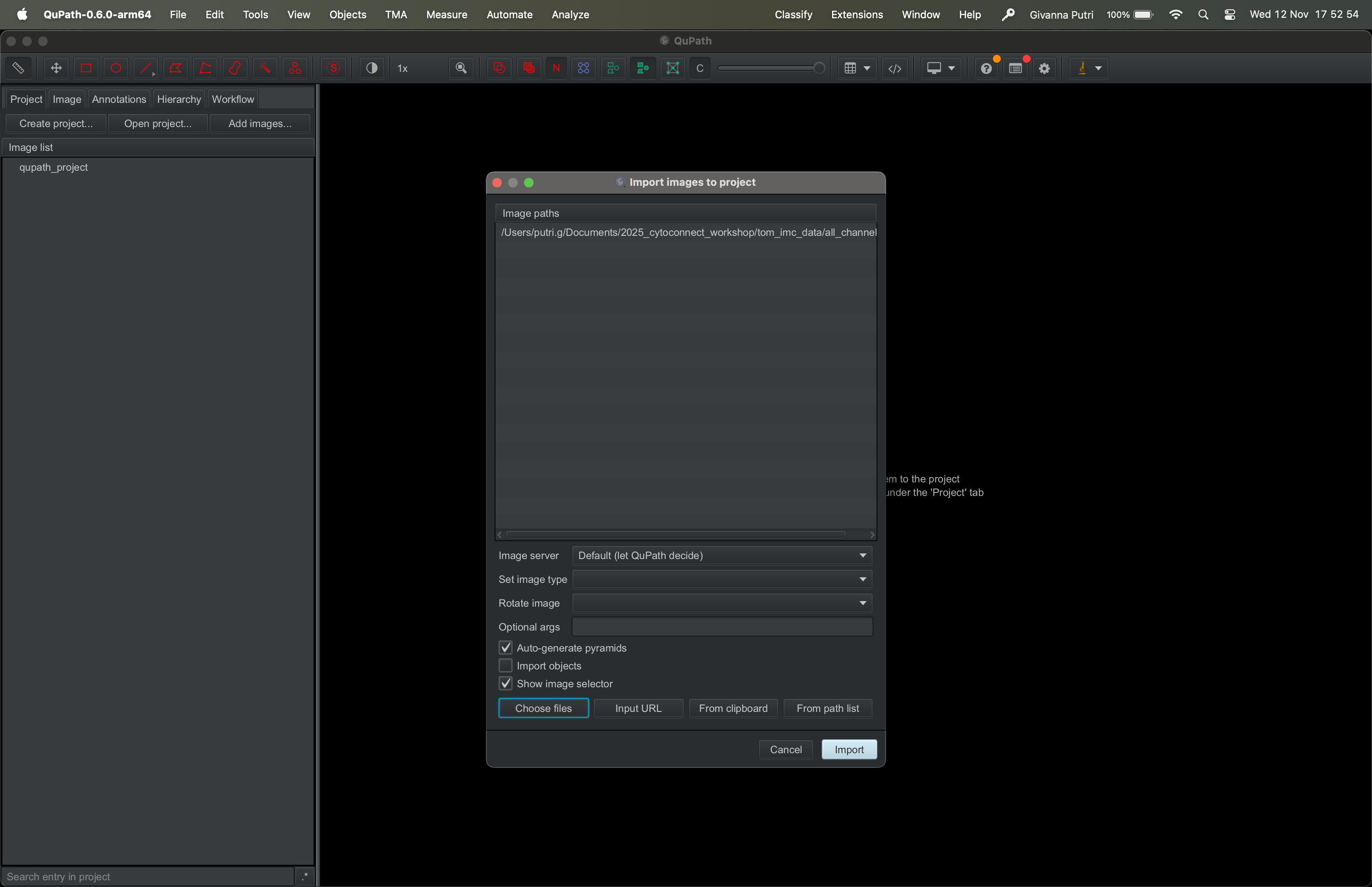 You will then be asked to add images to the QuPath project. Click Choose files and select the directory where you store the tif stack tif file we created in the previous section. Then click import.