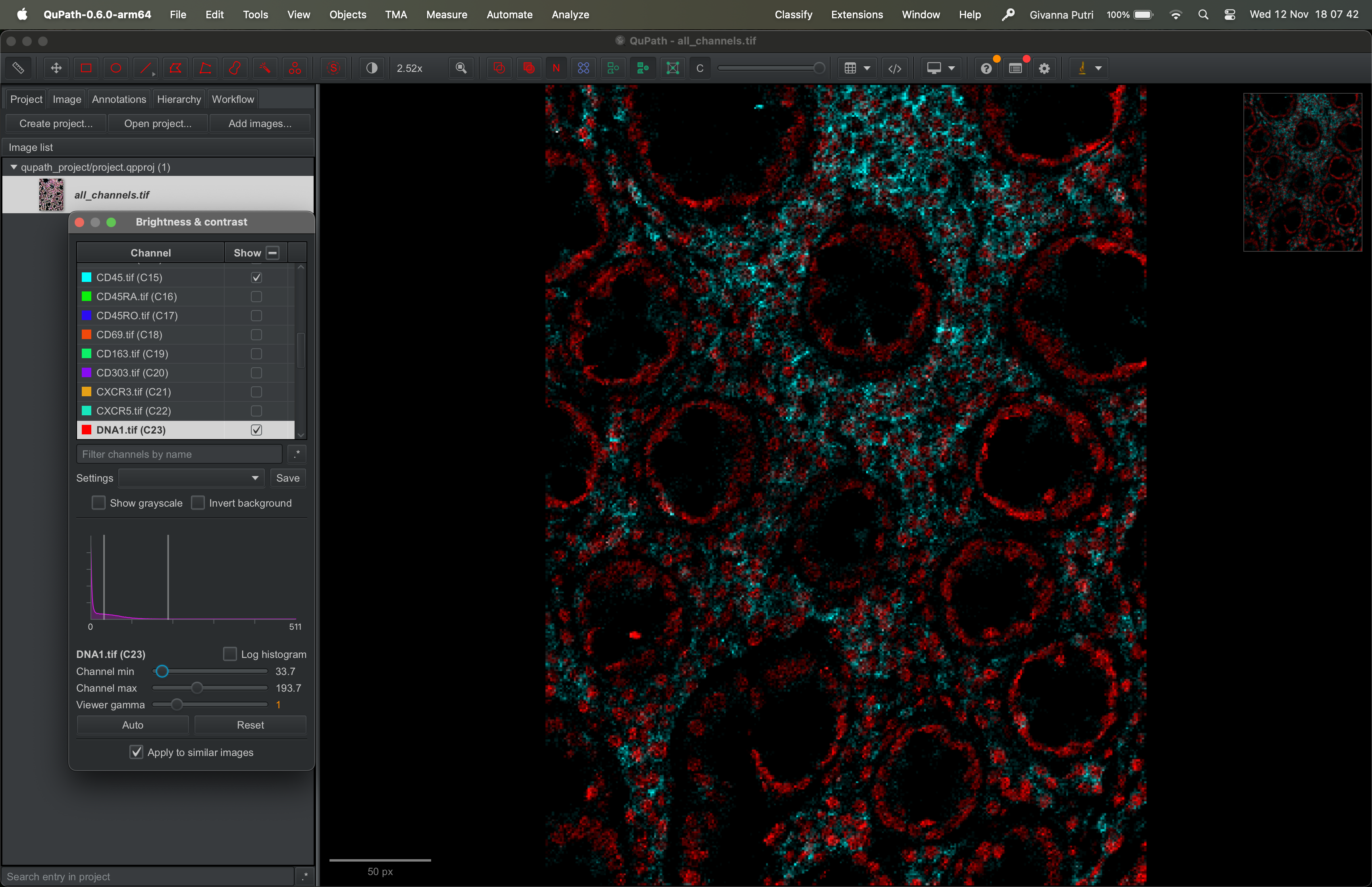 If a channel has very bright signal (like DNA1 in our example above), it can visually dominate the display. We can reduce its apparent brightness by changing how QuPath maps pixel intensities to display brightness.