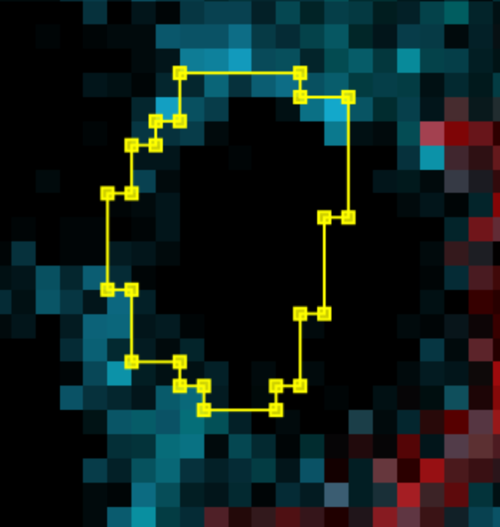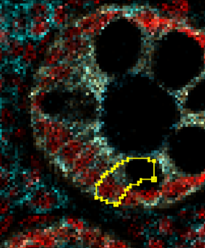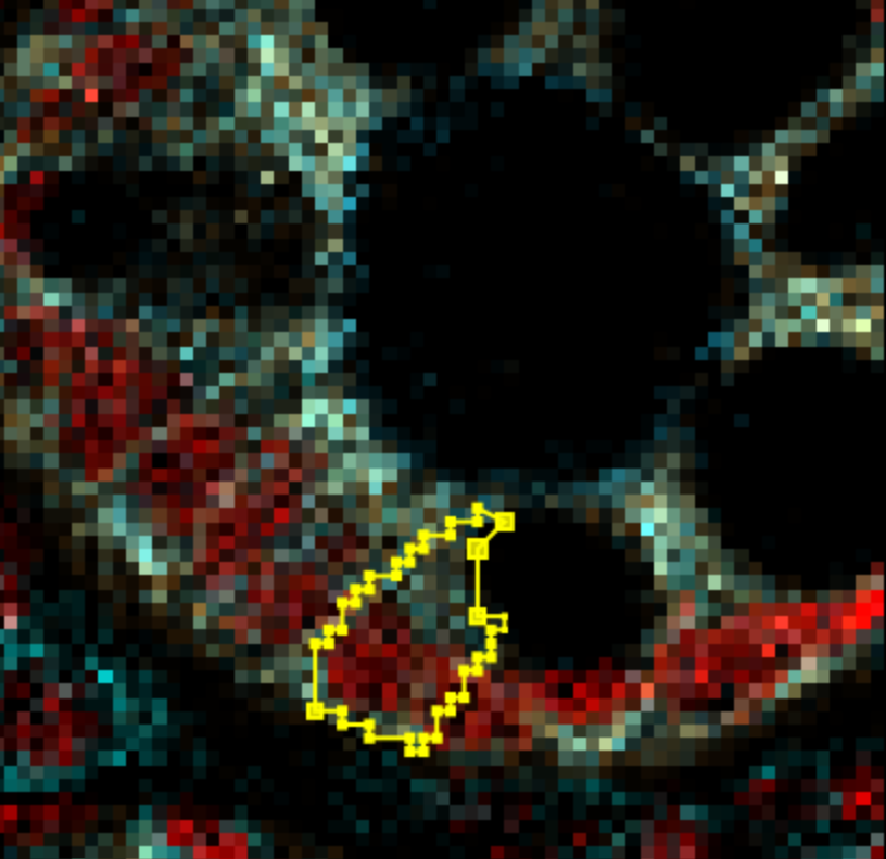 If you find a weird or just plain wrong segmentation, like below where we have cells missing DNA (red) - double clicking on a cell should focus on it. You can delete it by just pressing the delete key.