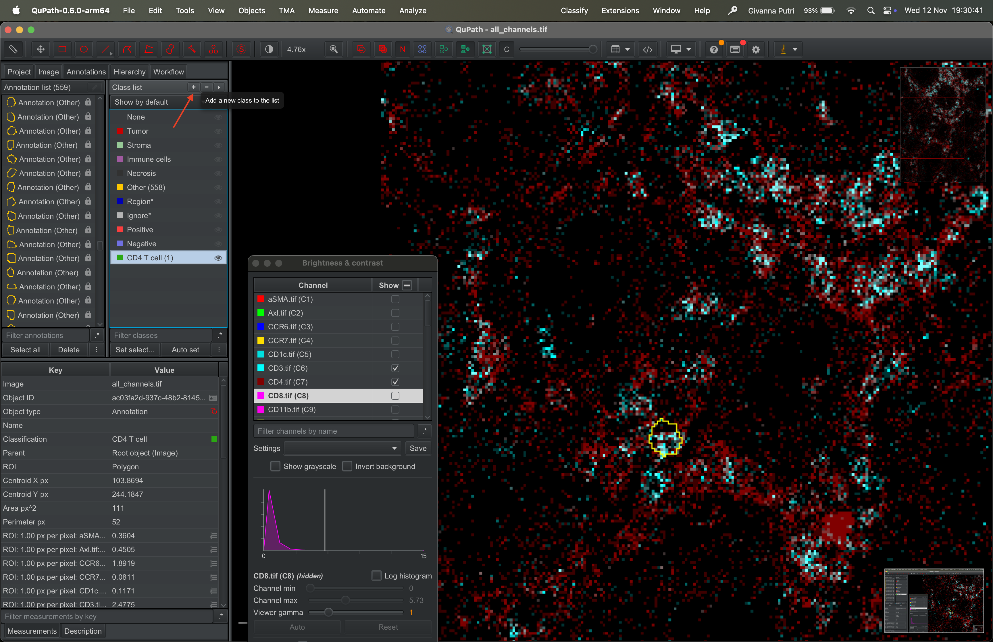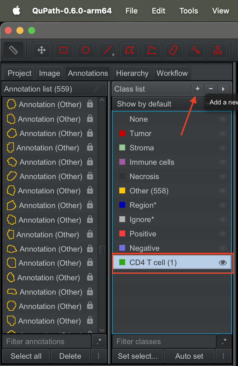 On the class list panel, click on the + button to create a new label. Say CD4 T cell.