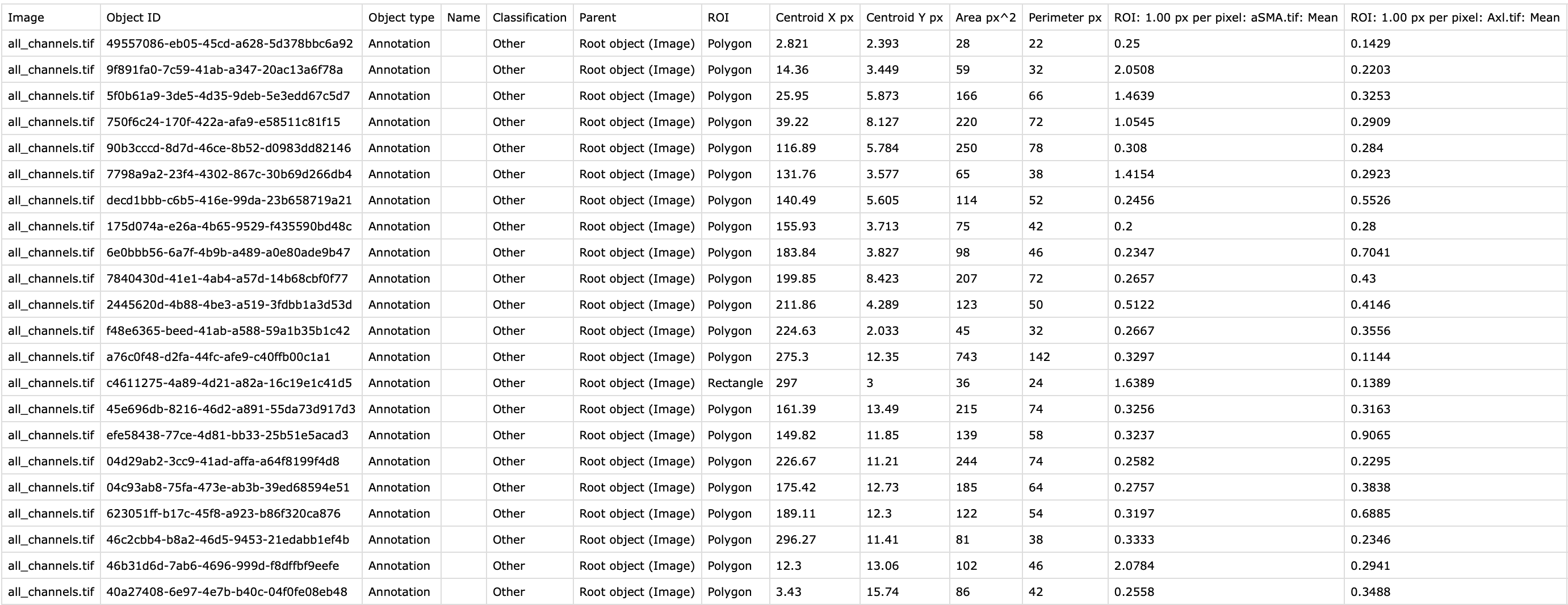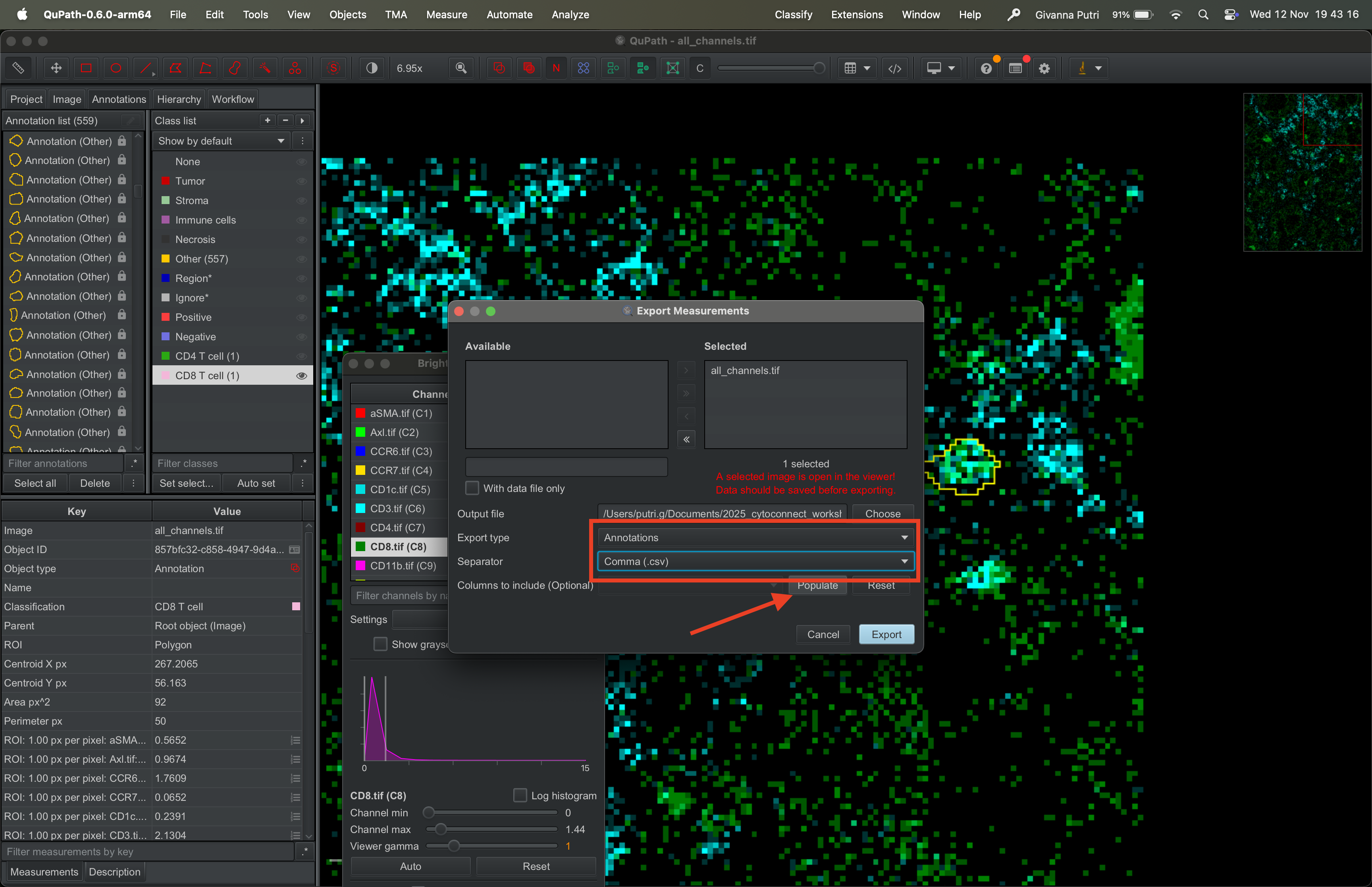 Click “Select all” in the annotation list panel on the left, just like before. Go to Measure → Export measurements.