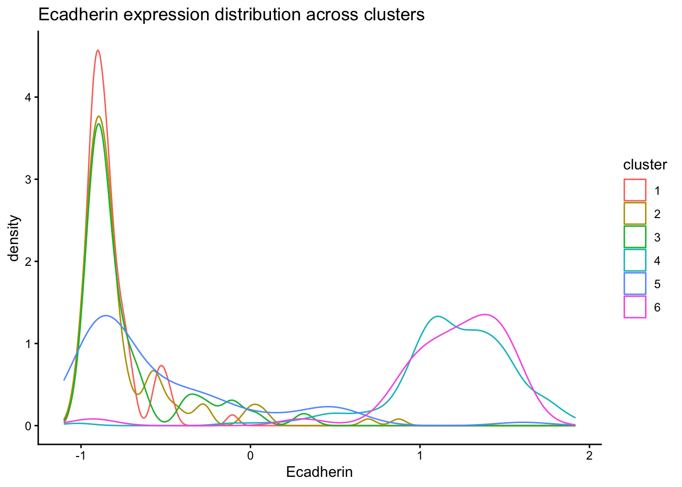 ggplot(normed_exp_filtered_scaled, aes(x=Ecadherin, color=cluster)) +