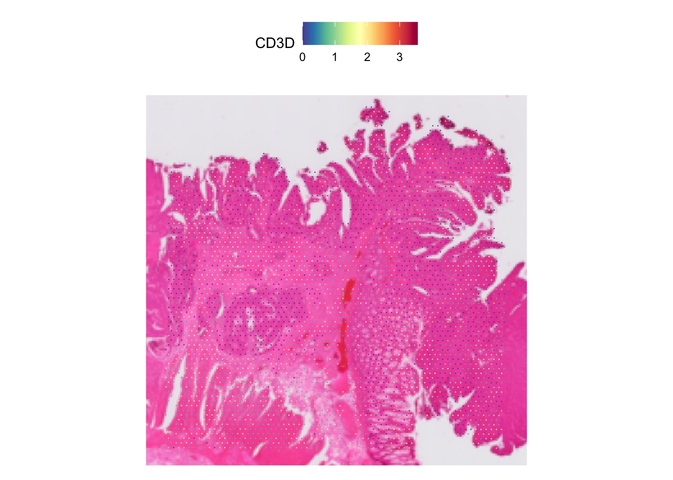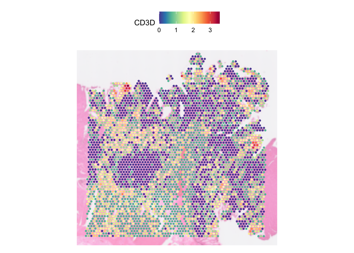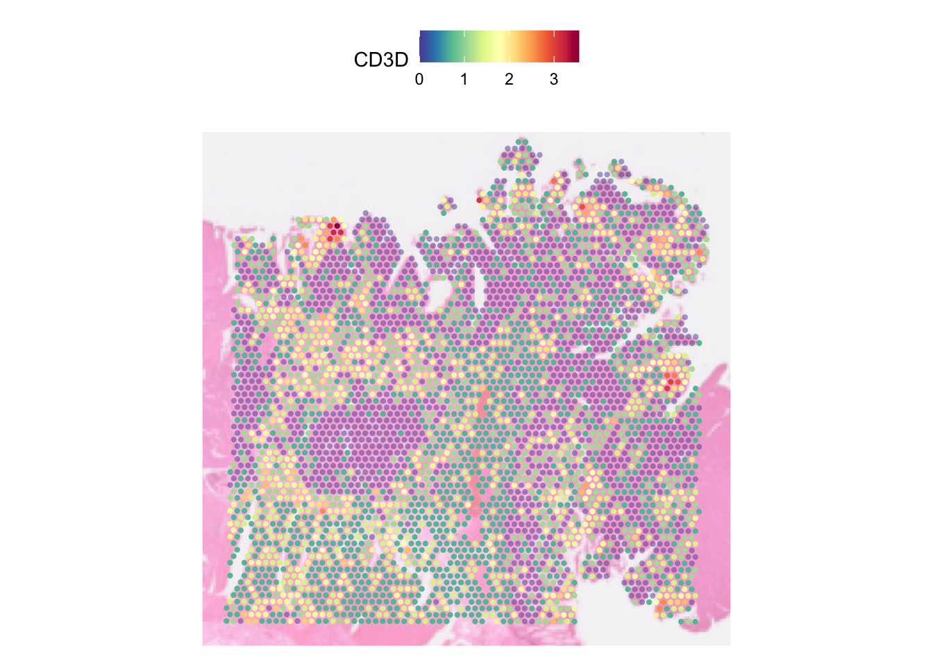 In the plot above, each spot is coloured by the expression of CD3D