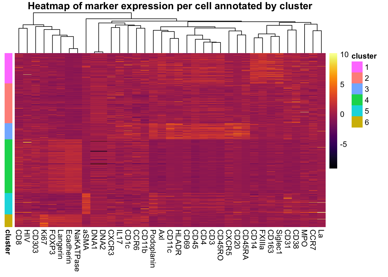 Heatmap of marker expression for each cell annotated by cluster.
