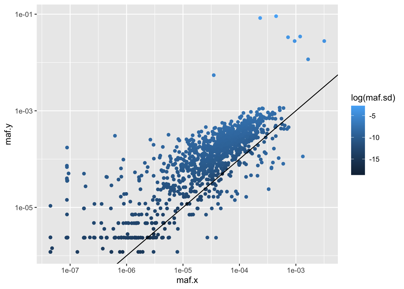 ggplot(btr4d0ab,aes(x=maf.x,y=maf.y,color=log(maf.sd)))+