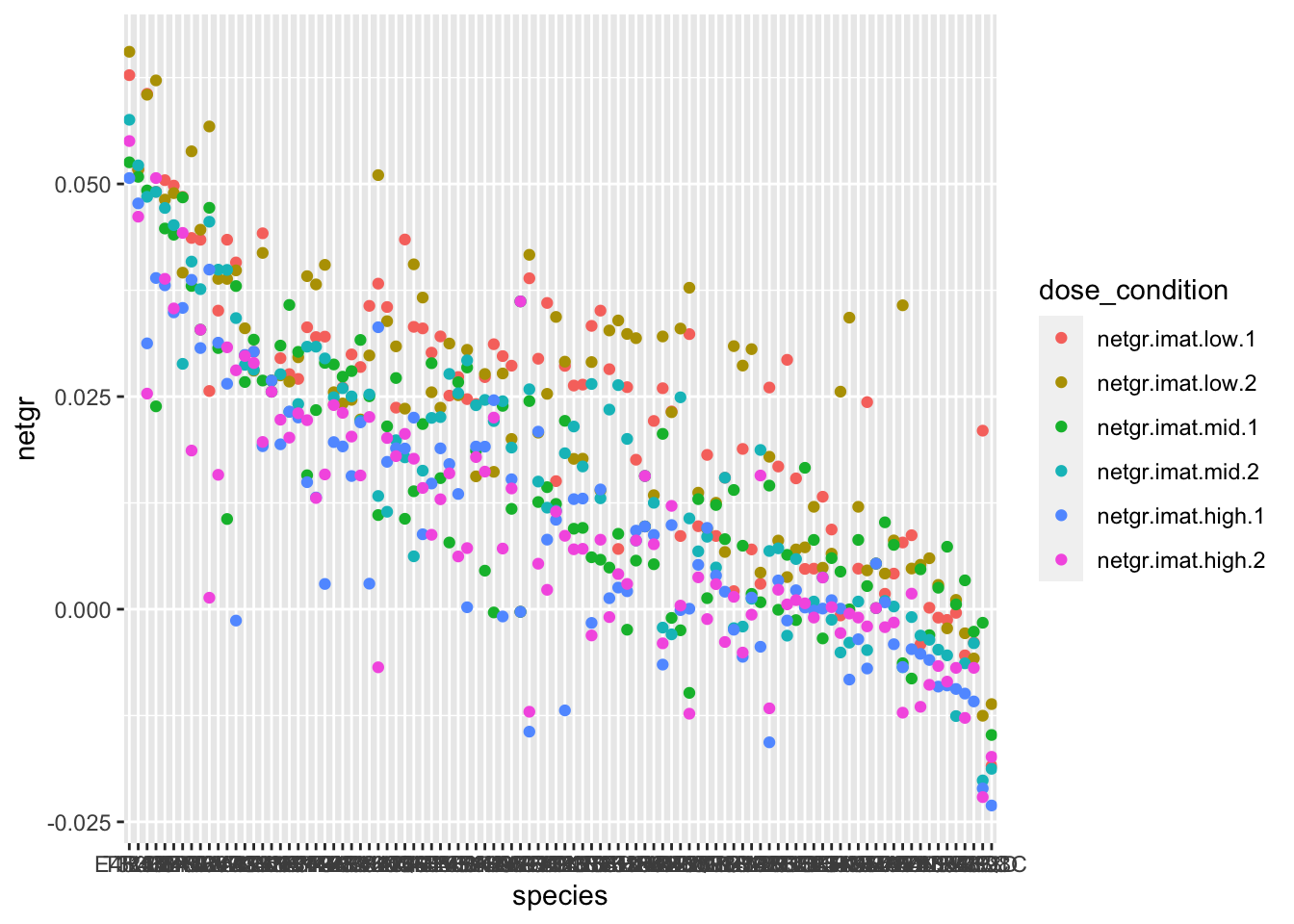 ggplot(imatdata_gnomad_melt,aes(x=species,y=netgr,color=dose_condition))+