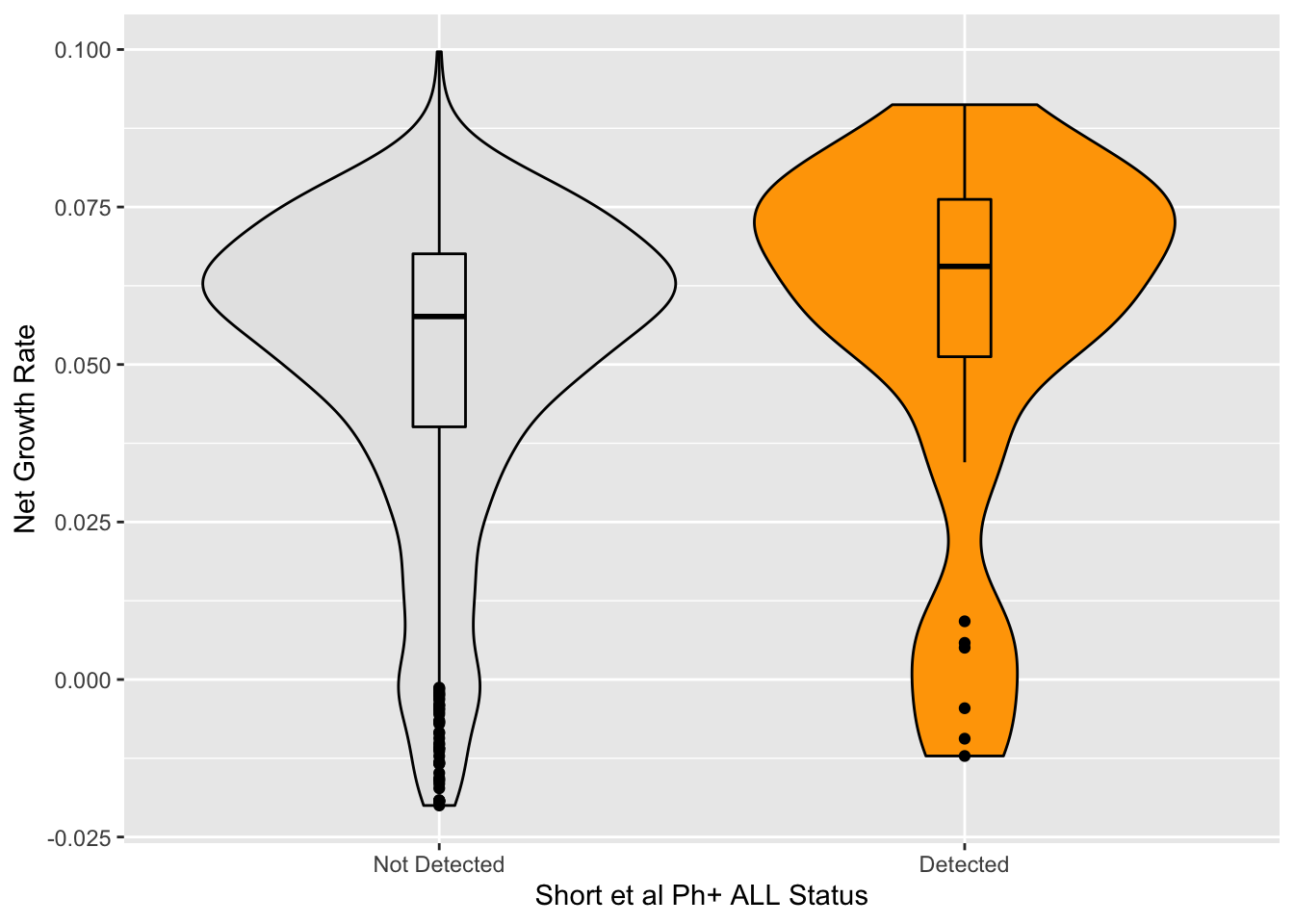 scale_fill_manual(values=c("gray90","orange"))+theme(legend.position = "none")+scale_y_continuous("Net Growth Rate")+scale_x_discrete("Short et al Ph+ ALL Status",labels=c("Not Detected","Detected"))