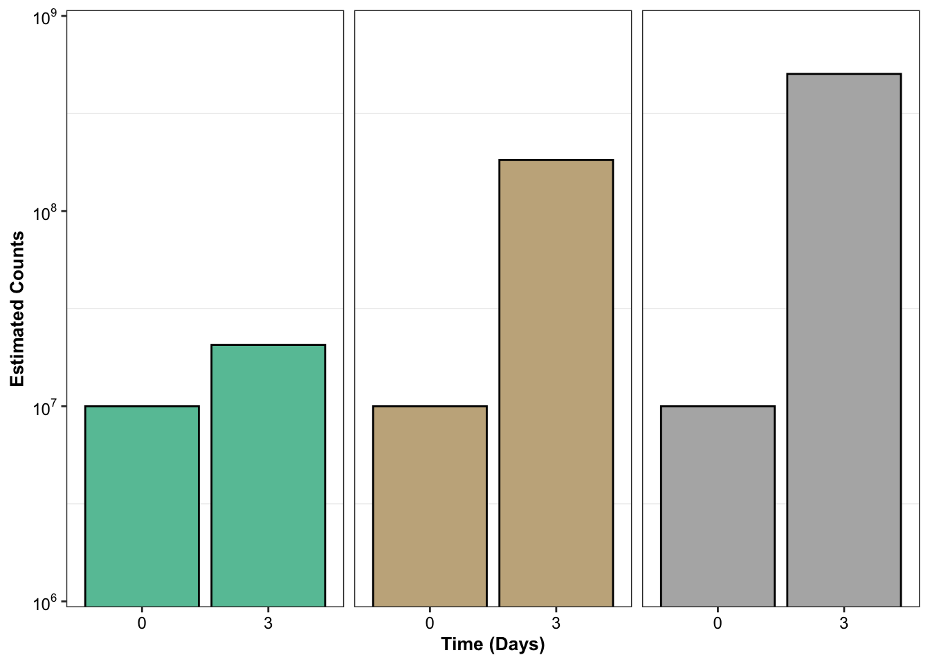 ggplot(sol_comb_doses%>%filter(dose%in%1.2)%>%filter(time%in%c(0,3)),aes(x=(factor(time)),y=count,fill=factor(mutant)))+geom_col(color="black")+facet_wrap(~mutant)+cleanup+discrete_scale("fill", "manual", palette_Dark2)+