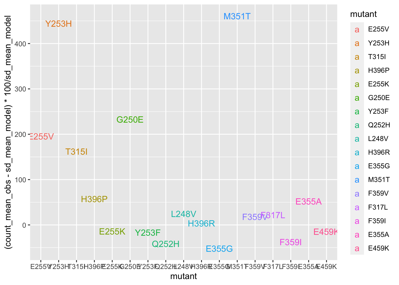 ggplot(deviations,aes(x=mutant,y=(count_mean_obs-sd_mean_model)*100/sd_mean_model,color=mutant,label=mutant))+geom_text()