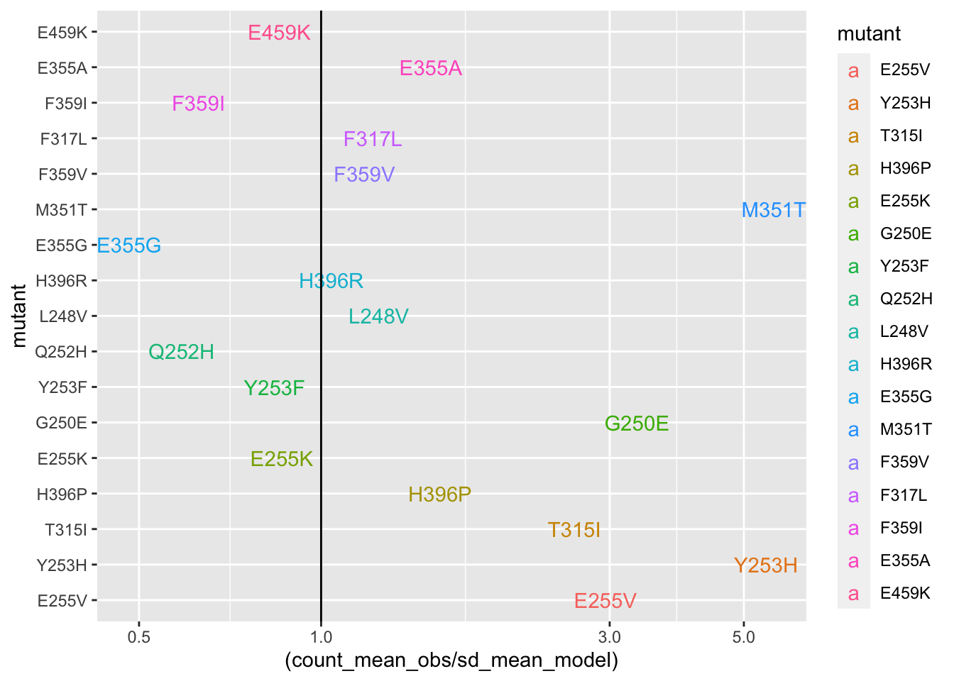 ggplot(deviations,aes(y=mutant,x=(count_mean_obs/sd_mean_model),color=mutant,label=mutant))+geom_text()+scale_x_continuous(trans="log10")+geom_vline(aes(xintercept=1))