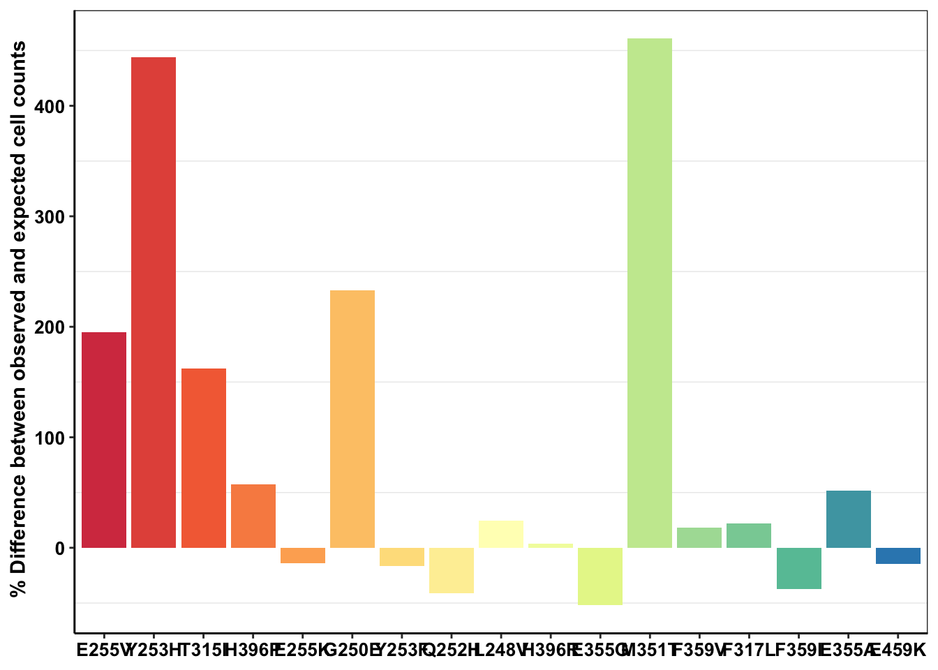 #####Plotting it in a hazard ratio fashion. Wheras the other plots show %increase in counts vs expectations, this hazard ratio plot also helps hone in on some of the mutants that got decreased by a lot. In a sense, it is a fairer plot.