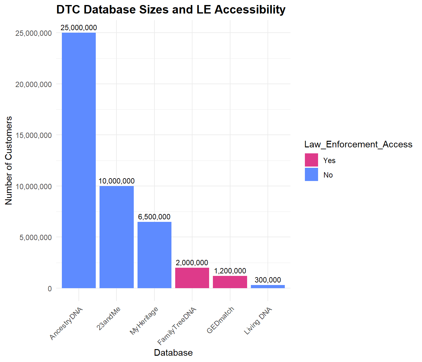 The following bar chart displays both law enforcement accessibility and total numbers for each of the major DTC databases.