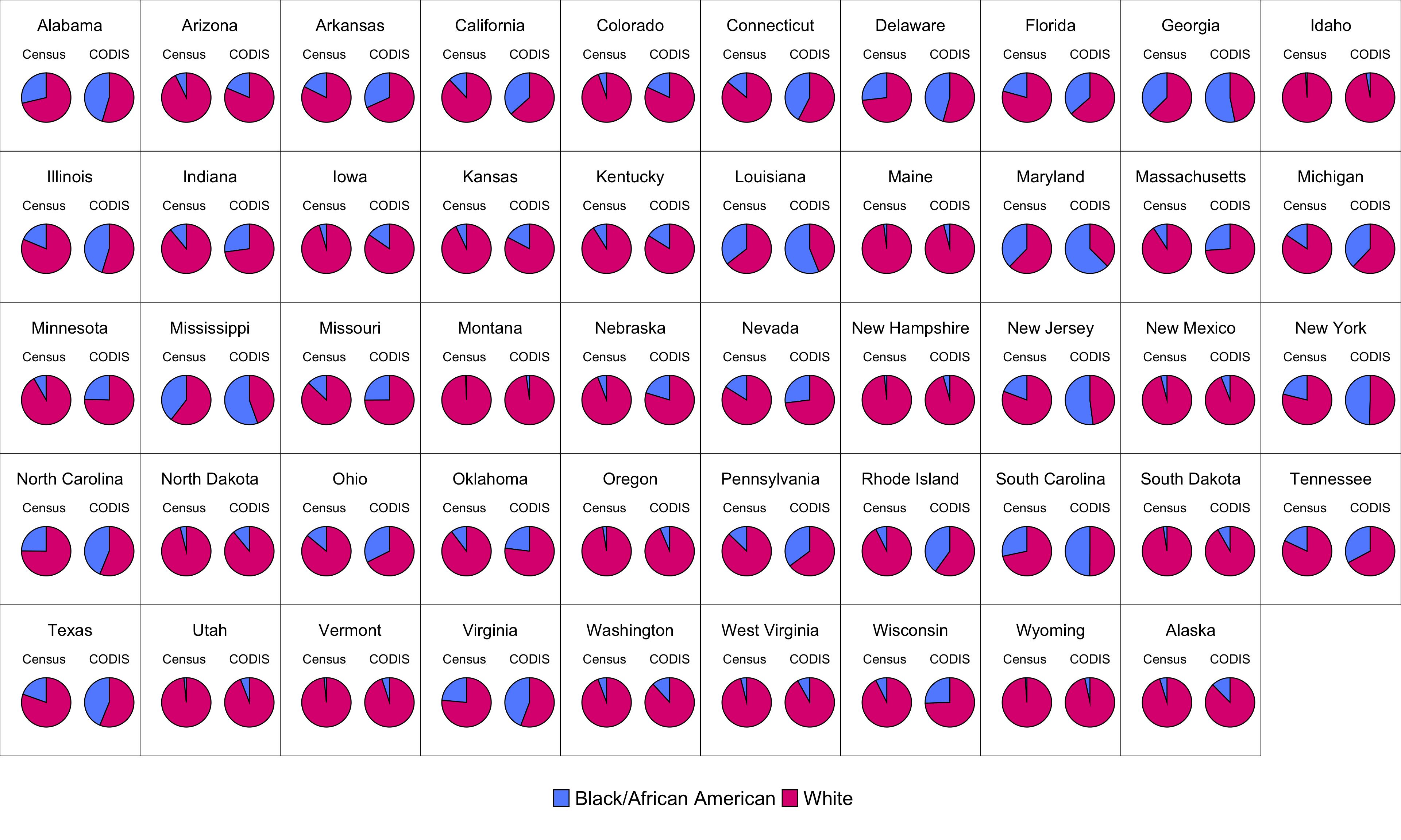 Finally, we generate side-by-side pie charts for each state showing the racial composition according to the census (left) versus the estimated racial composition of CODIS (right) for each state. Note that groups not identifying as Black or White are omitted for easy comparison.