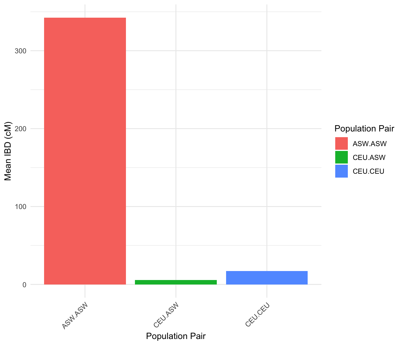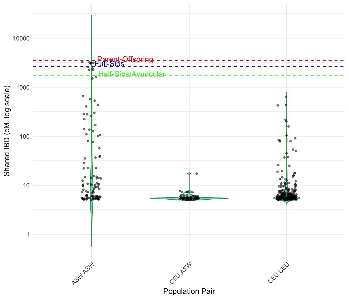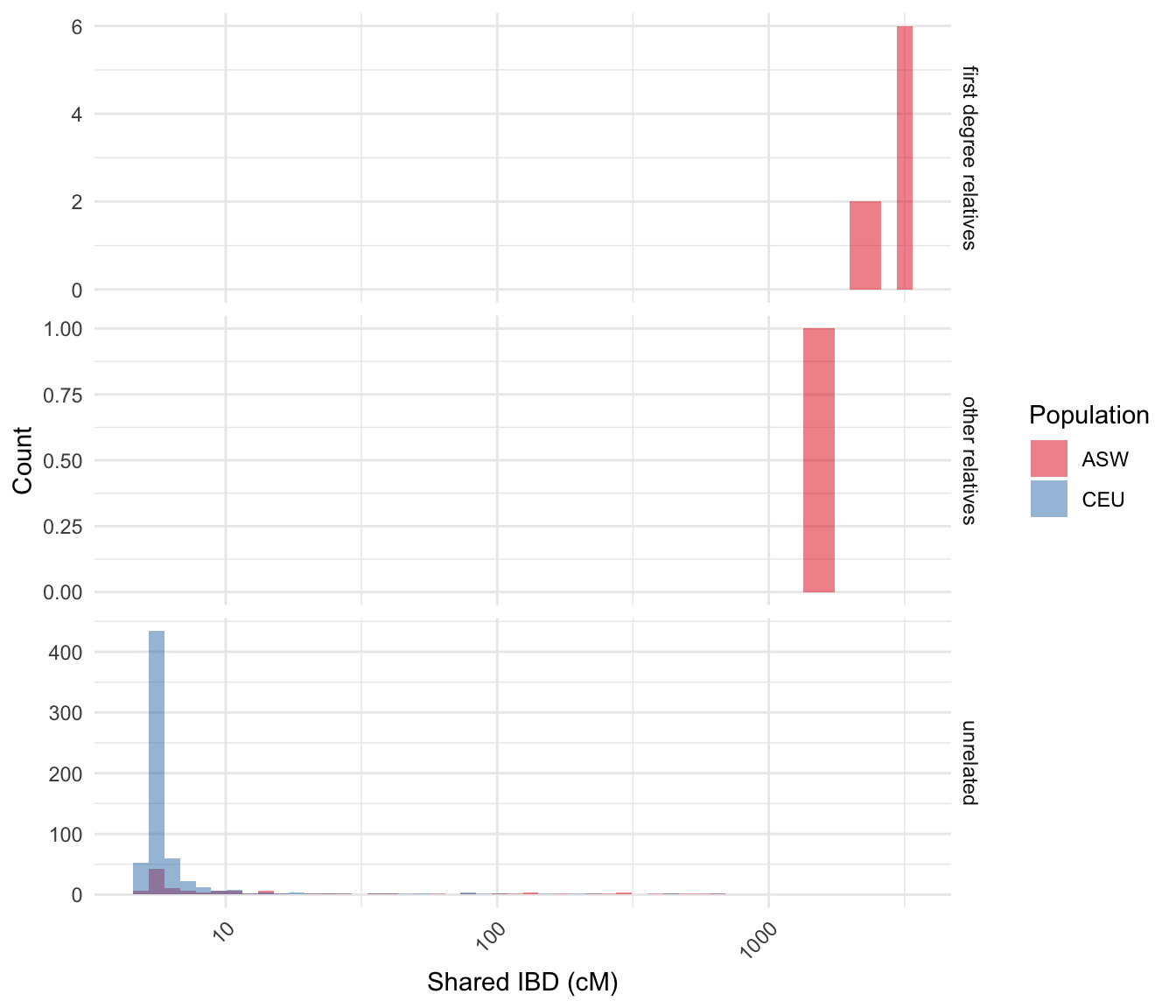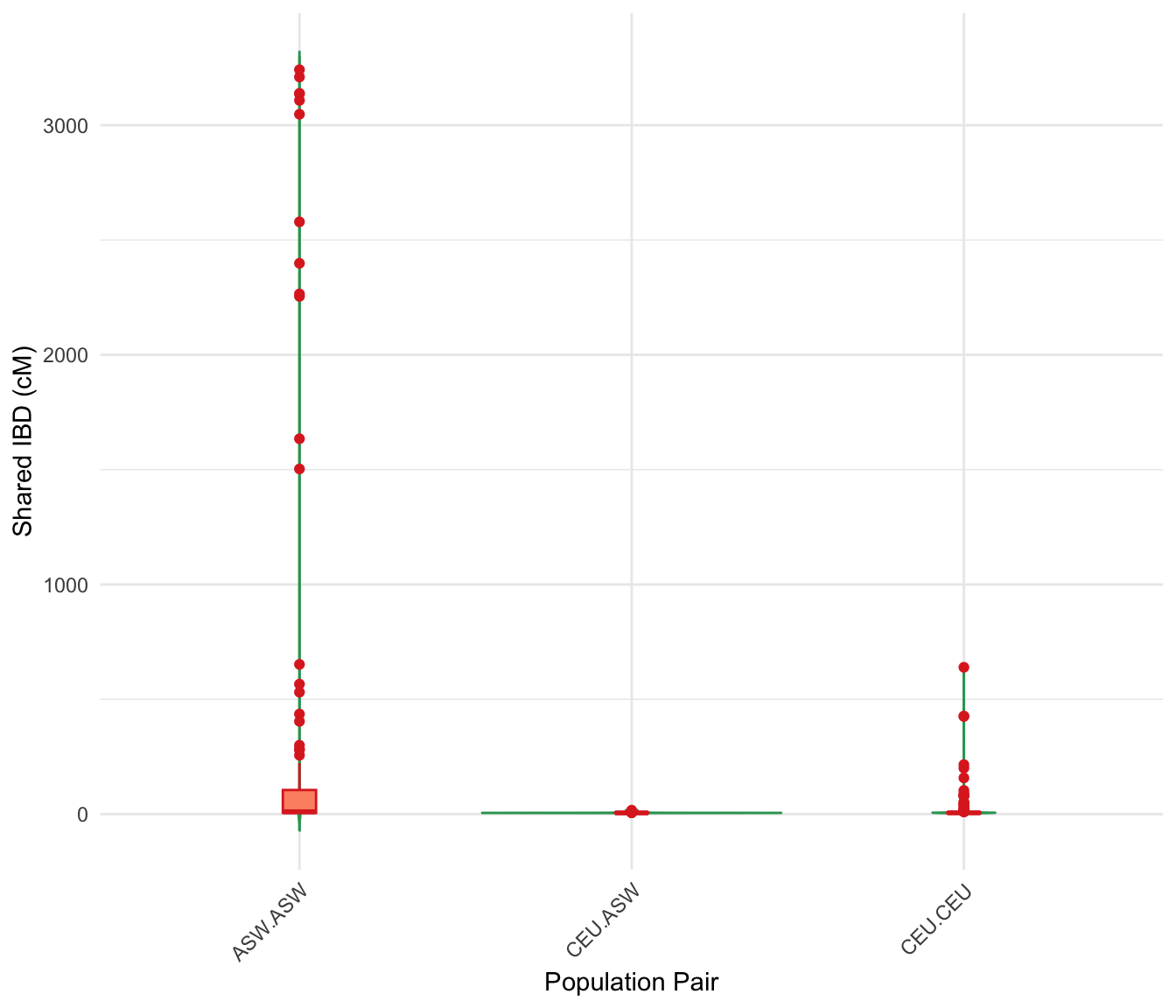 Here we see that there is much higher mean IBD in the ASW sample than expected. After checking for errors, it appears that this has to do with the nature of the HapMap sample. African Ancestry in SW USA (ASW) contains 20 parent-child duos, 13 trios, and 5 families of 2 or more with only 15 unrelated individuals (see link). Given the description of the sample, it seems really important to not use this population as a proxy for African Americans.