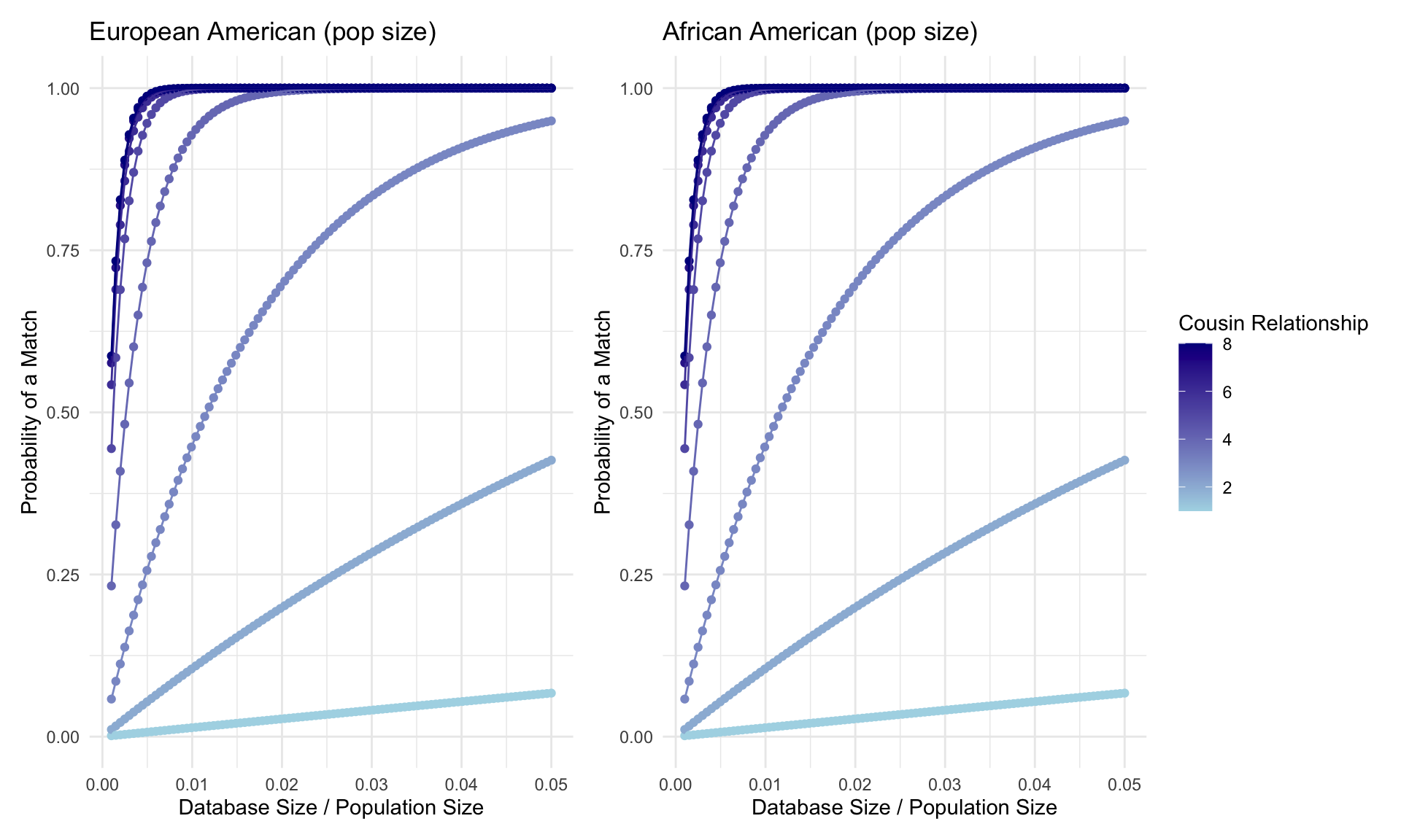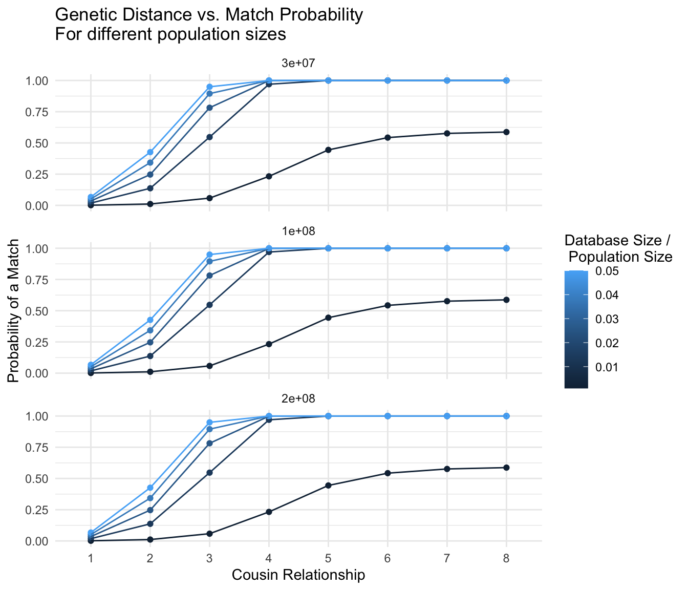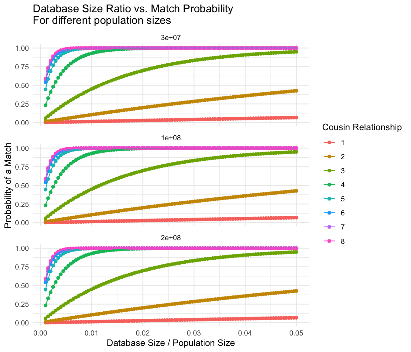 This code generates four line plots that show the relationship between population size, database size, and the probability of finding a genetic match for different degrees of relatedness (1C, 2C, 3C, 4C).