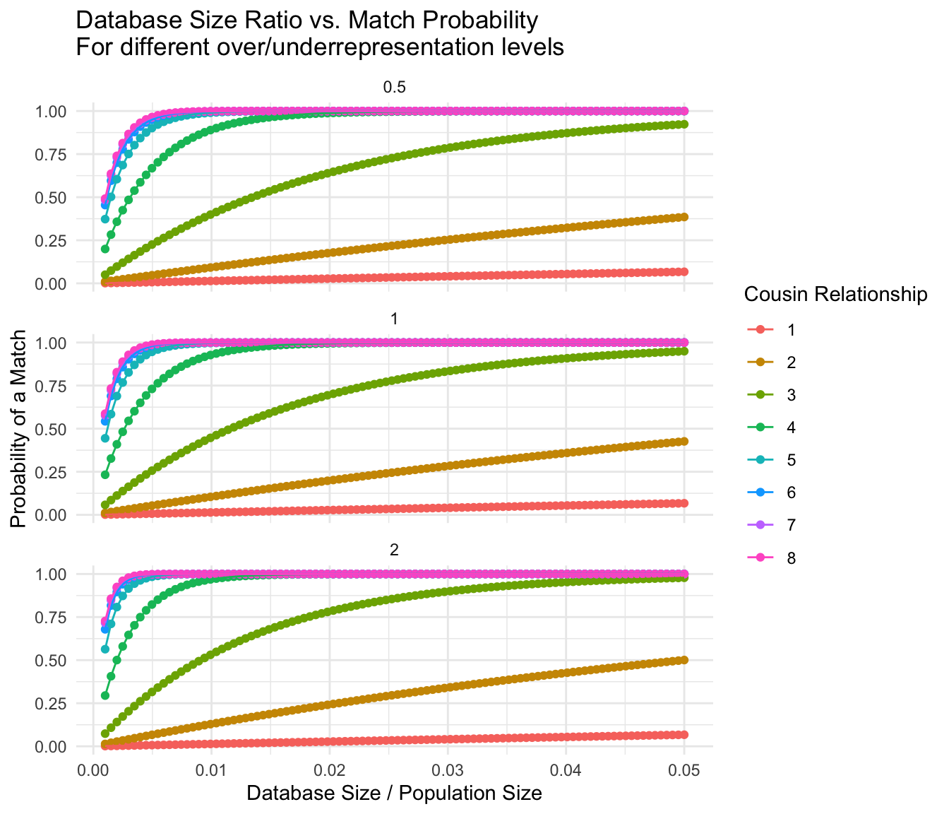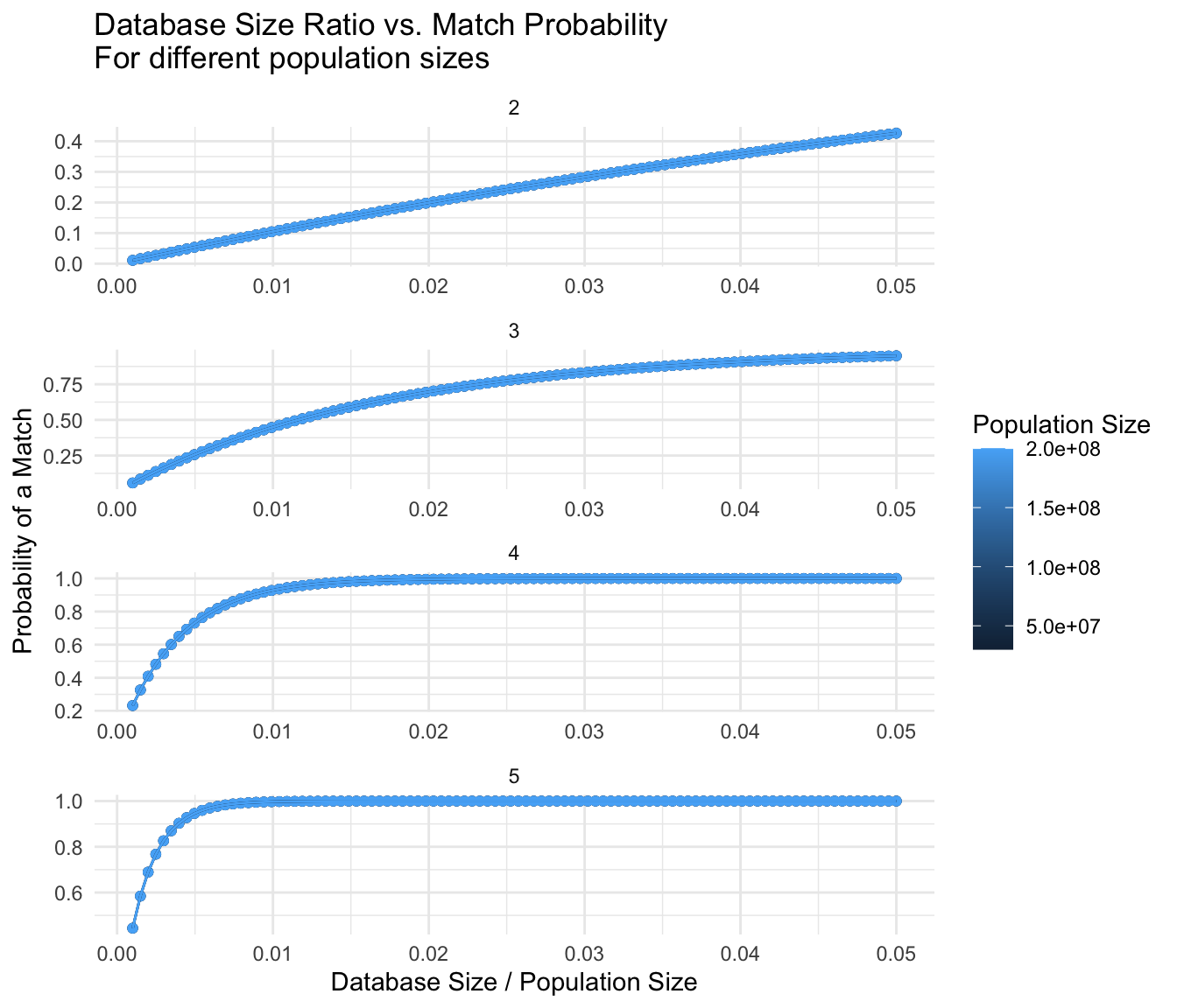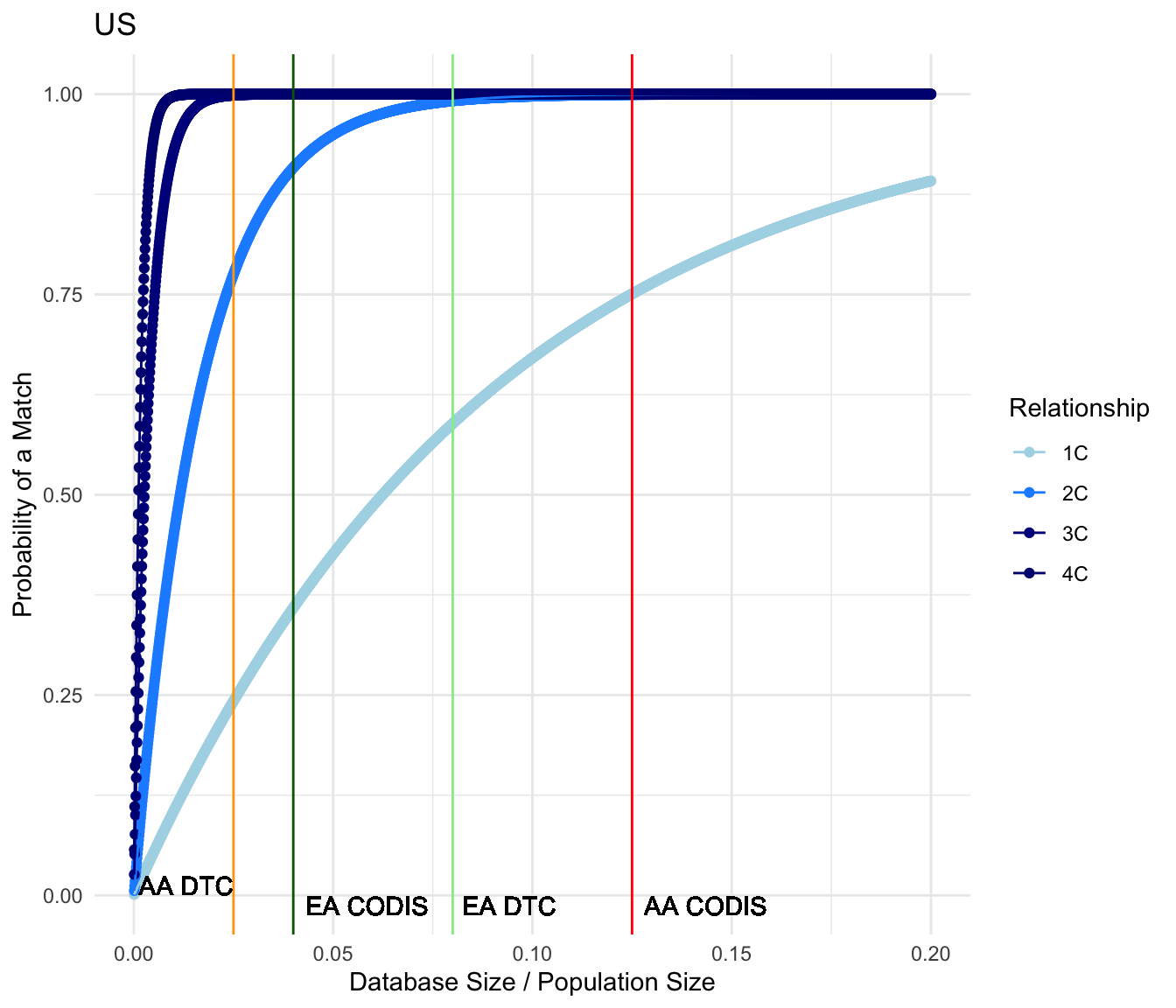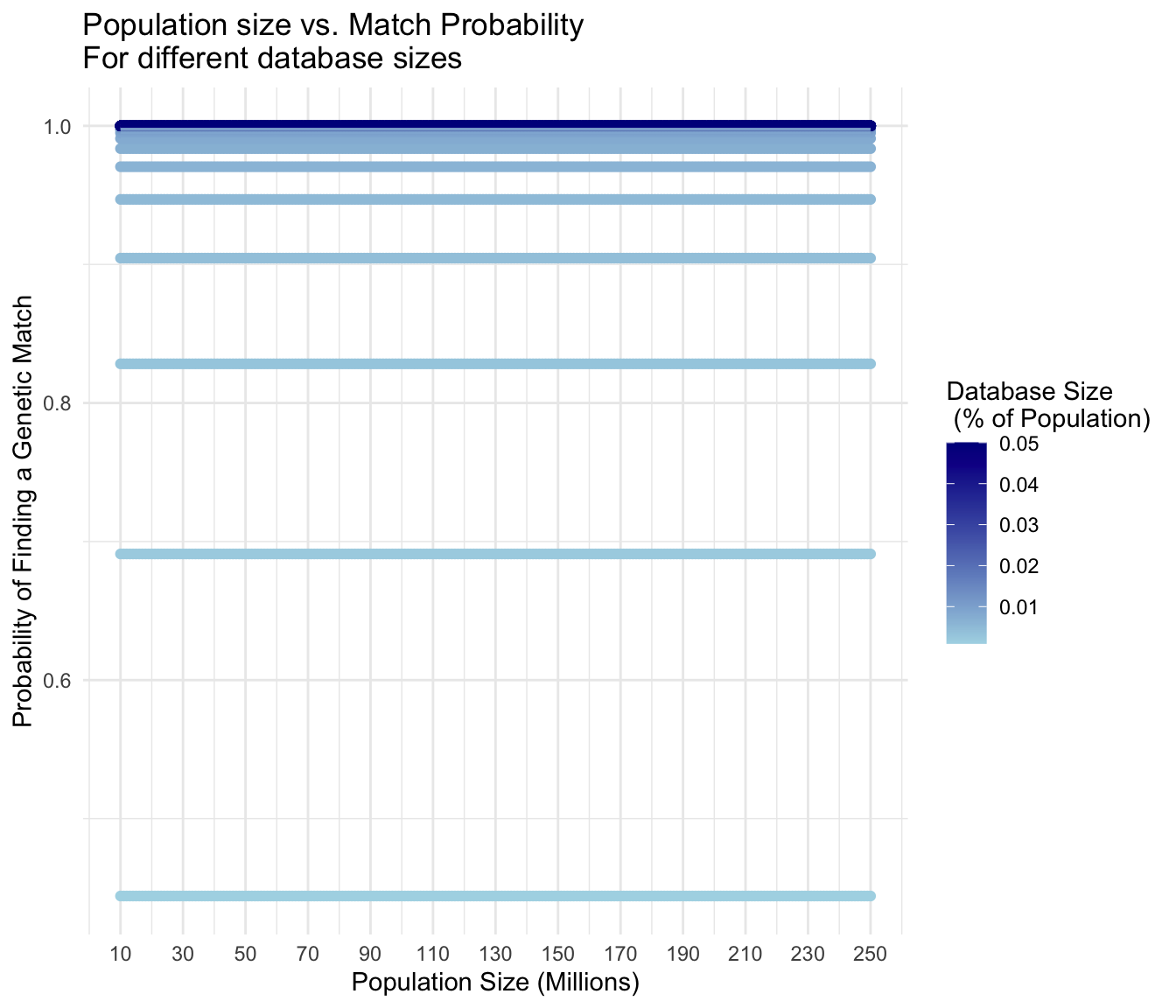 This code generates four line plots that show the relationship between population size, database size, and the probability of finding a genetic match for different degrees of relatedness (1C, 2C, 3C, 4C).