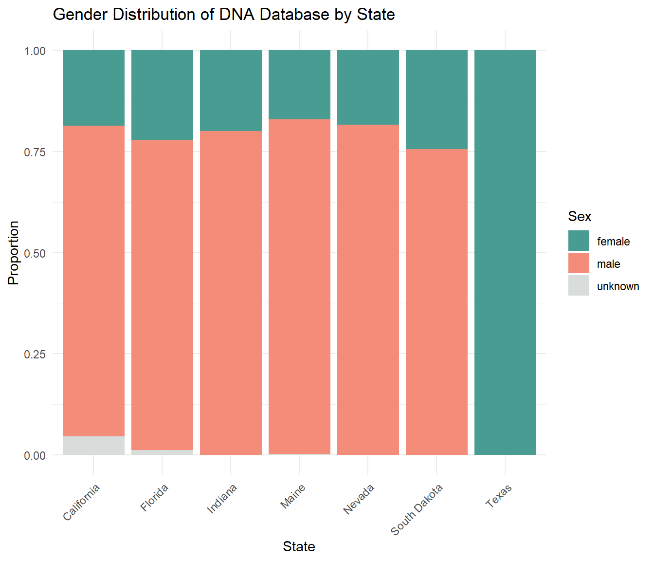 The following bar chart shows the gender breakdown of the state DNA databases.