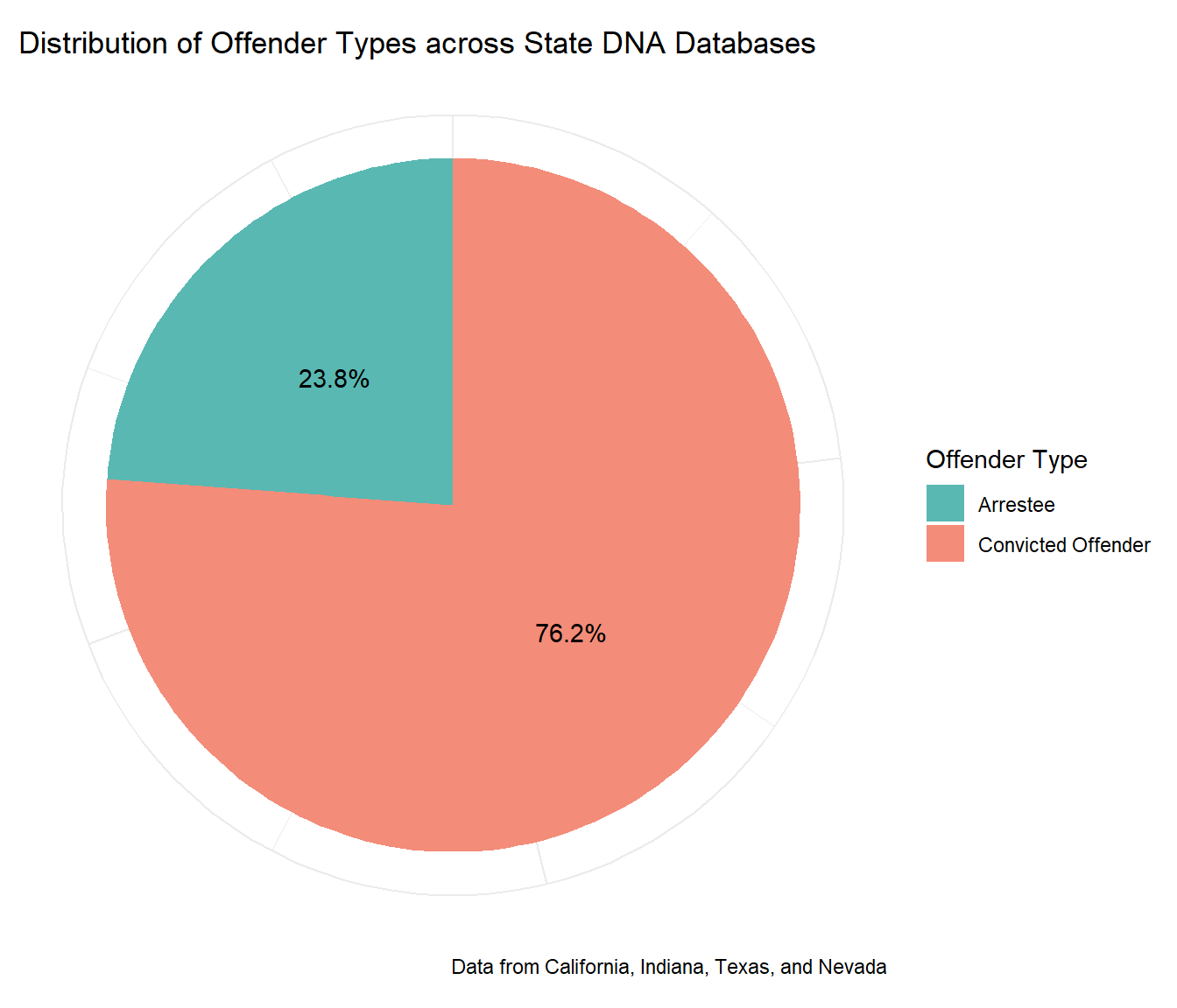 The following pie chart shows a summary of the proportions of arrestees and convicted offenders in the state DNA databases.