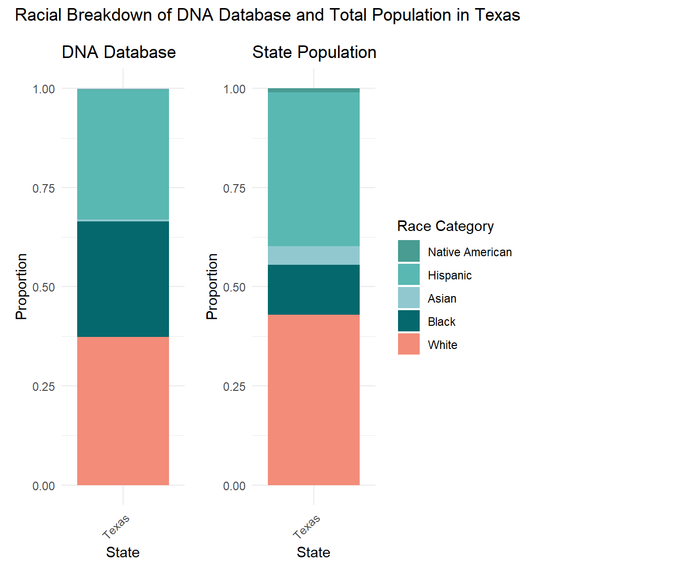 Despite White Americans usually making up the majority of the population in the database, there is still a significant disparity present in this data. Comparing this to a graph of the racial breakdown of the total population in each of these states uncovers that Black Americans and other people of color are over represented in their state’s database.