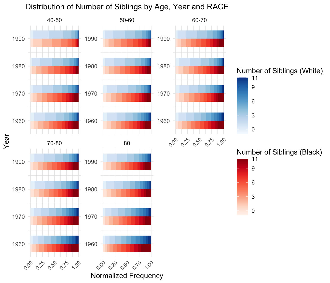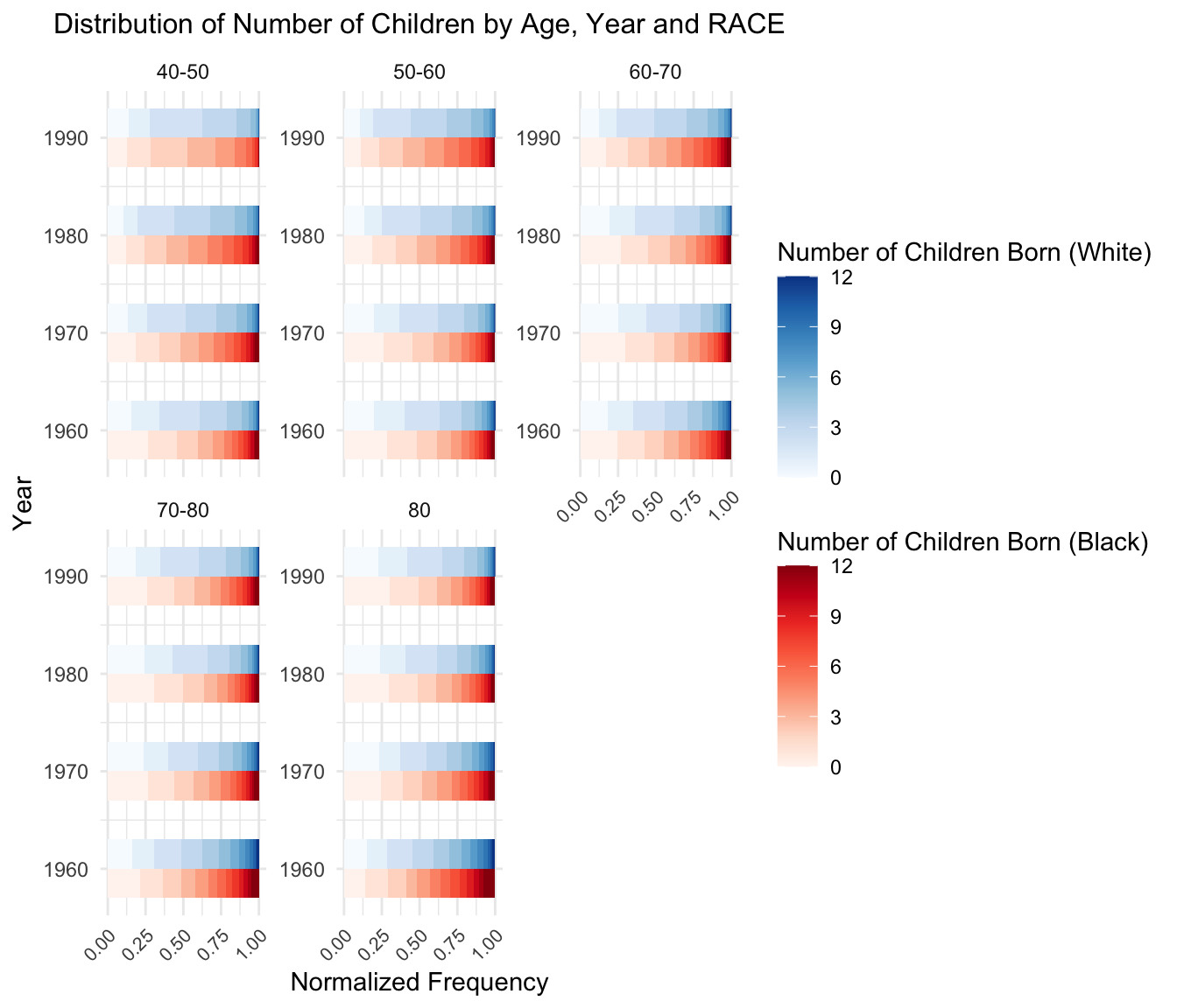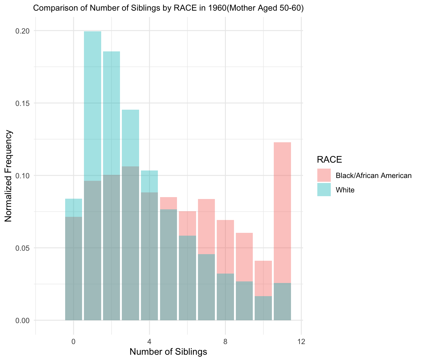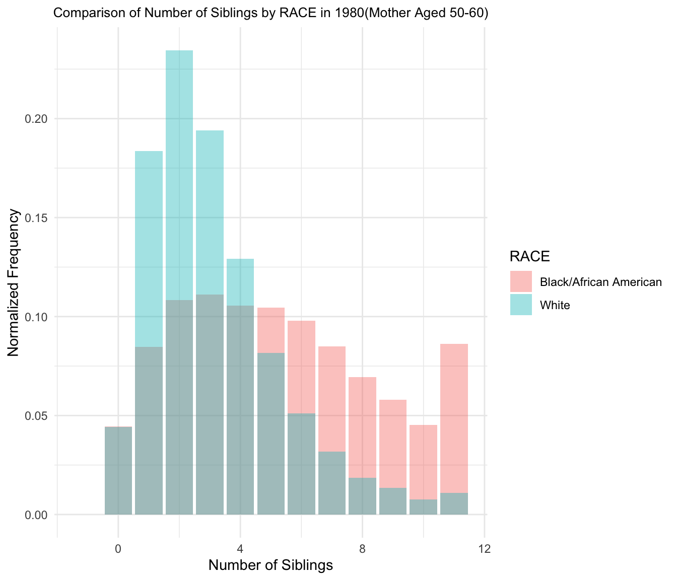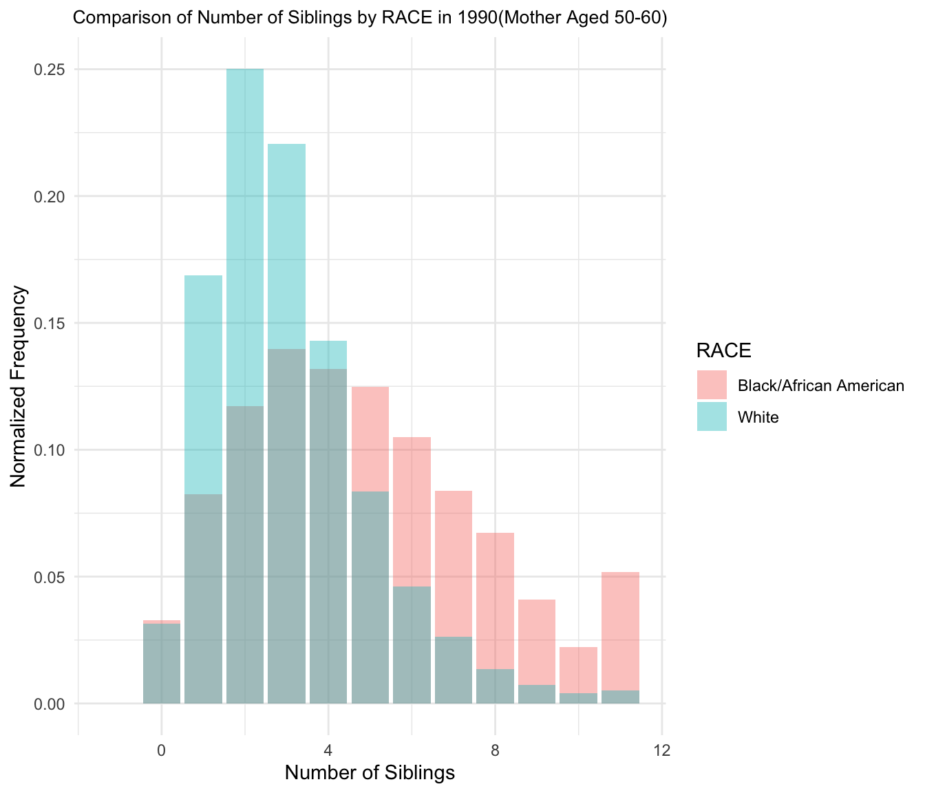 Here, we are trying to create frequency tables for each race to show the number of children born, the number of mother who has “chborn_num” children, the number of sibling, and the number of individuals who has “n_sib” siblings.