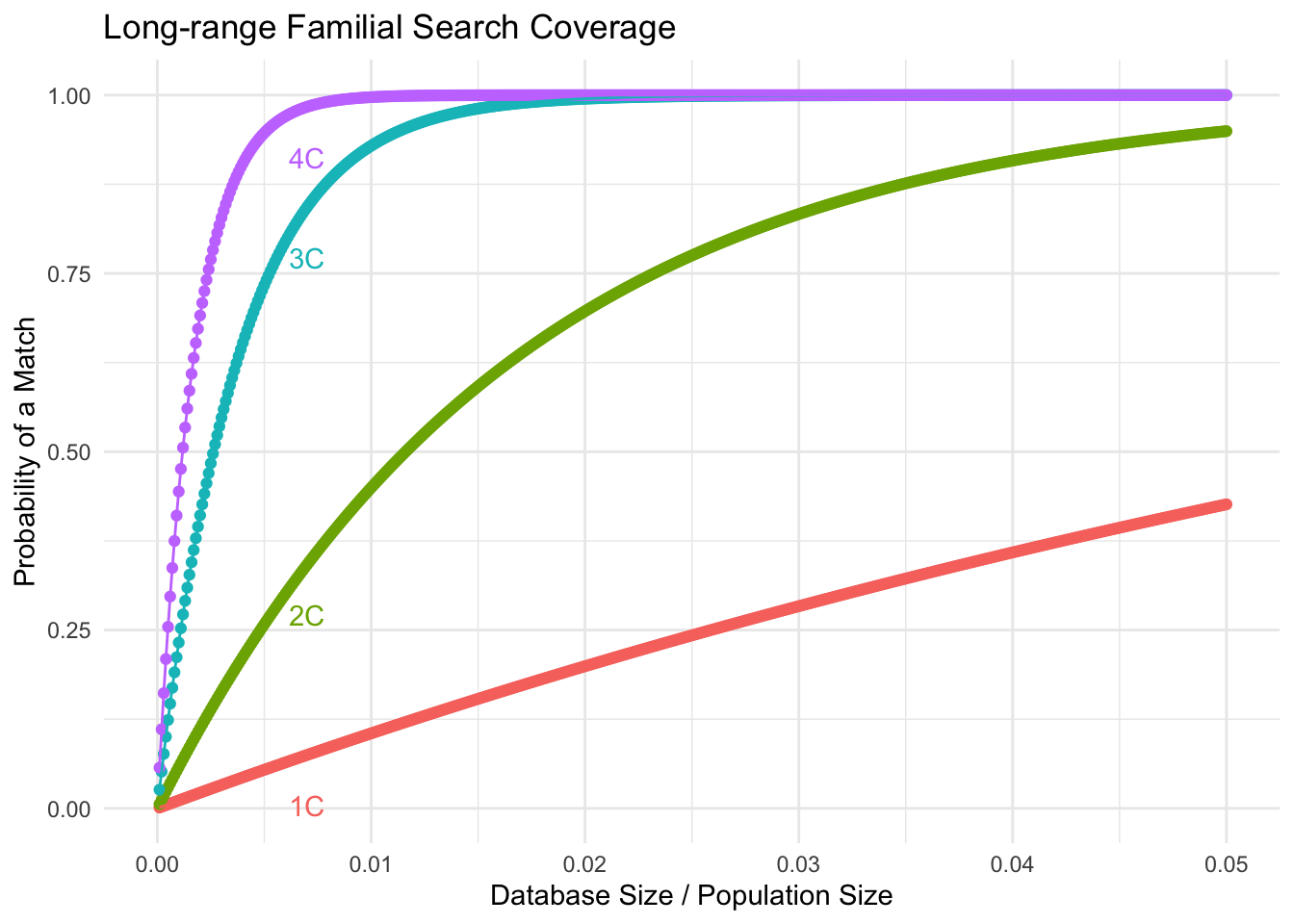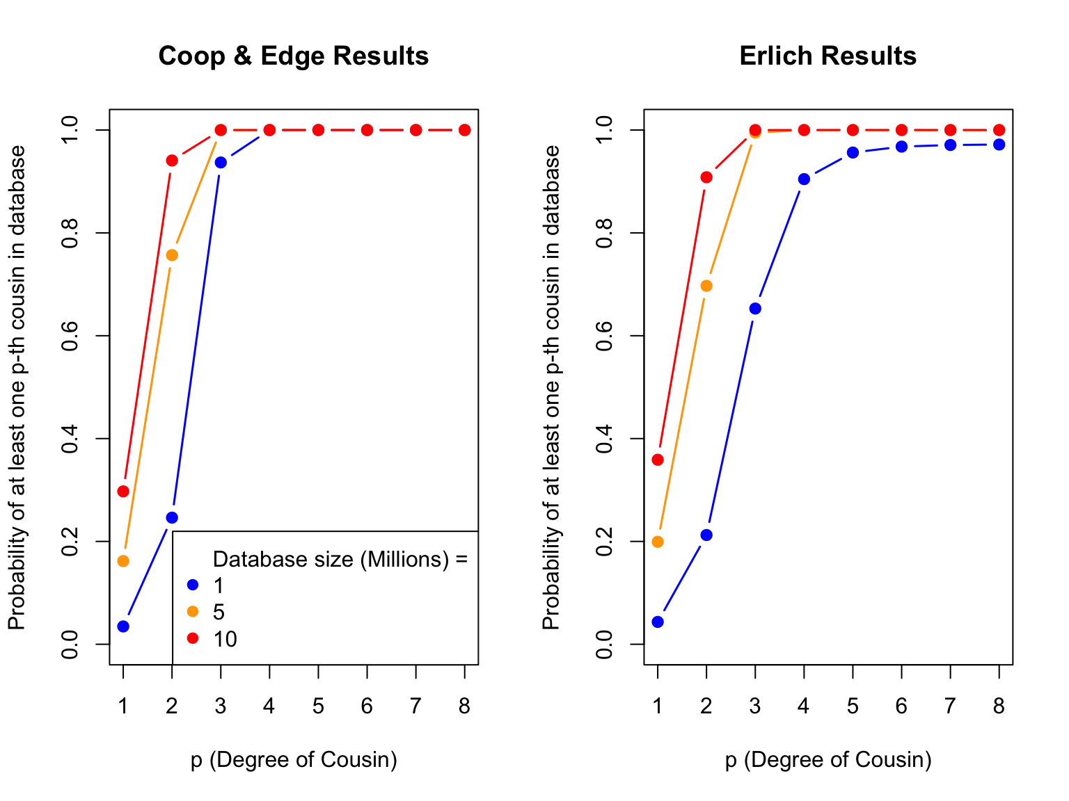 Coop & Edge (2019) use a population genetics approach to estimate the likelihood of finding a genetic relative in a database. They assume that two individuals are related if they share a certain number of genetic blocks, which is determined by the degree of relatedness (e.g. first cousin, second cousin, etc.). Using this assumption, they calculate the expected number of blocks shared between two individuals of a given degree of relatedness based on the size of the genetic database and the population size. They then uses the Poisson distribution to estimate the probability of finding at least one relative of a given degree of relatedness in a database of a certain size.